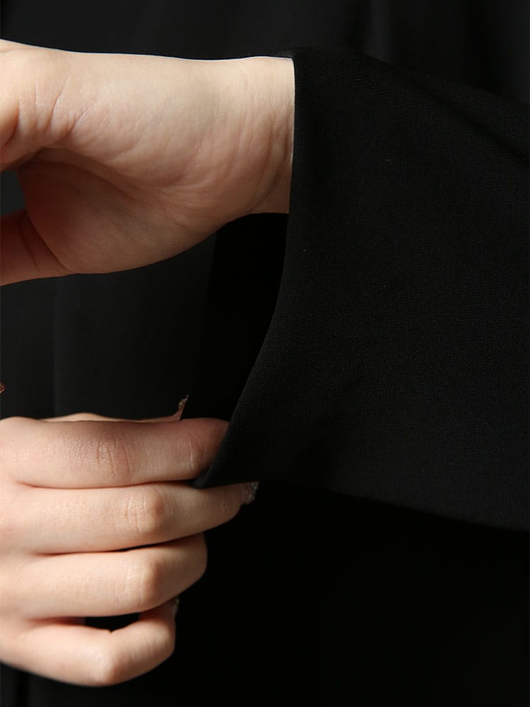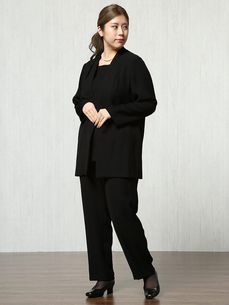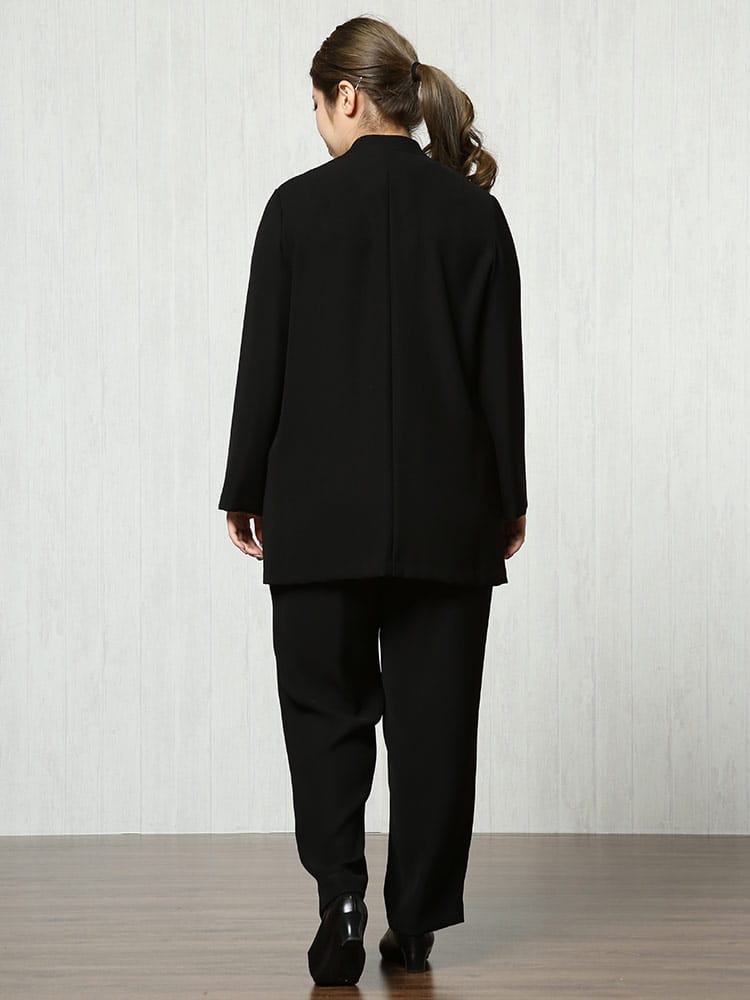 ストレッチが効いた楽ちんフォーマルの前開きファスナー ロングパンツ アンサンブル 礼服です。立体パターン、美シルエット、ゆとりのある設計の着やすさ、幅広いサイズの3Dテクノロジー。着やすさとデザイン性を兼ね備えた大人のブラックフォーマルです。