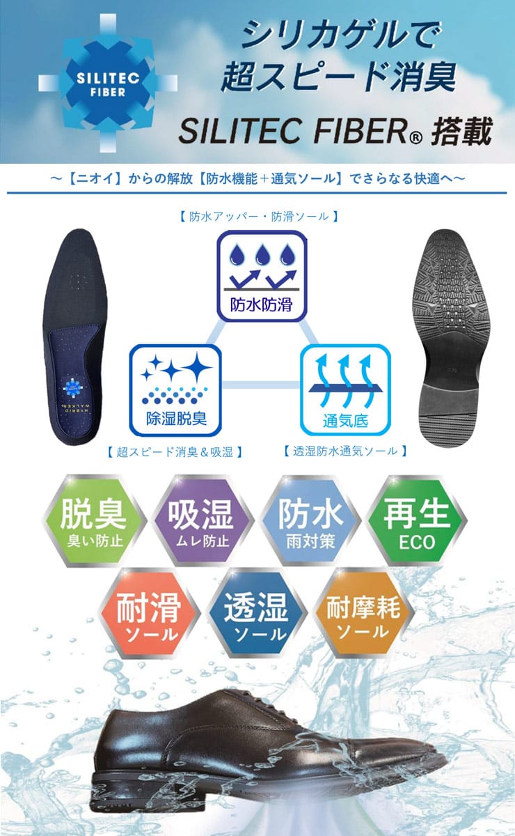 HYBRID WALKER の消臭、防水機能を搭載した内羽根ストレートチップのビジネスシューズです。特筆すべきは、インソールの再生機能効果が持続すること。さらに、ソールには透湿防水機能があり、靴内の湿気を排出しつつ外部からの水の侵入を防ぎます。脱臭効果と吸湿性も備え、靴内を快適に保ちます。洗練されたデザインと高機能性を両立した、ビジネスシーンで活躍する一足です。
