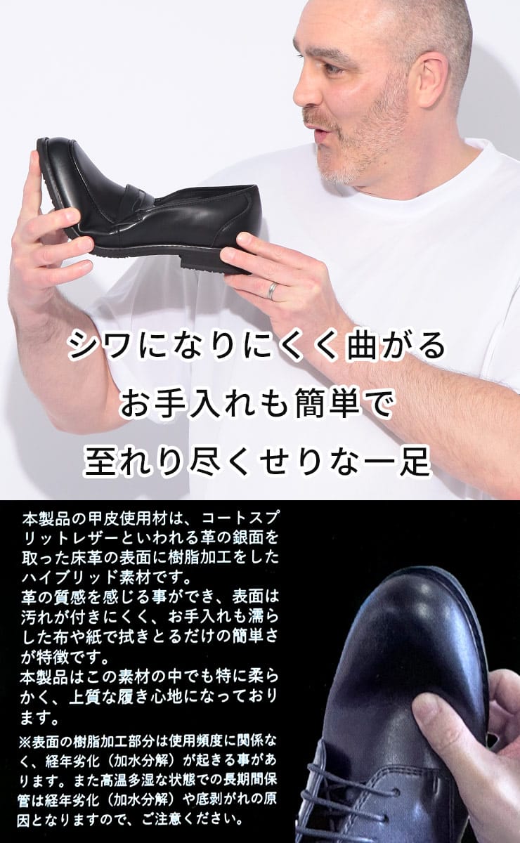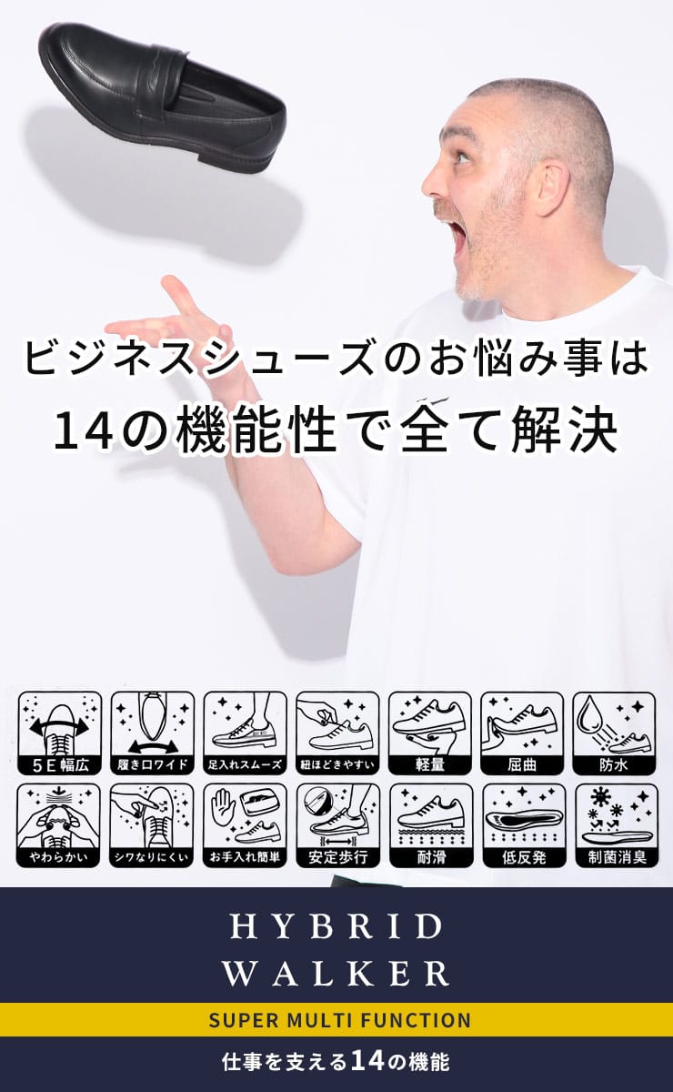 HYBRID WALKERのソフトレザーコインローファーは、ゆったりとした5Eの幅広設計で、足への負担を軽減し、快適な履き心地を実現します。上質なソフトレザーを使用しており、足馴染みが良く、上品な印象を与えます。コインローファーならではのトラディショナルなデザインは、ビジネスシーンからカジュアルスタイルまで幅広く対応。歩きやすさを追求した設計で、デイリーユースに最適な一足です。