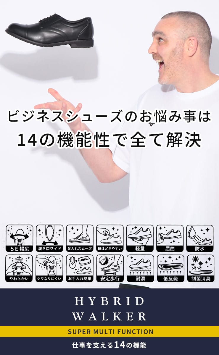 仕様 :幅広5E / 防水 / 軽量 / 耐滑 / 低反発 / 制菌消臭 / シワになりにくい