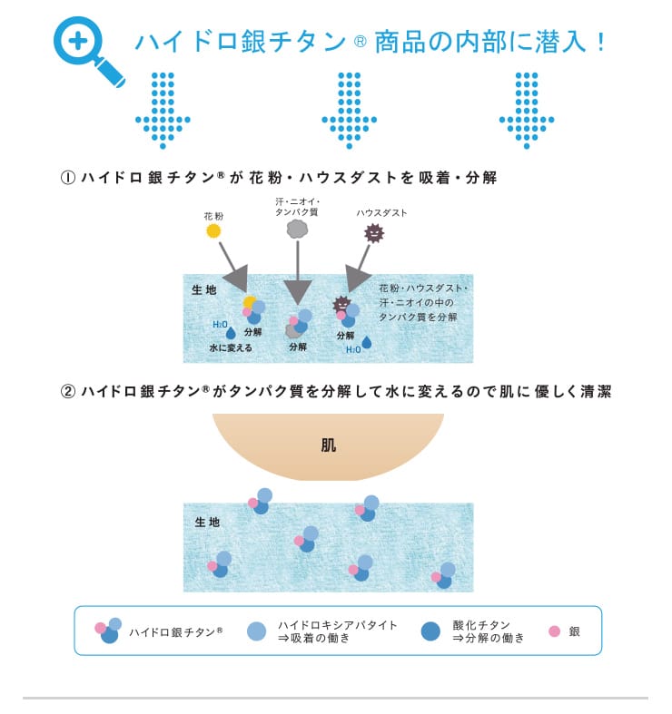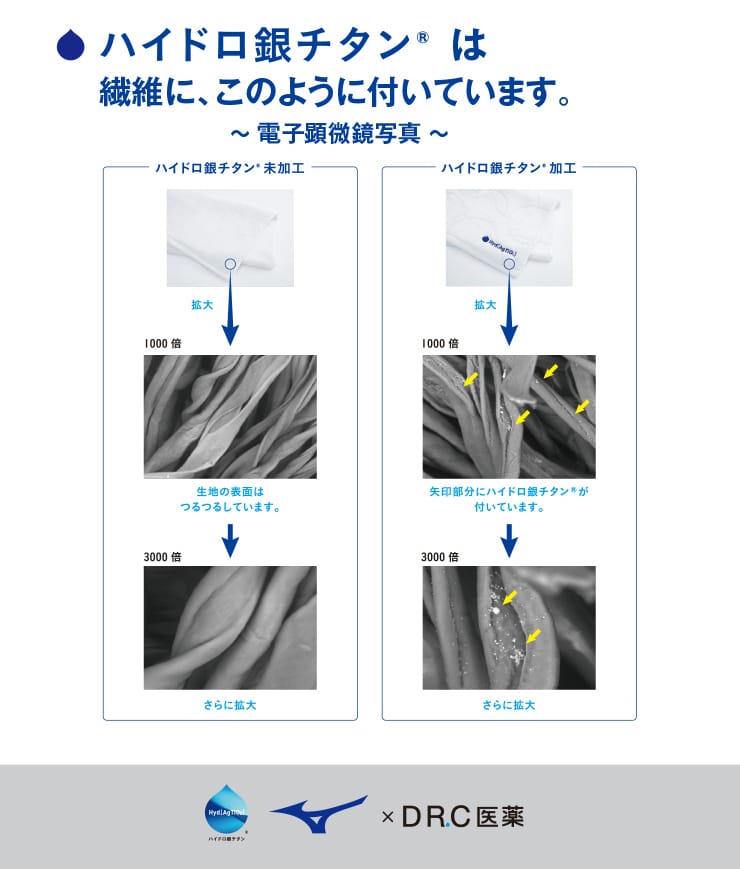 吸汗速乾性に優れ、汗のニオイの元を分解するミズノのハイドロ銀チタンアンダーウェアの登場です。ハイドロ銀チタンは汗のニオイの元となる不衛生タンパク室を分解するので、汗など、ニオイが気になるシーンでも清潔で吸汗速乾性にも優れているのでウェア内を快適な状態に保ちます。アクティブシーンやビジネスシーンのインナーとしてぜひおすすめしたい一枚。