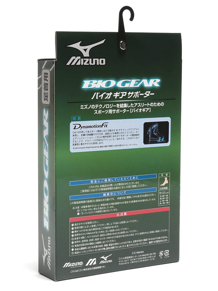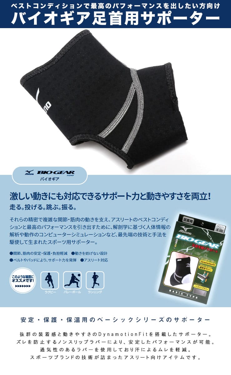 ミズノのテクノロジーを結集したアスリートのためのスポーツ用サポーター「バイオギア」。フィット感に優れ、ズレにくいDynamotionFit。通気性に優れ軽量な通気性ラバー。内部の一部にはズレにくいノンスリップラバーを使用。左右兼用で一枚入り。