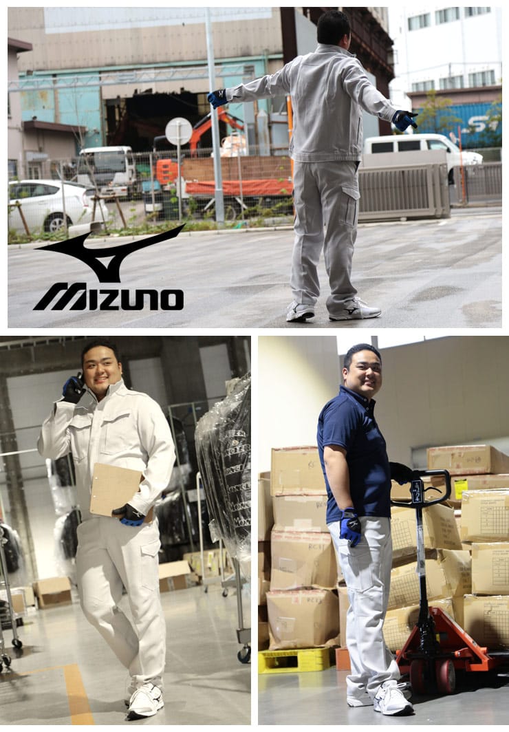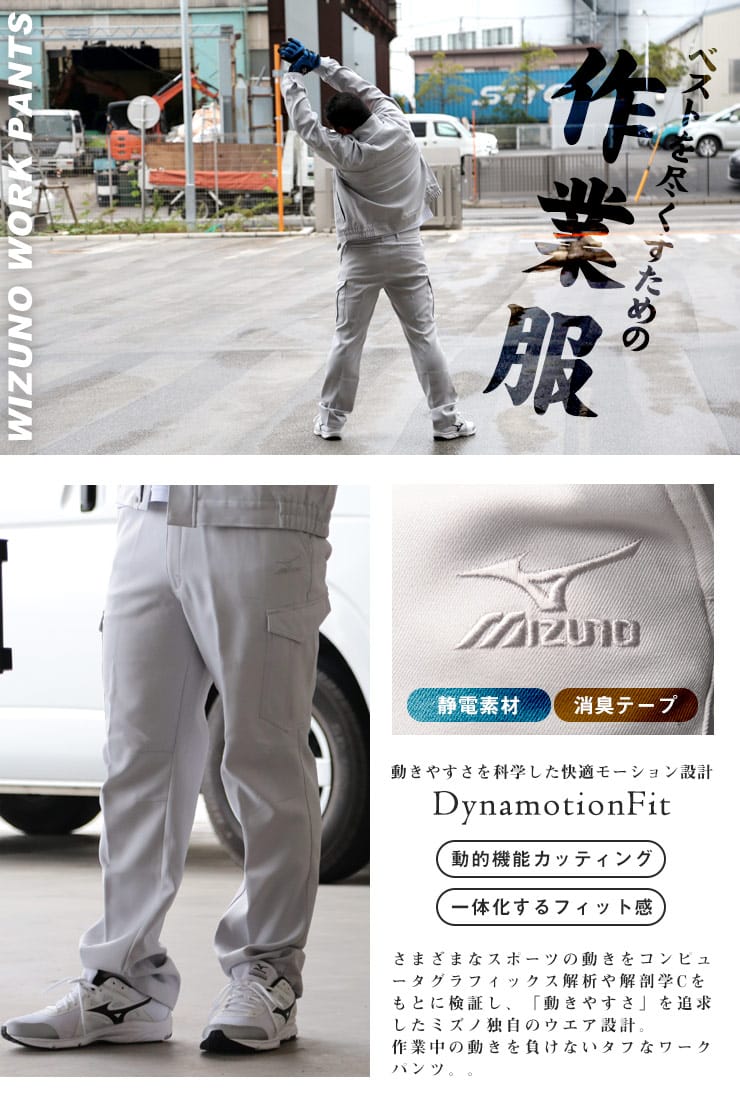 MIZUNOだから出来た3次元フィットワークパンツ。動きやすさを科学した快適モーション設計のDynamotionFit。静電気の発生を低減し快適性を高めた静電素材を使用。ニオイ成分に吸着し、中和することにより臭気を軽減する消臭テープ付き。動きやすさを追求したMIZUNO独自のワークウエアです。