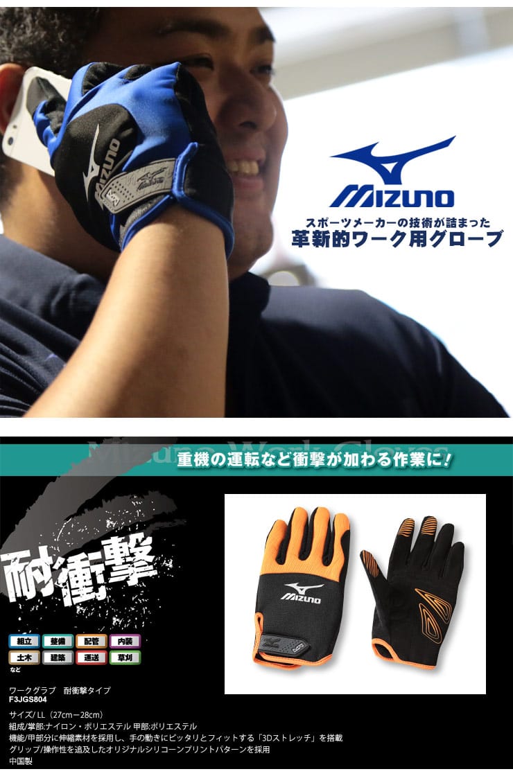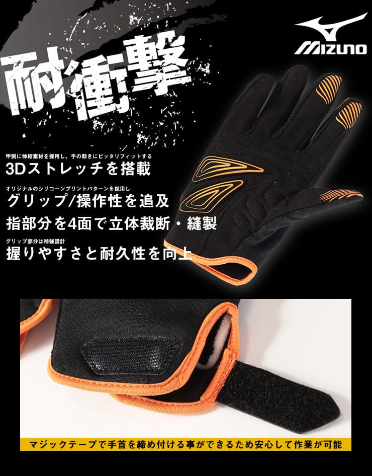 MIZUNOの3Dストレッチ ワークグラブ アンチショック グローブ。重機の運転など衝撃が加わる作業に。甲部分に伸縮素材を採用し、手の動きにピッタリとフィットする「3Dストレッチ」を搭載。グリップ、操作性を追及したオリジナルシリコーンプリントパターンを採用。組立、整備、配管、内装、土木、建築、運送、草刈などにお使いいただけます。