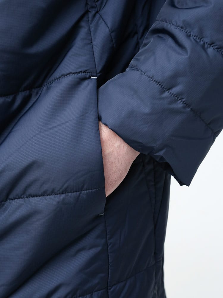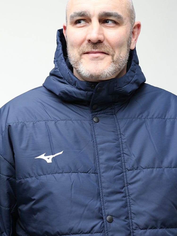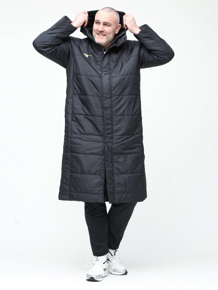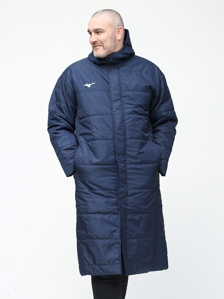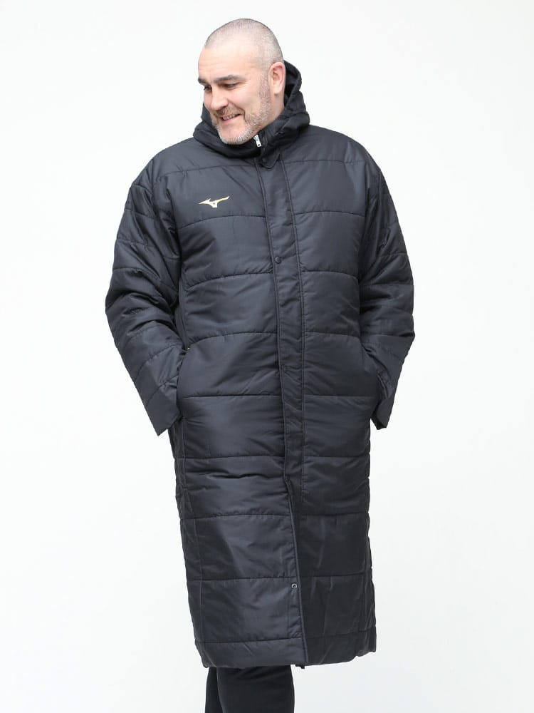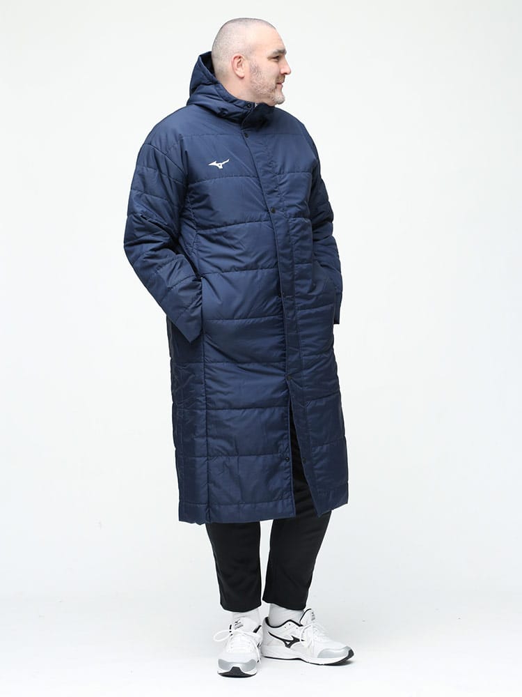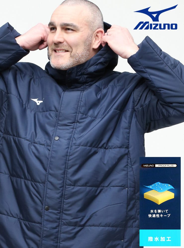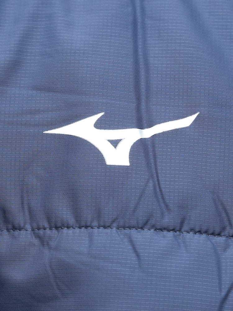 撥水加工を施したMIZUNOの中綿 ロングコートです。右胸のロゴプリントがポイント。水を弾いて快適性をキープする撥水加工で悪天候時も安心です。中綿入りで保温性抜群。ロング丈で身体を包み込むので寒い季節のアクティブシーンに最適な一着です。