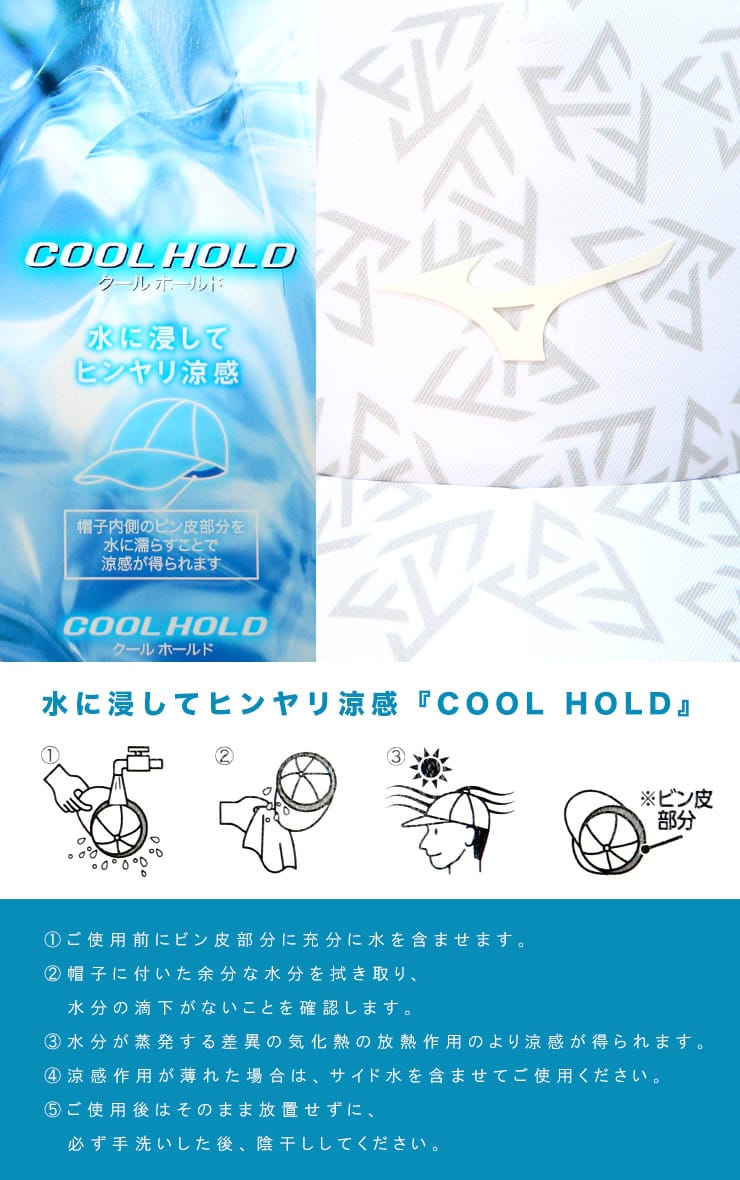 MIZUNOのメッシュクールホールドロゴキャップです。帽子内側のビン皮部分を水に濡らすことで涼感が得られます。真夏のゴルフを快適に!
