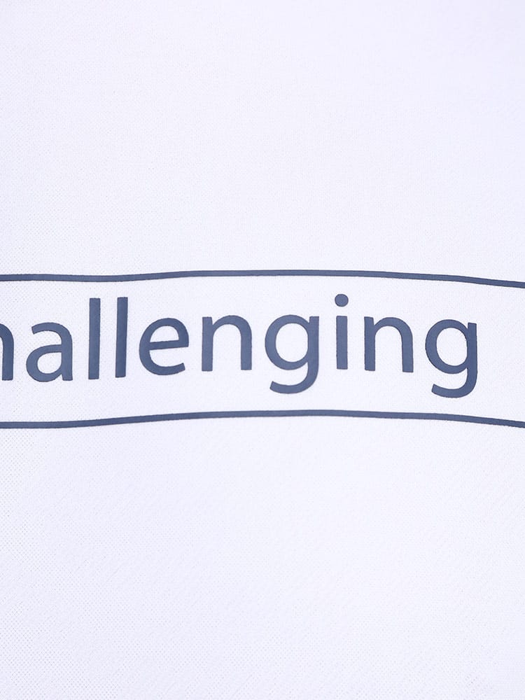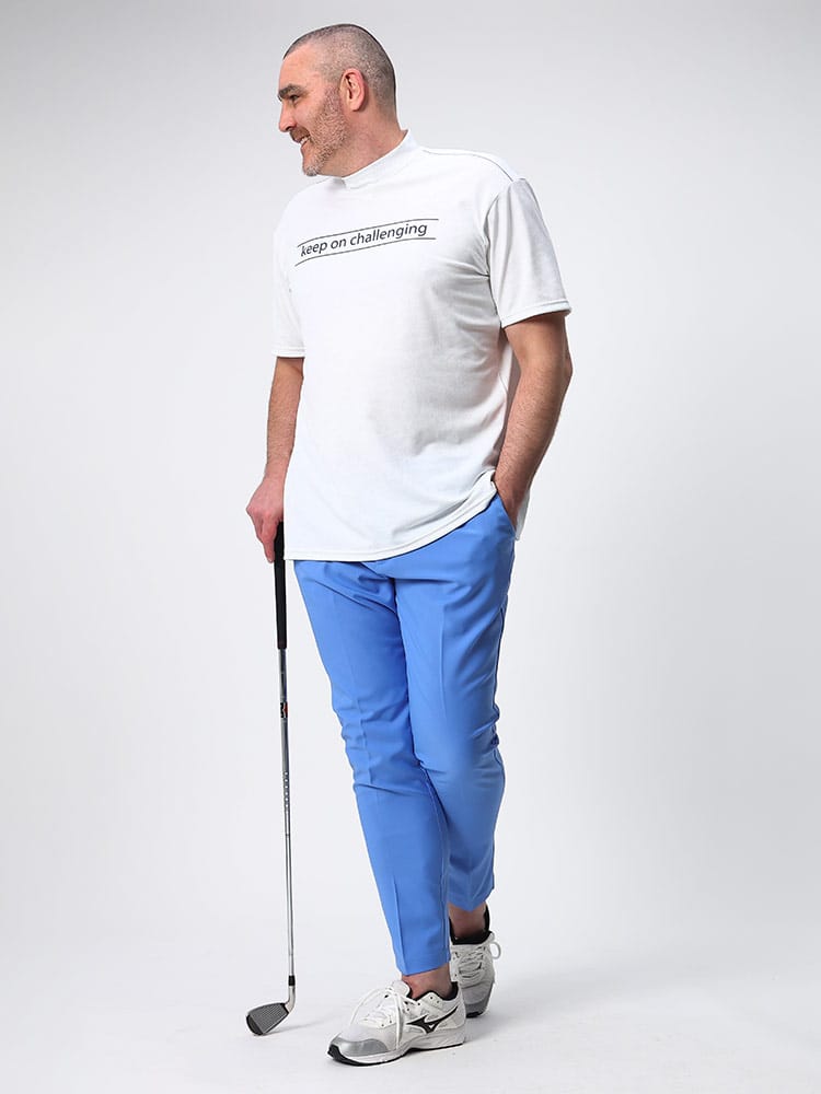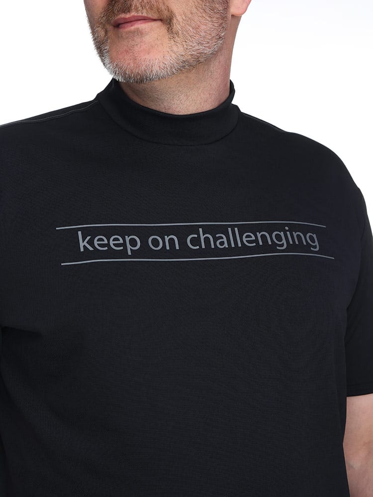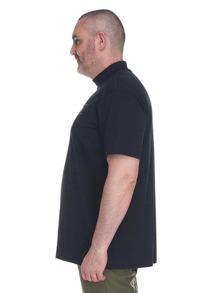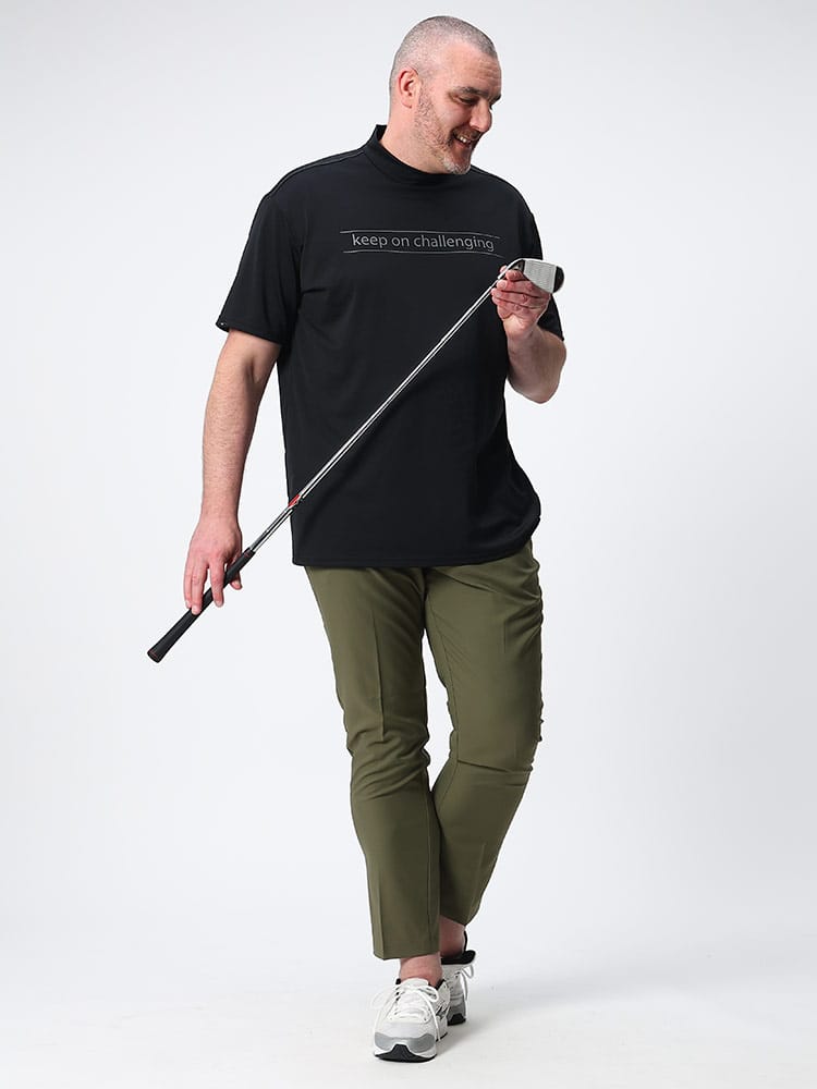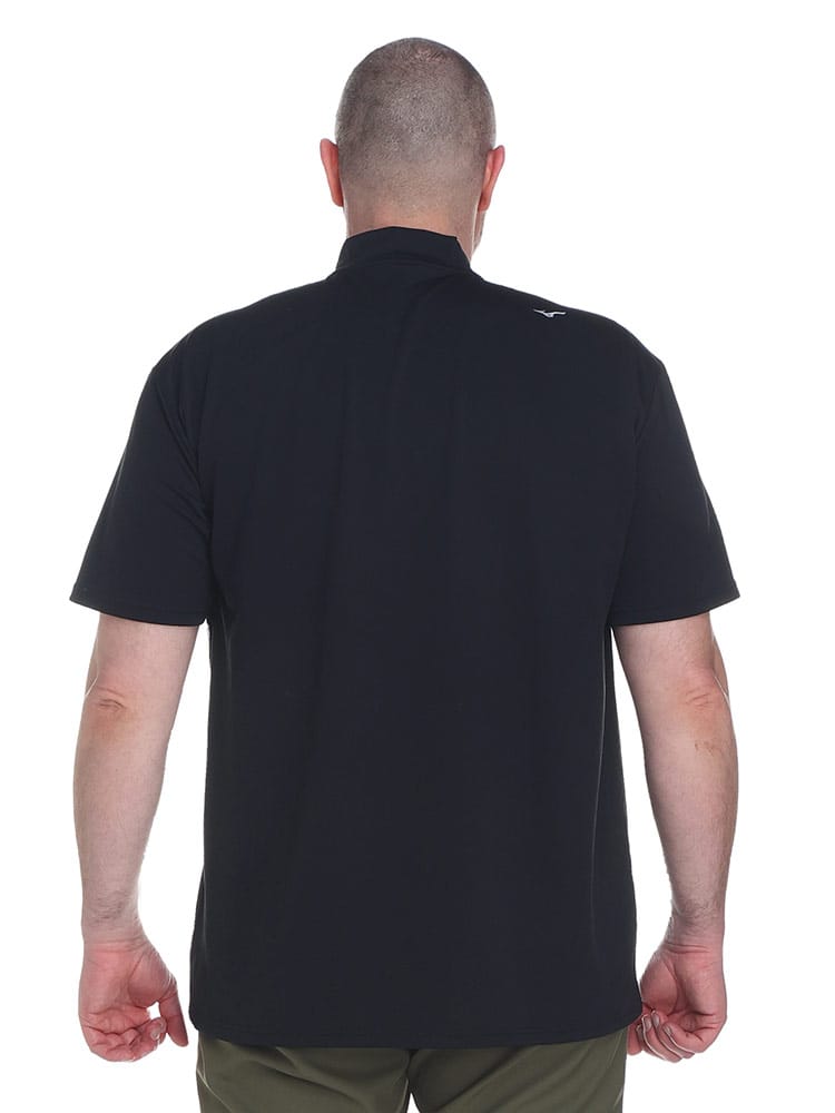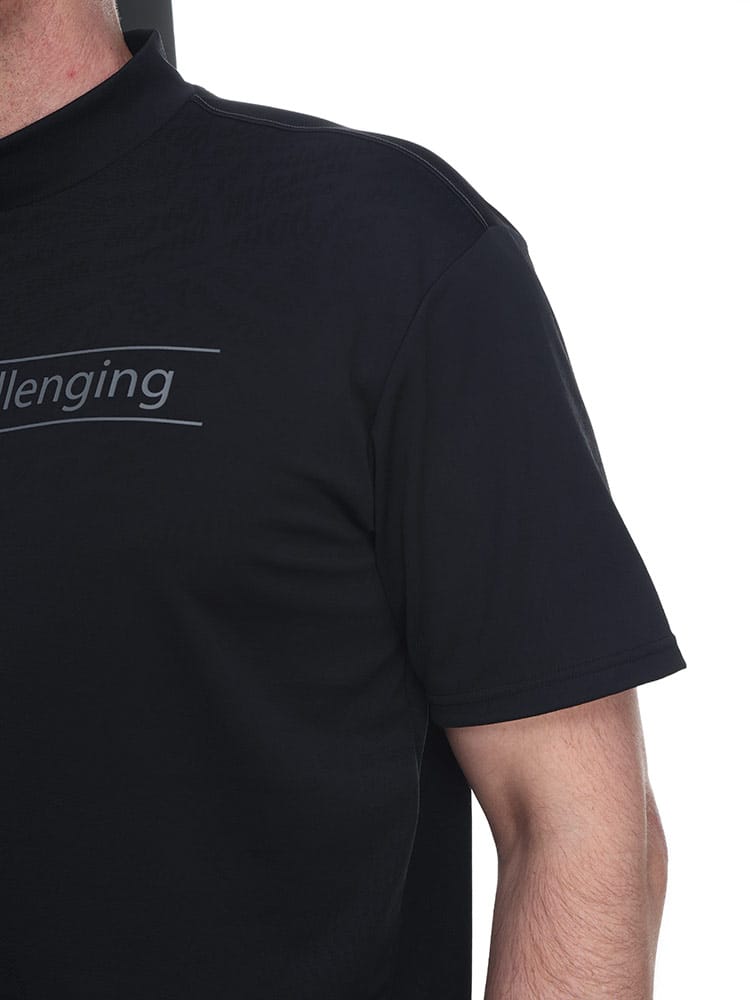 吸汗速乾機能を持ったダブルジャガード素材を使用した半袖モックネックシャツ。伸びて動きやすく、汗を素早く吸収、拡散。地柄ジャガード柄に胸のプリントと肩のチェーンステッチがかっこよく、機能にプラスしてデザイン性もある一枚です。