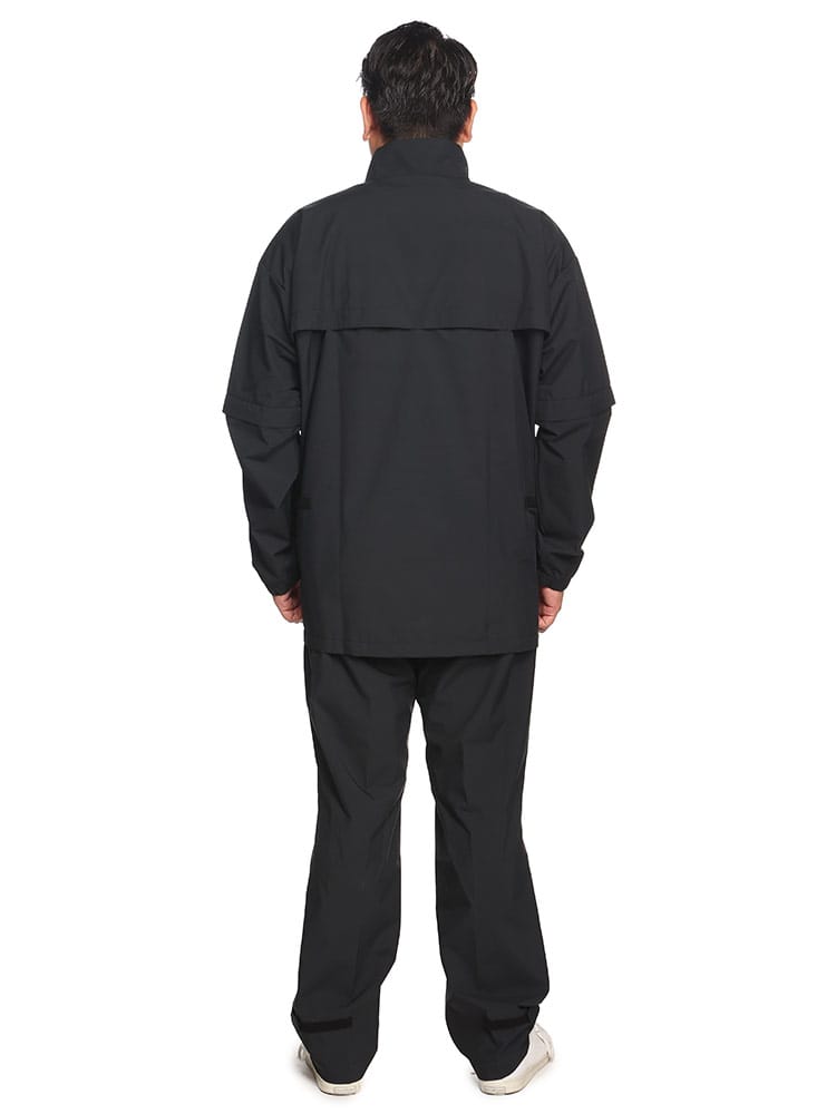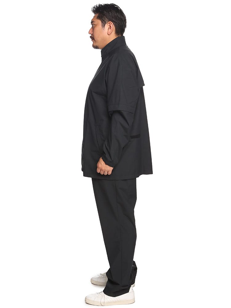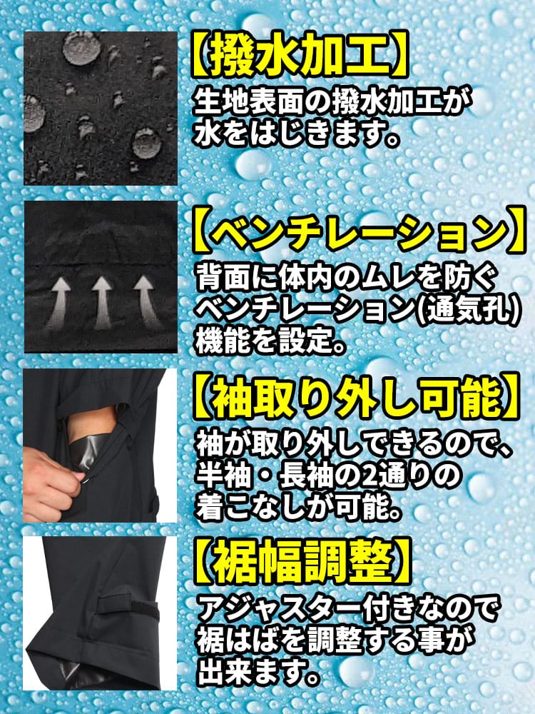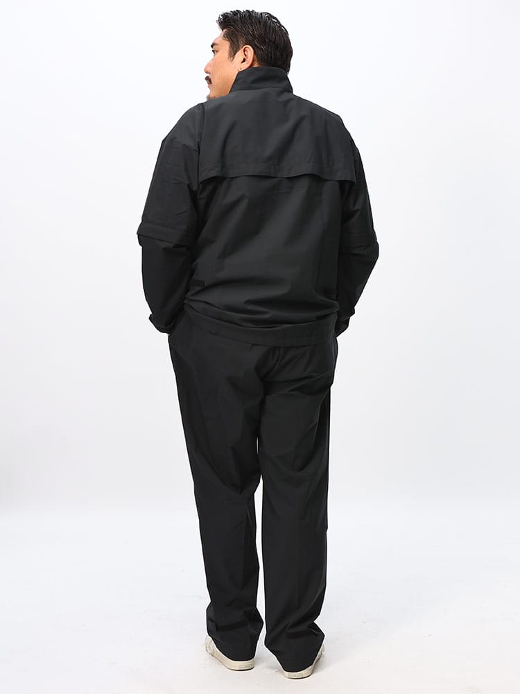仕様 :[上衣]ポケット×2つ / シングルジップ / 袖着脱可能 / 背面通気孔あり / [下衣]ポケット×3つ / ウエスト調節コード / ジップフライ / ウエスト・裾部マジックテープアジャスター / セットアップ
