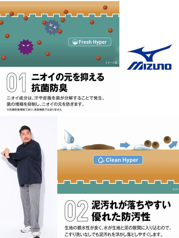 高機能と品格を両立したドライポロ。MIZUNO(ミズノ)から、スポーツとビジカジを繋ぐPure Hyper ドライ長袖ポロシャツが登場。トレーニングウェアの機能性を持ちながら、ボタンダウン仕様で清潔感のあるスタイルを実現します。素材は、速乾性に優れたポリエステル100%。汗をかいてもすぐに乾き、常にサラリとした快適な状態をキープします。さらに、抗菌・防臭・防汚・消臭という驚異の四重機能により、汗の悩みから解放され、一日中クリーンな着心地が持続します。胸元にはワンポケットとロゴ刺繍を配置し、シンプルな中に洗練されたアクセントをプラス。きちんとした印象を与えるボタンダウンカラーは、ゴルフウェアやオフィスカジュアルにも最適です。大きいサイズでゆったりと着用可能。機能性、快適性、デザイン性を全て兼ね備えた、活動的な大人のためのユーティリティ・ポロです。