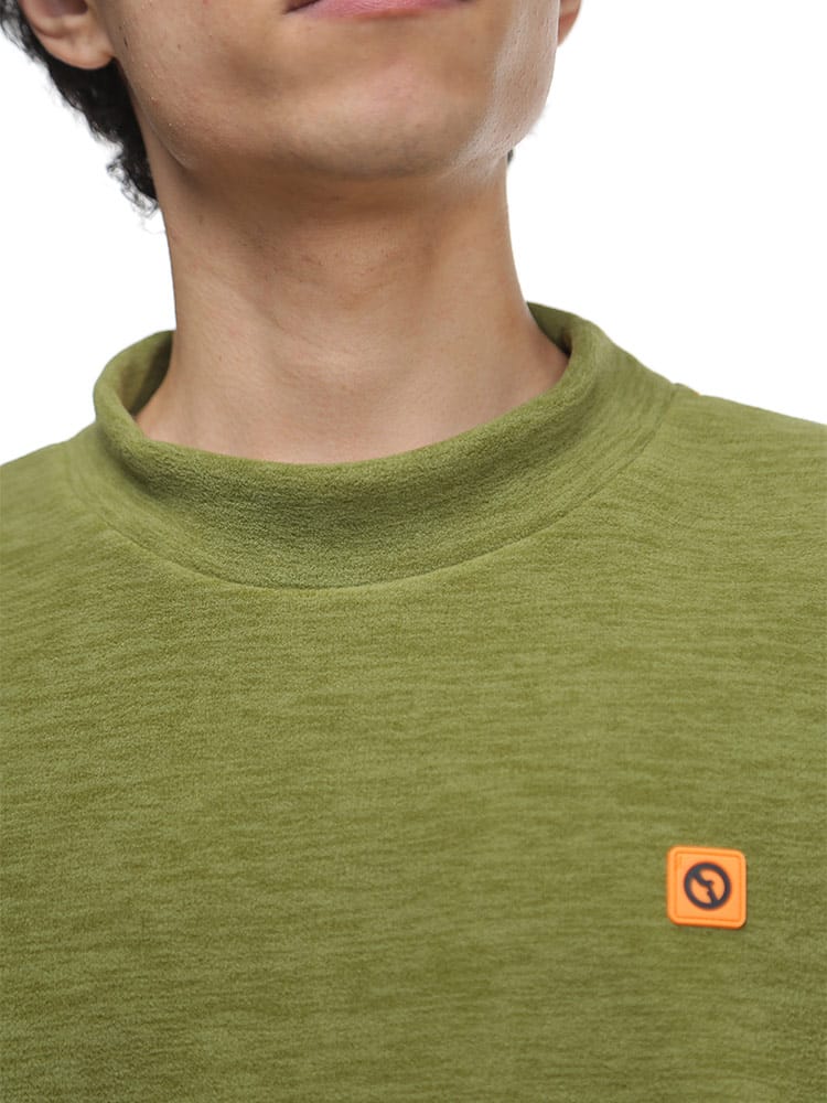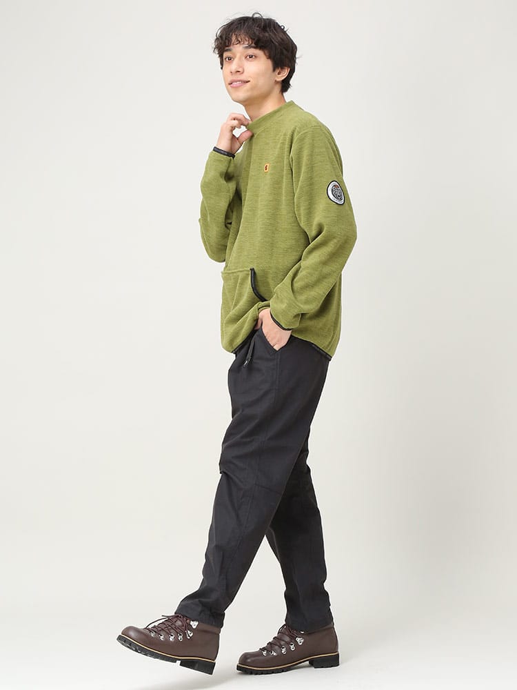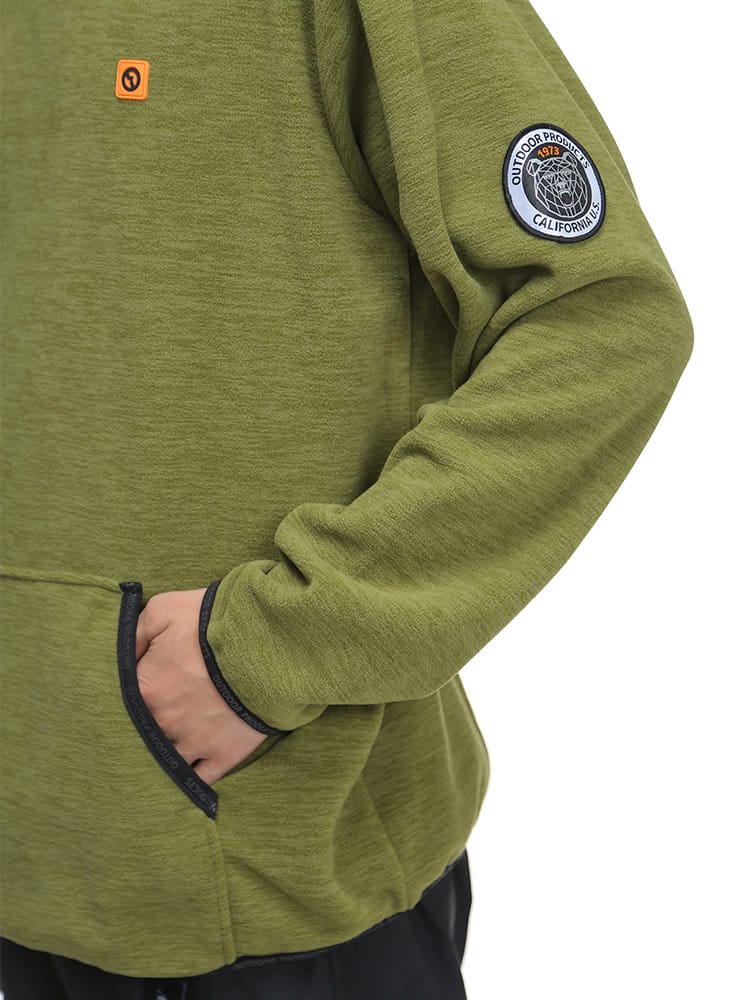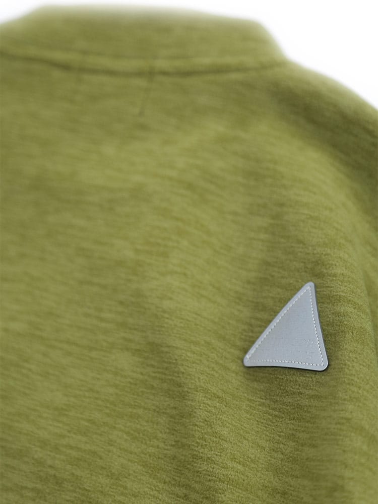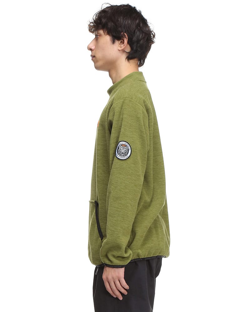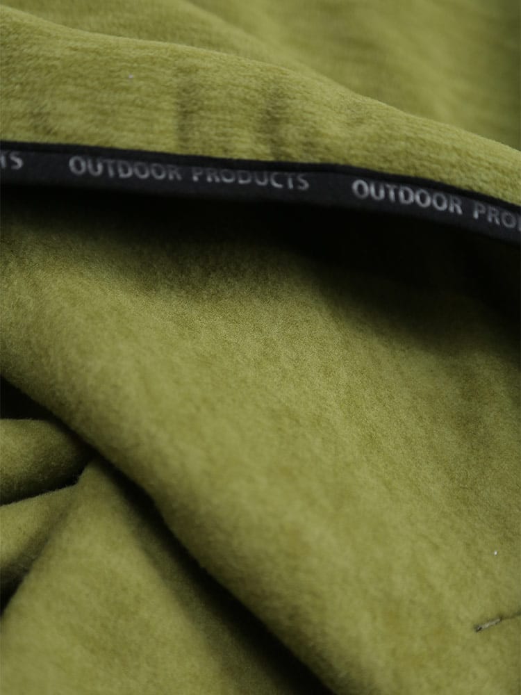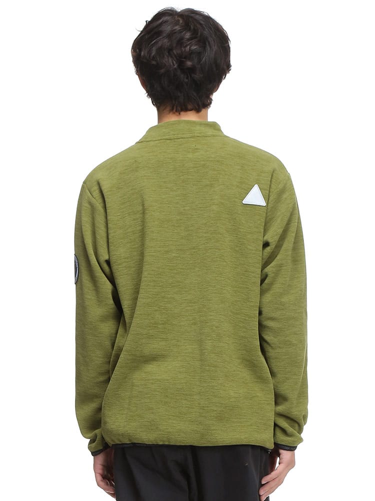 アウトドアプロダクツの杢フリース ハイネックトレーナーです。柔らかなフリースの素材感と裏起毛で温かな着心地のトレーナー。袖口と裾、フロントのポケット手入れ部分にブランドロゴパターンが流れるパイピングが施されていて引き締まったシルエットになっています。右背面に三角形のリフレクターが縫い込まれているので夜道などでも光に反射して安心度がアップ!