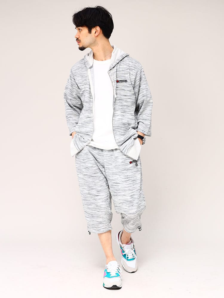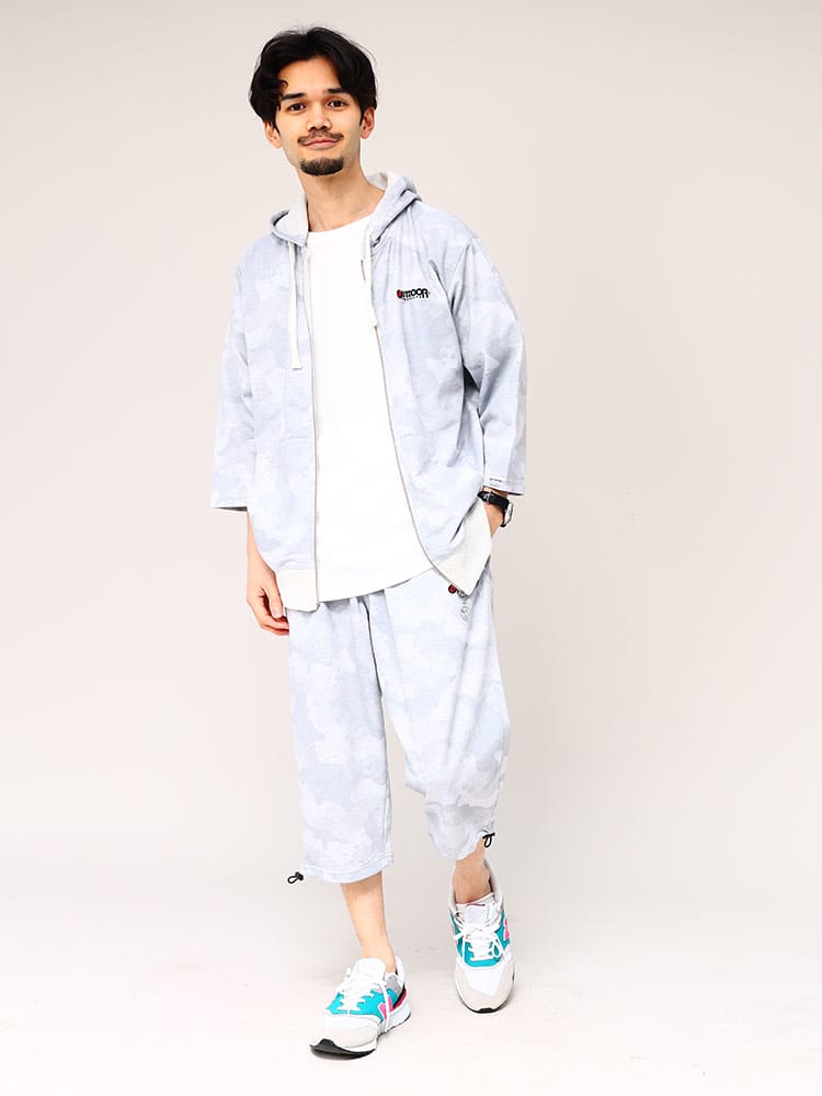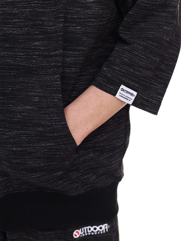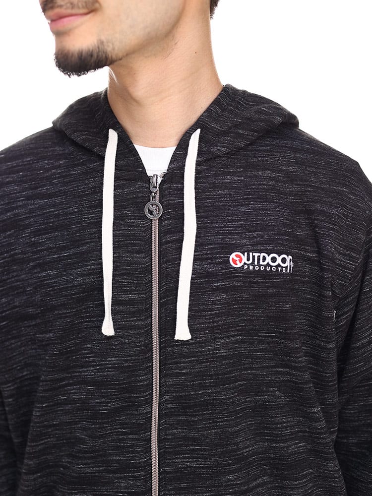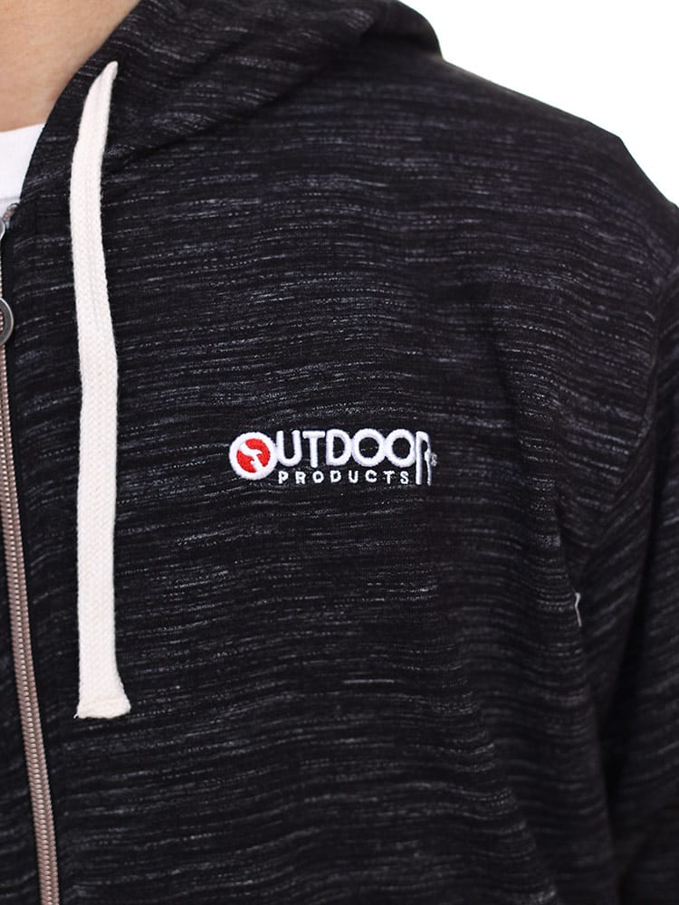 総柄デザインのOUTDOOR PRODUCTSのフード フルジップ 7分袖 パーカー。左胸にロゴ刺繍、左袖にロゴワッペンをあしらっています。フードのドローストリングにはワードプリントをデザイン。裾はリブデザイン。裏地は裏毛でサラッとした肌触りです。