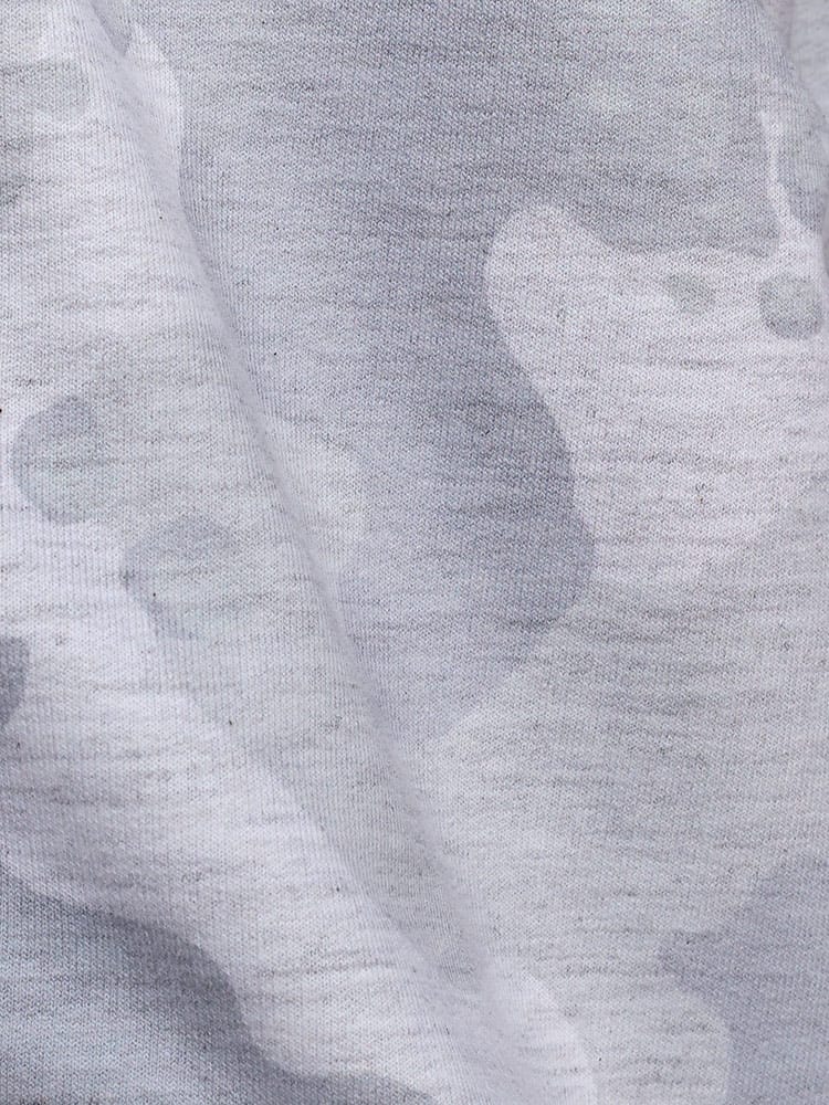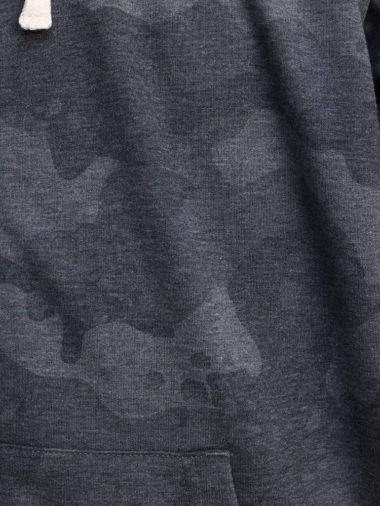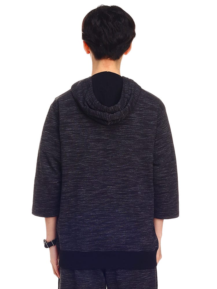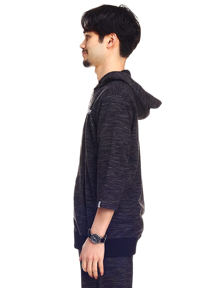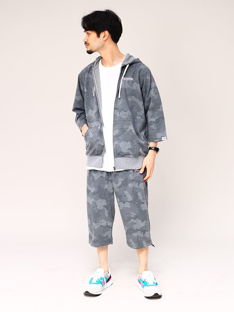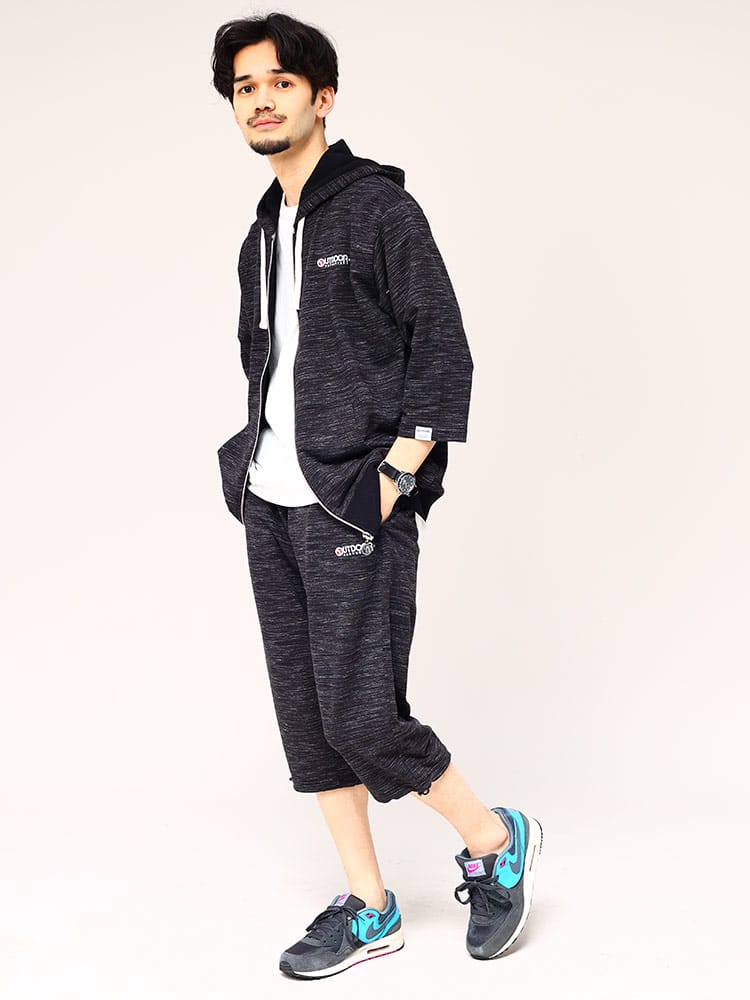 総柄デザインのOUTDOOR PRODUCTSのフード フルジップ 7分袖 パーカー。左胸にロゴ刺繍、左袖にロゴワッペンをあしらっています。フードのドローストリングにはワードプリントをデザイン。裾はリブデザイン。裏地は裏毛でサラッとした肌触りです。
