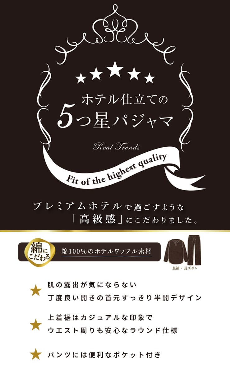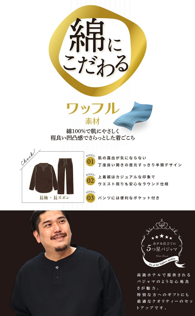サカゼンの5つ星パジャマ、ワッフル織の半開長袖パジャマは、快適さとスタイルを追求した一着です。独特のワッフル織りが特徴で、肌に心地よい空気の層を作り出し、保温性と通気性をバランス良く提供します。半開きのデザインは着脱を容易にし、リラックスした着心地を実現。シンプルながらも洗練されたデザインは、寝室での時間をより豊かなものにしてくれます。高品質でありながら、日々の快適な睡眠をサポートします。