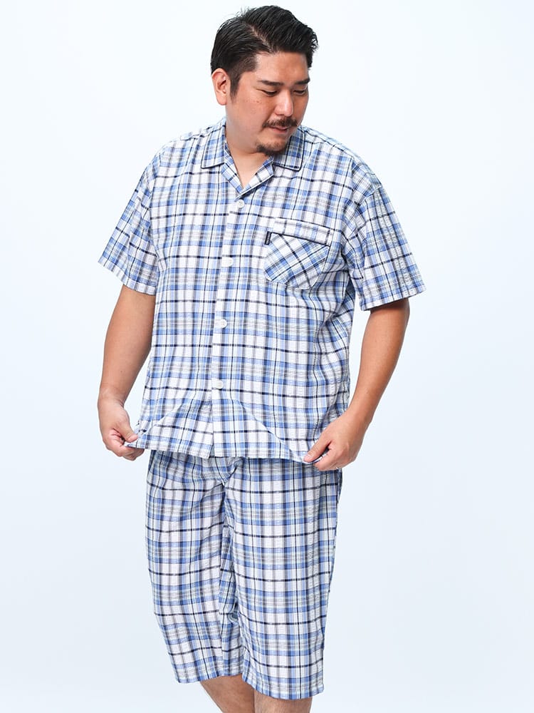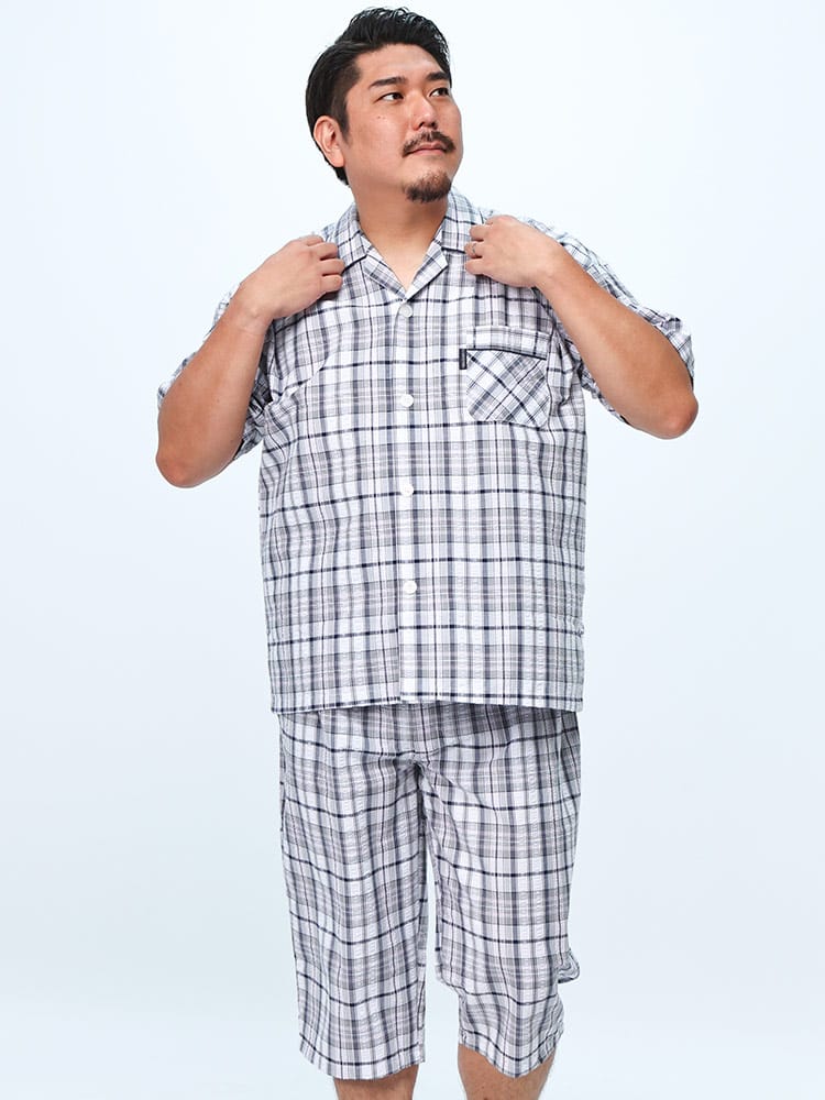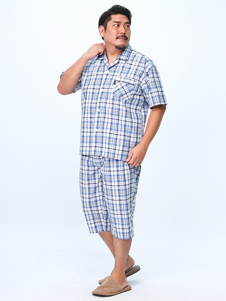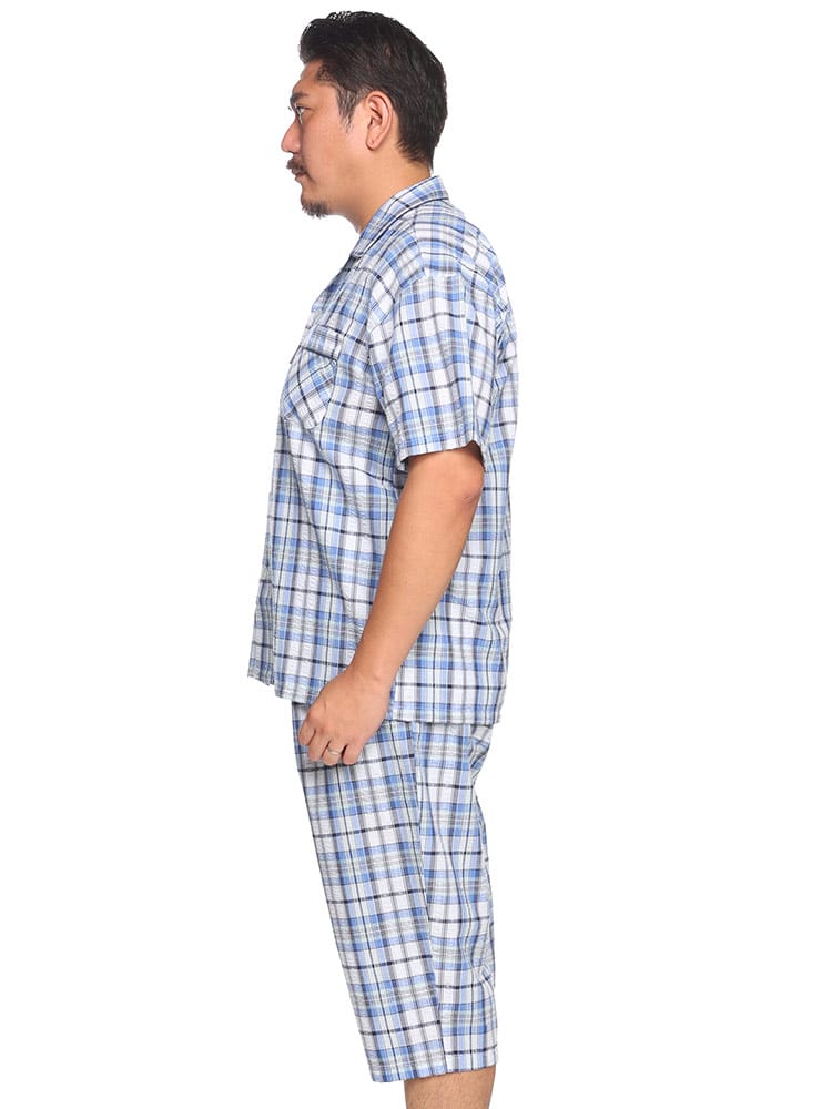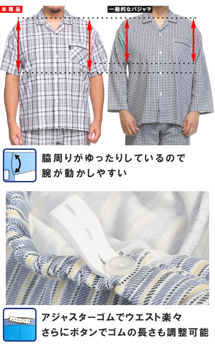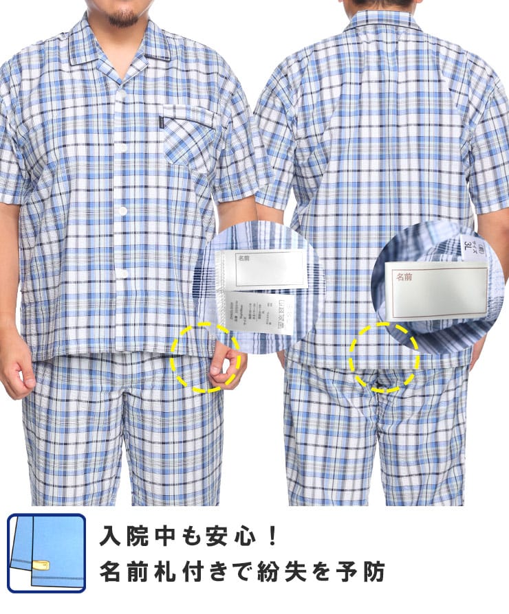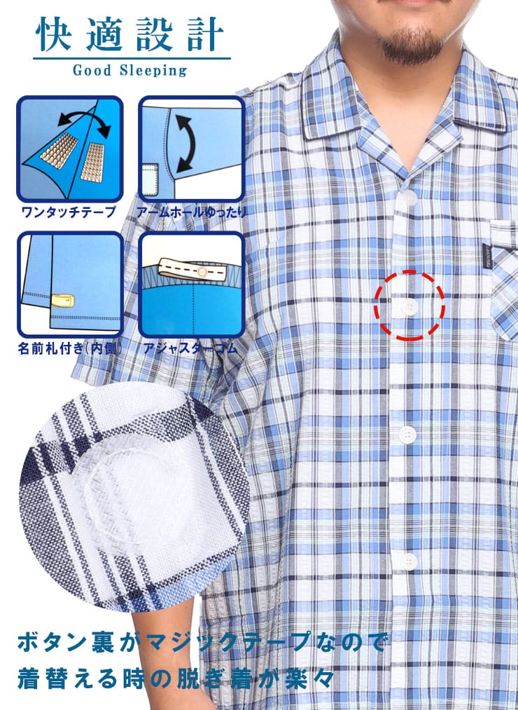 この快適設計のパジャマは、サッカー生地を使用しており、肌触りが良く快適です。前開きはマジックテープ仕様で、簡単に着脱できます。ウエストにはゴムアジャスターがあり、フィット感を調整可能。ゆったりとしたアームホールで動きやすく、半袖トップと七分丈パンツがセットになっています。内側には名札が付いており、入院着としても便利な一着。