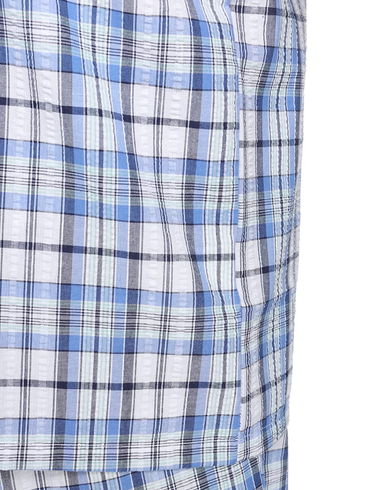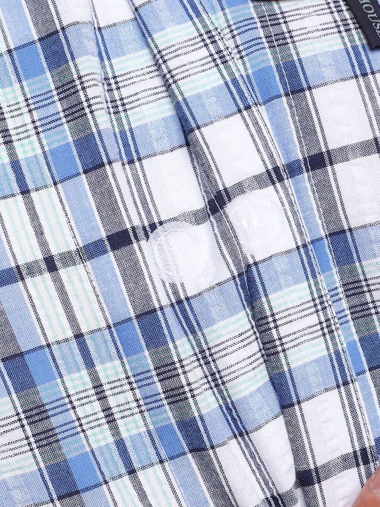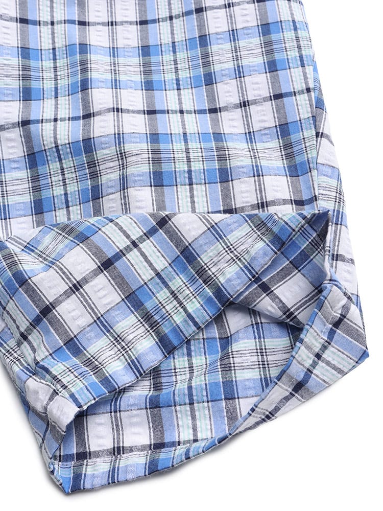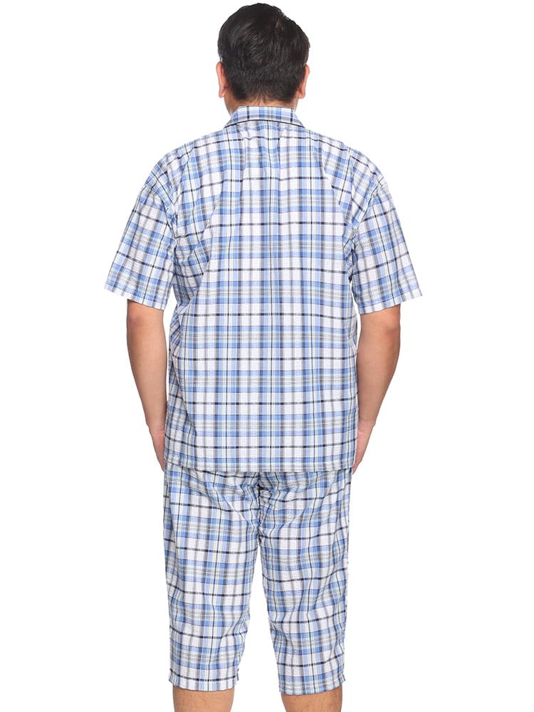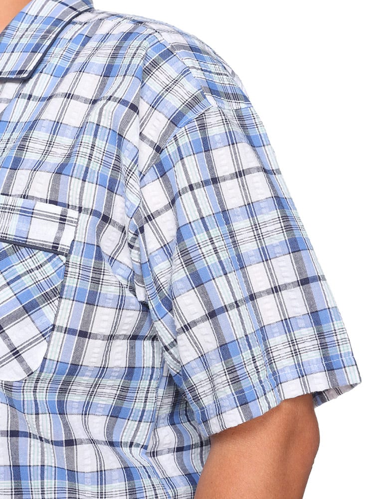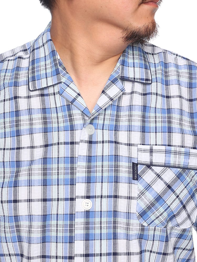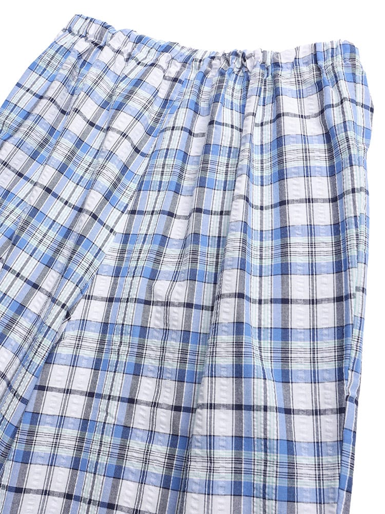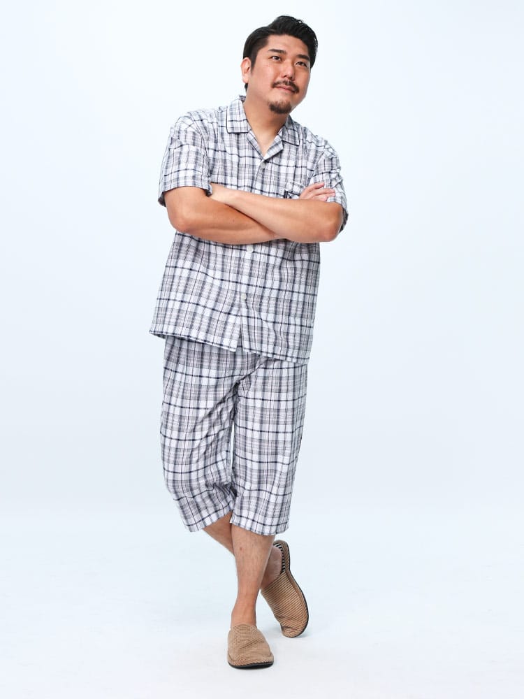 この快適設計のパジャマは、サッカー生地を使用しており、肌触りが良く快適です。前開きはマジックテープ仕様で、簡単に着脱できます。ウエストにはゴムアジャスターがあり、フィット感を調整可能。ゆったりとしたアームホールで動きやすく、半袖トップと七分丈パンツがセットになっています。内側には名札が付いており、入院着としても便利な一着。