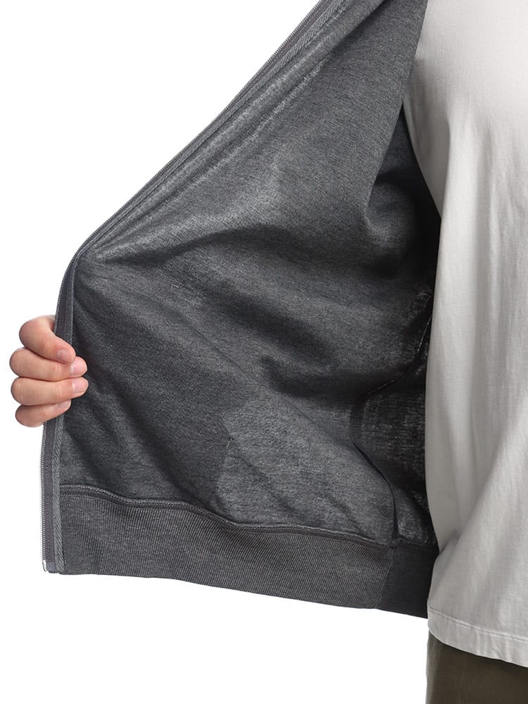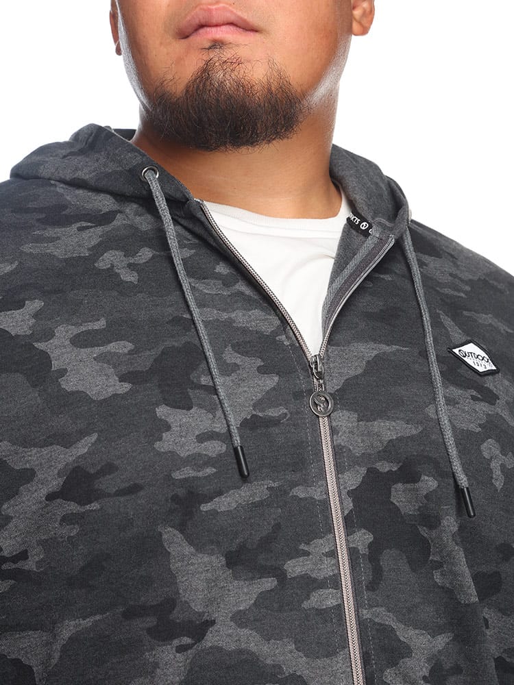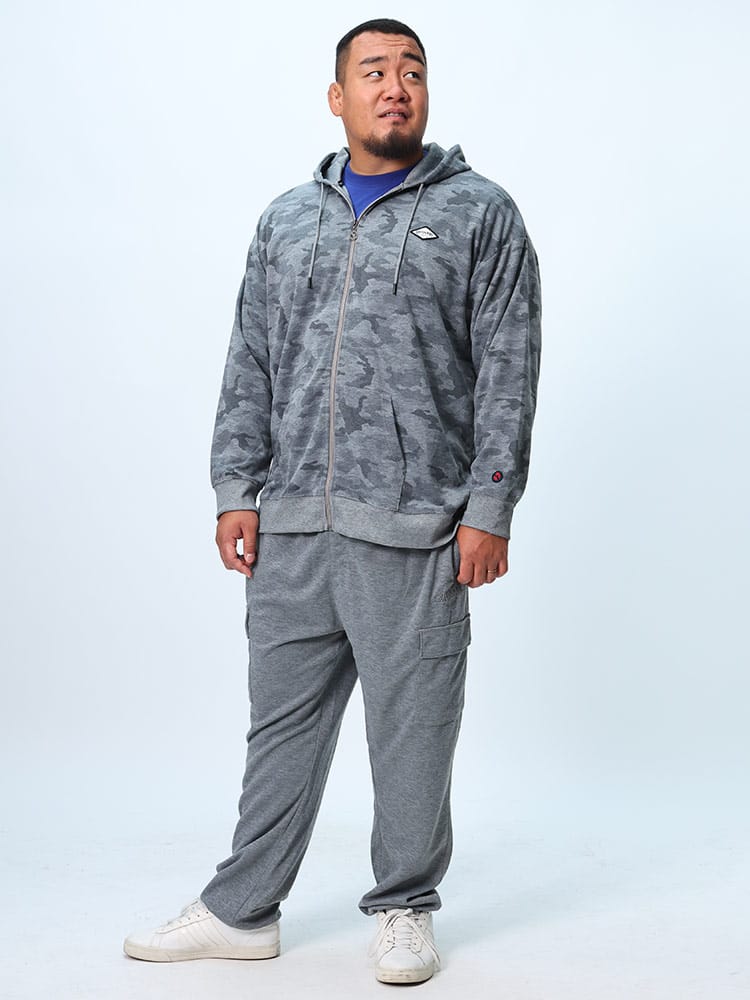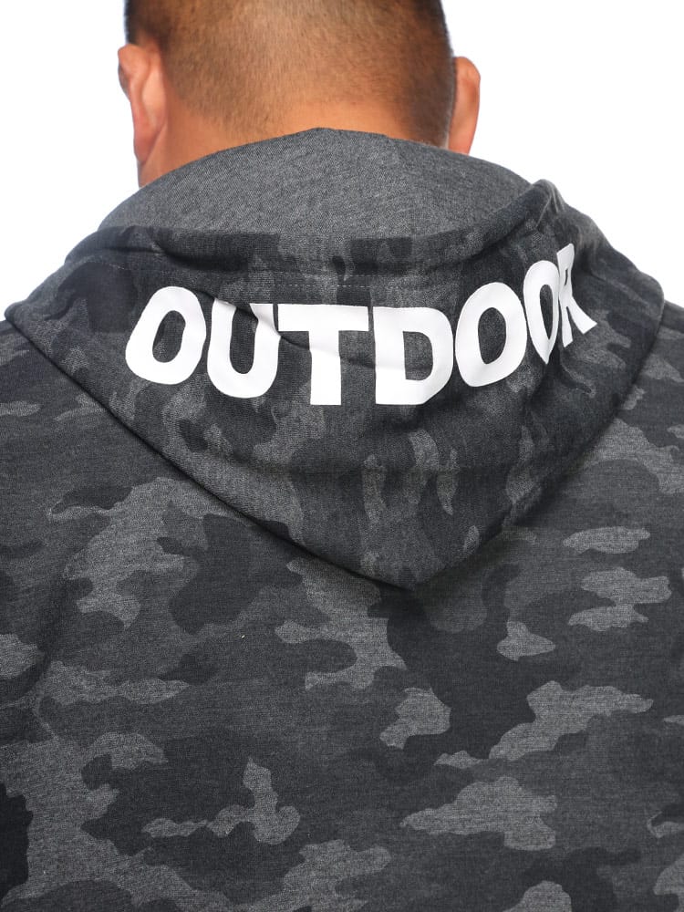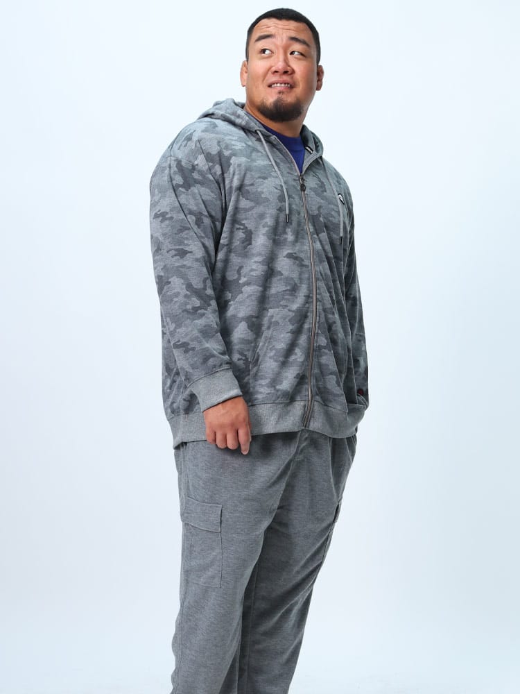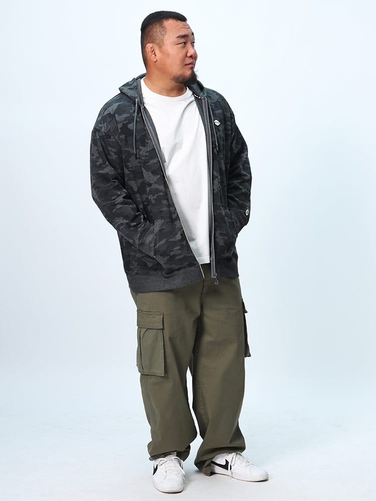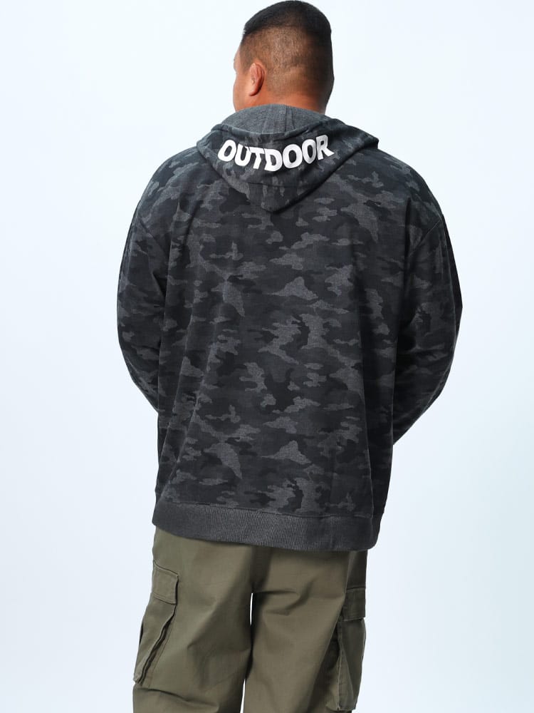コットンタッチ、ダンボール生地を使用した迷彩柄ジップパーカーは、柔らかな肌触りと軽量感があり、快適な着心地を提供します。