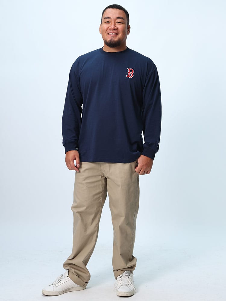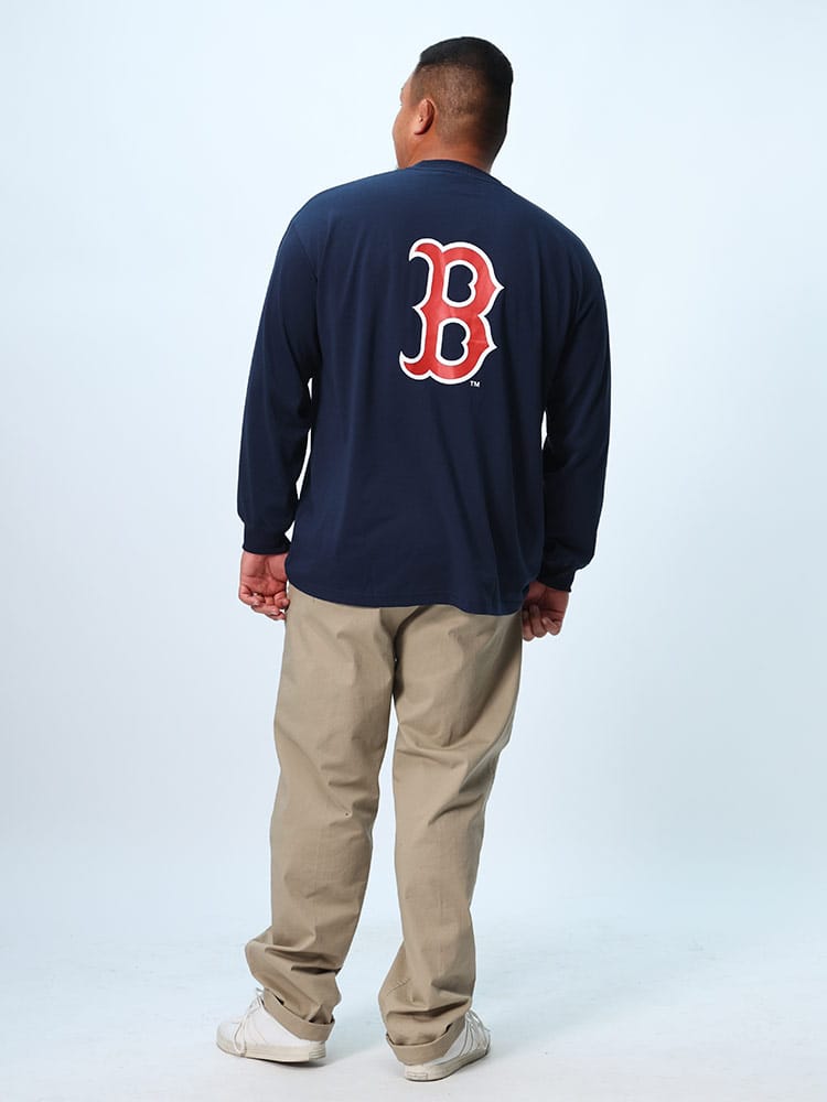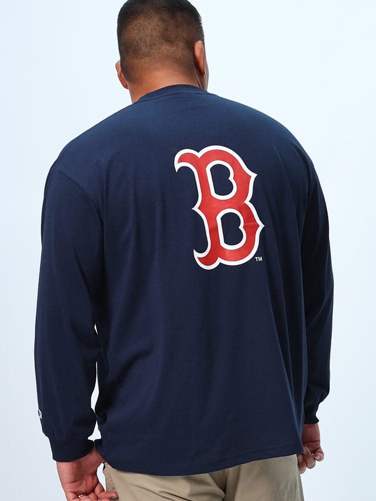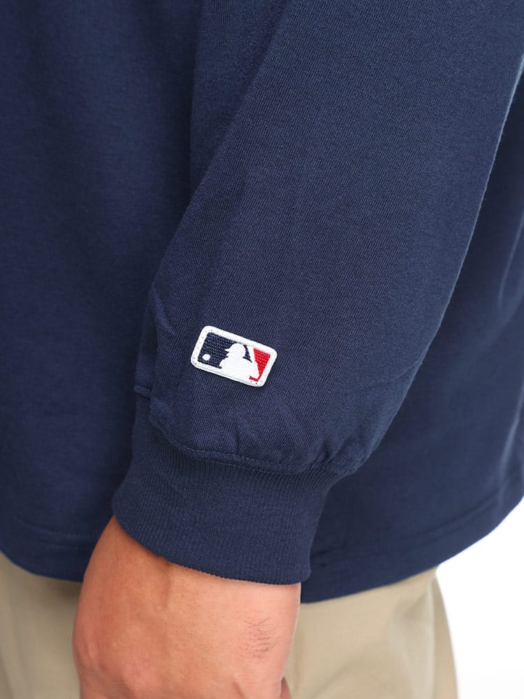 MLBのチームロゴがバックに大きくプリントされたクルーネック長袖Tシャツは、シンプルながらもインパクトのあるデザインが特徴です。