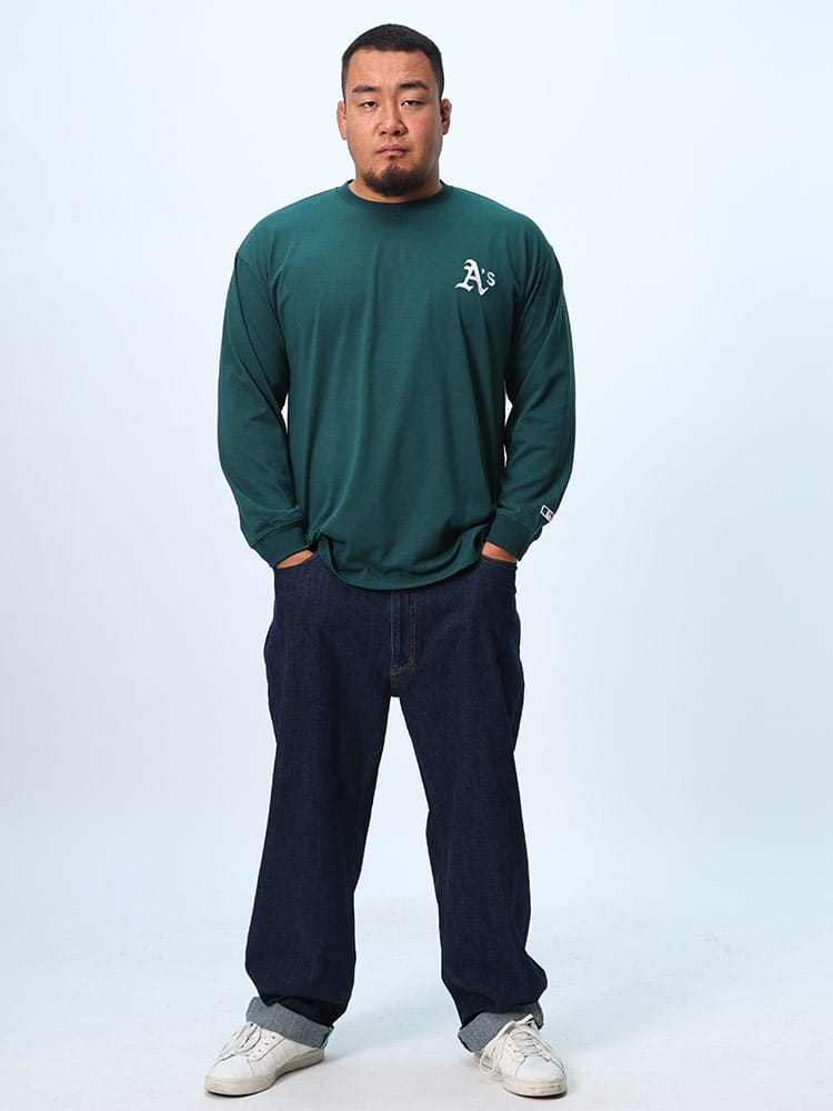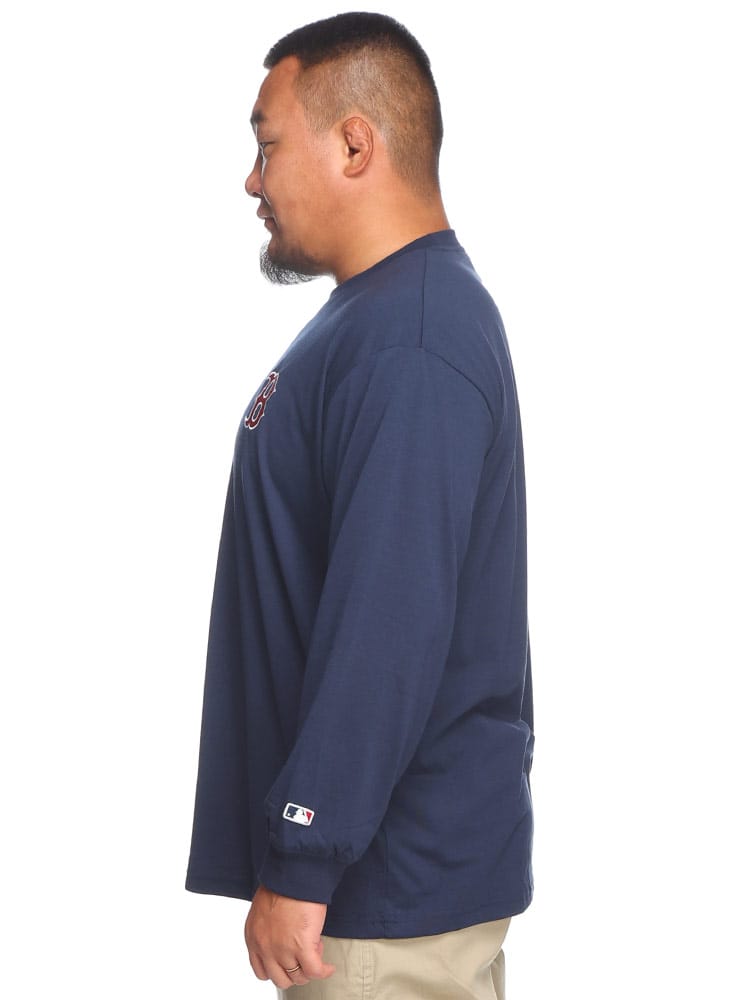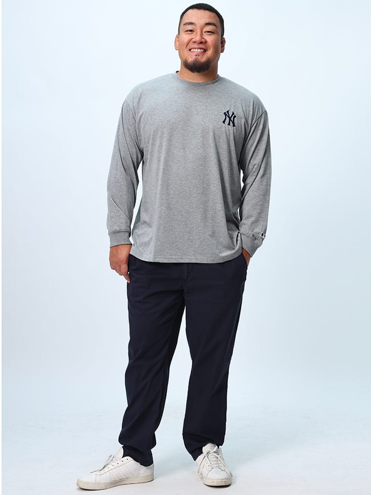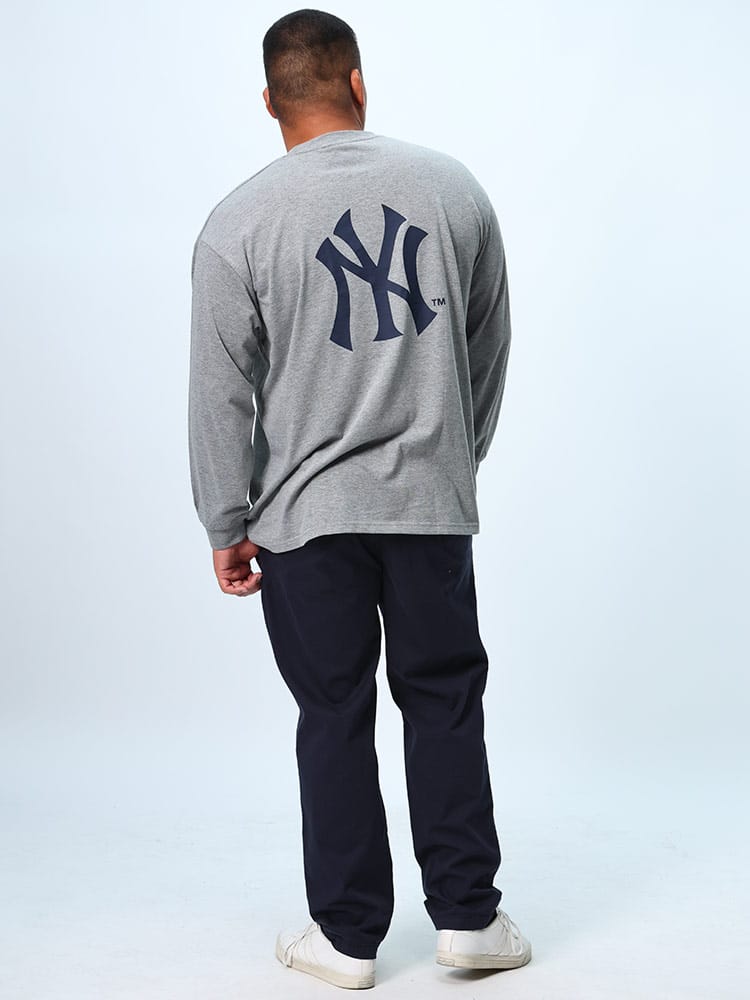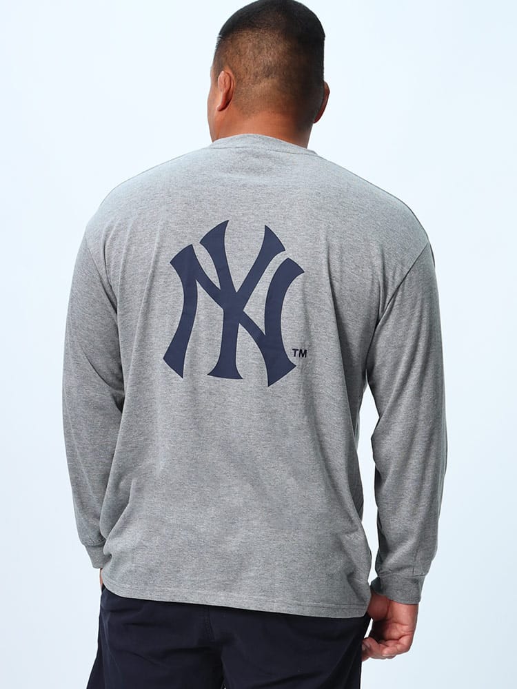 MLBのチームロゴがバックに大きくプリントされたクルーネック長袖Tシャツは、シンプルながらもインパクトのあるデザインが特徴です。
