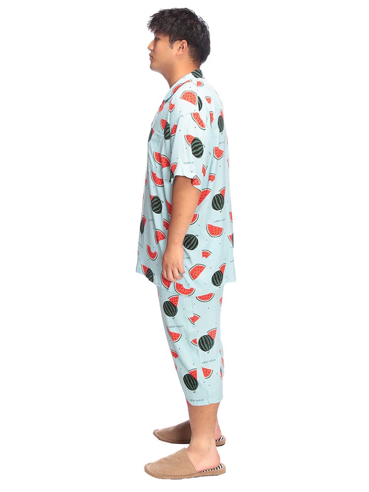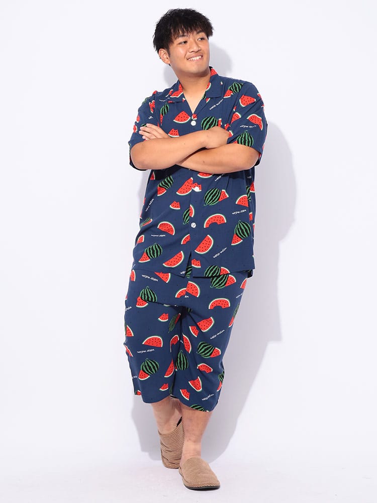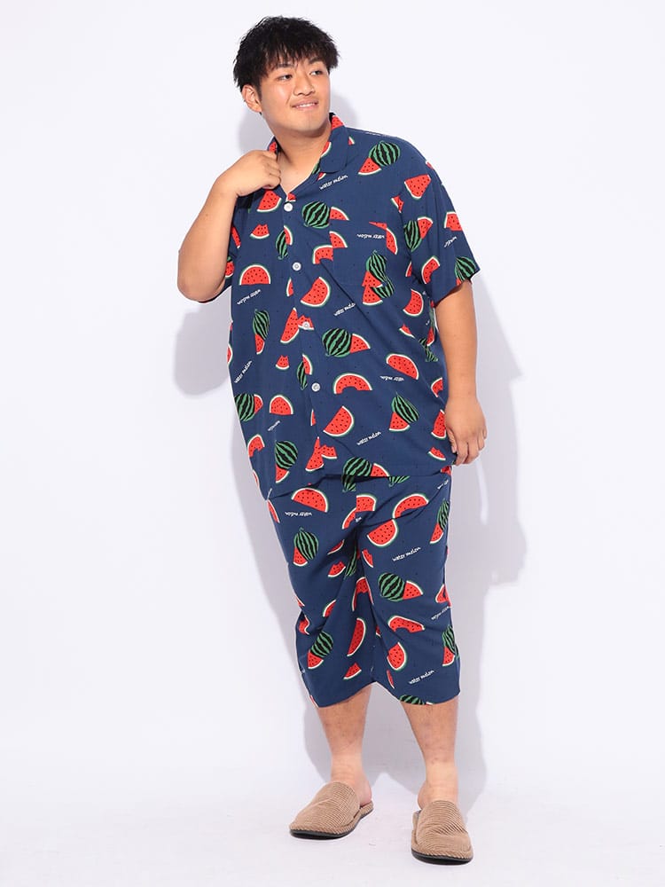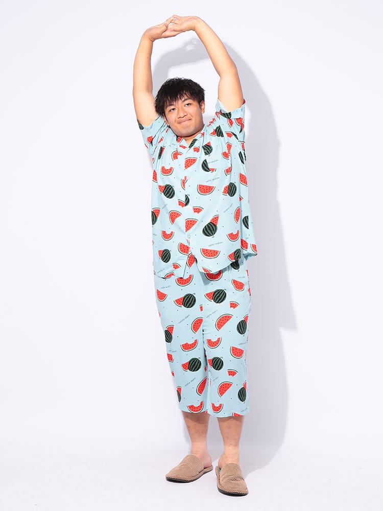 夏の夜を快適に過ごすなら、SAKAZENサカゼンの【接触冷感 スイカ柄 半袖 七分丈 パジャマ】がおすすめ!大きいサイズのメンズ向け上下セットで、ゆったりとした着心地を追求しました。肌に触れるとひんやり感じる接触冷感素材は、熱帯夜でも心地よい眠りをサポート。見ているだけでも涼しくなるポップなスイカ柄は、お部屋での気分を上げてくれます。素材はとろけるような肌触りのレーヨン100%。吸湿性にも優れているので、寝汗をかいてもベタつきにくいのが魅力です。ウエストは調節ゴム仕様で、どなたにもフィット。左側には便利なポケットが一つ付いており、ちょっとした小物の収納にも困りません。春から夏にかけて大活躍間違いなしのこのパジャマで、涼しく、楽しいリラックスタイムをお過ごしください。