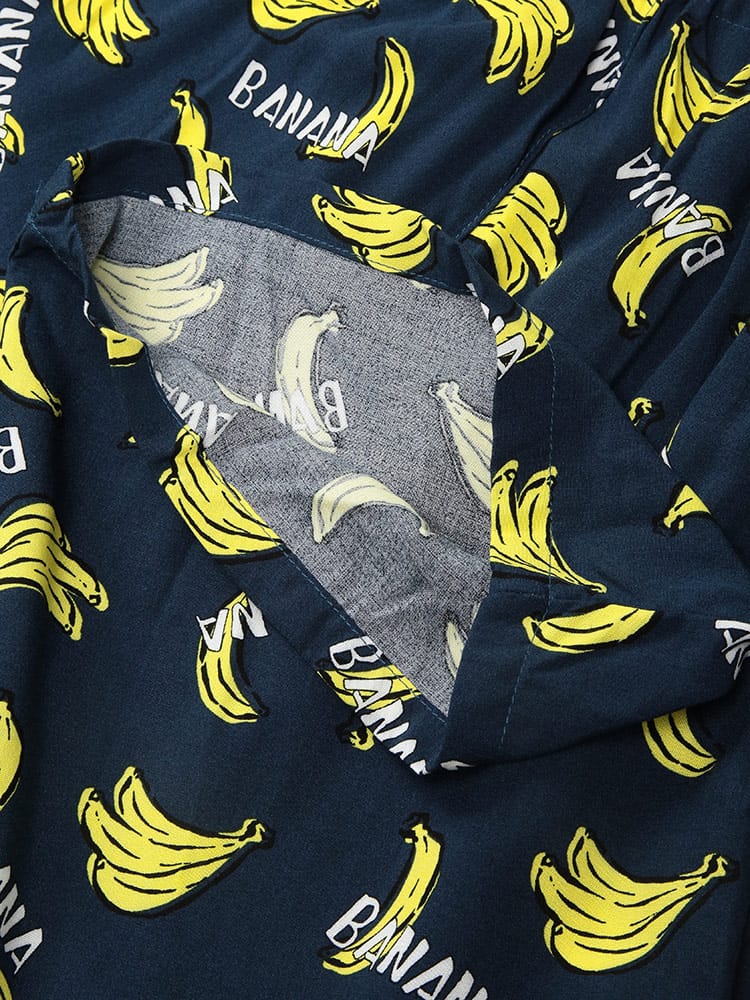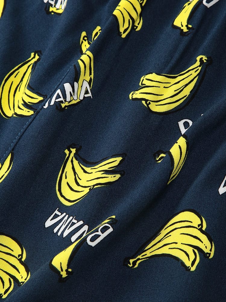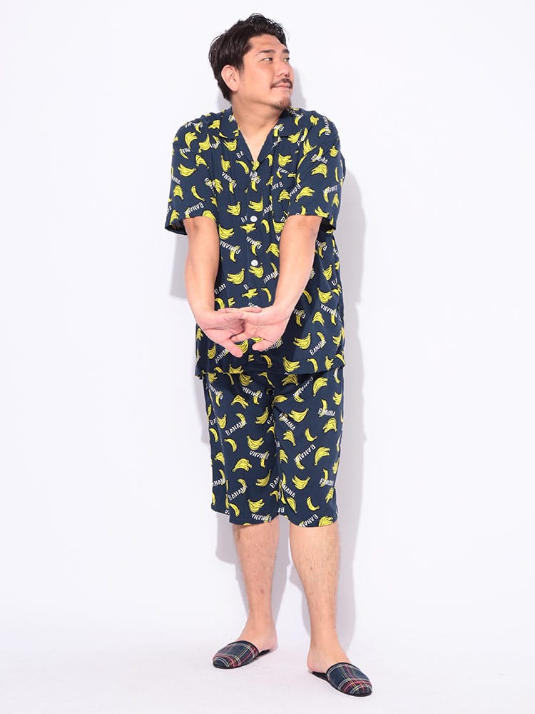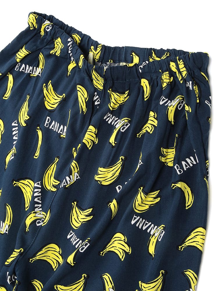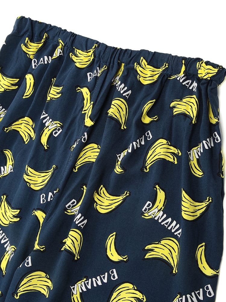 夏の夜を快適に過ごす「接触冷感パジャマ」が登場!ボタン止め半袖シャツとハイライズのゆったりハーフパンツの上下セットです。肌に触れるとひんやり感じる素材で、寝苦しい夜も爽やかに。可愛らしいバナナイラストパターンが、リラックスタイムを楽しく彩ります。解放感のある着心地で、心地よい睡眠をサポートします。