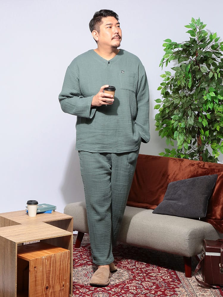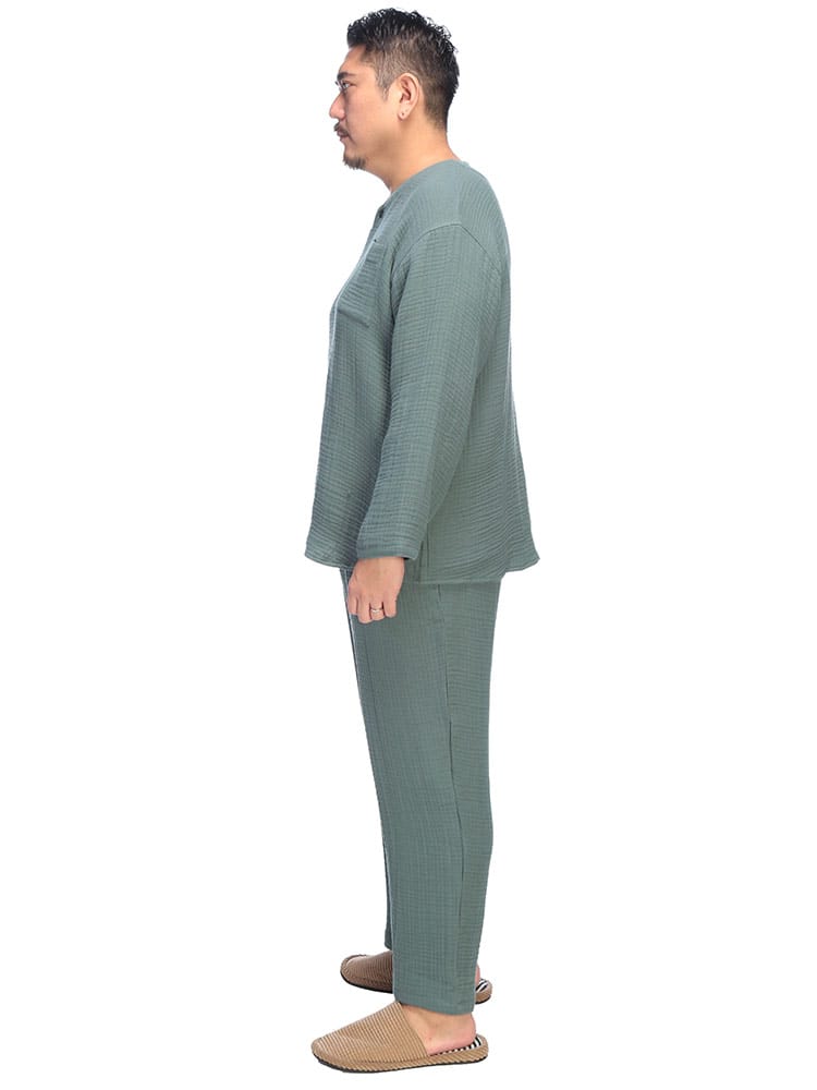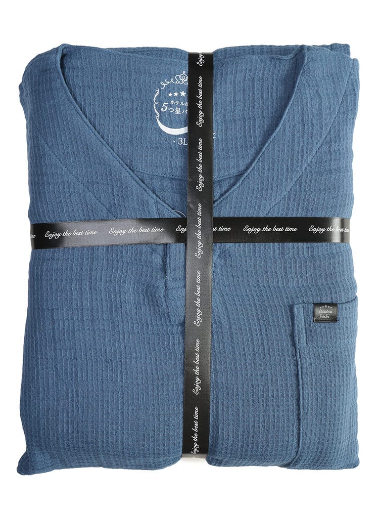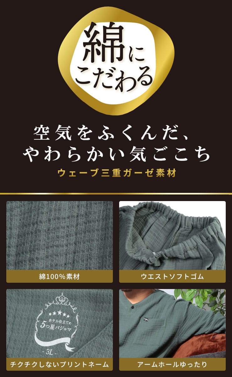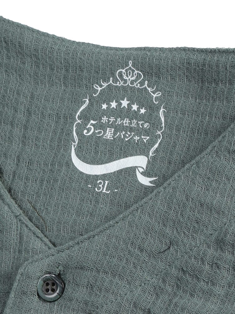 至福の眠りのための5つ星パジャマ ふんわりウェーブ 3重ガーゼ 1ボタン ヘンリーネックパジャマです。ふんわりと空気を含んだ3重ガーゼが、まるで雲に包まれるような極上の肌触りを実現。綿100%の優しい素材が、デリケートな肌にも心地よく、一日の疲れを癒すのに最適です。トップスは、首元がすっきり見えるヘンリーネックデザイン。ワンボタンのアクセントが、シンプルながらもおしゃれな雰囲気を演出します。ゆったりとしたアームホールで、寝返りもスムーズ。パンツは、両サイドにポケットを配置し、ウエストはソフトゴムと調節コードで、締め付け感なくリラックスして穿くことができます。吸水性・通気性にも優れているため、汗をかいてもサラサラとした肌触りをキープ。一年を通して快適に着用いただけます。ご自分用にはもちろん、大切な方へのプレゼントとしても喜ばれる、上質なパジャマです。この特別な一着で、ワンランク上のリラックスタイムをお過ごしください。
