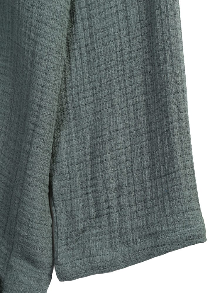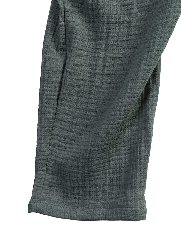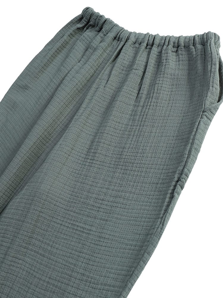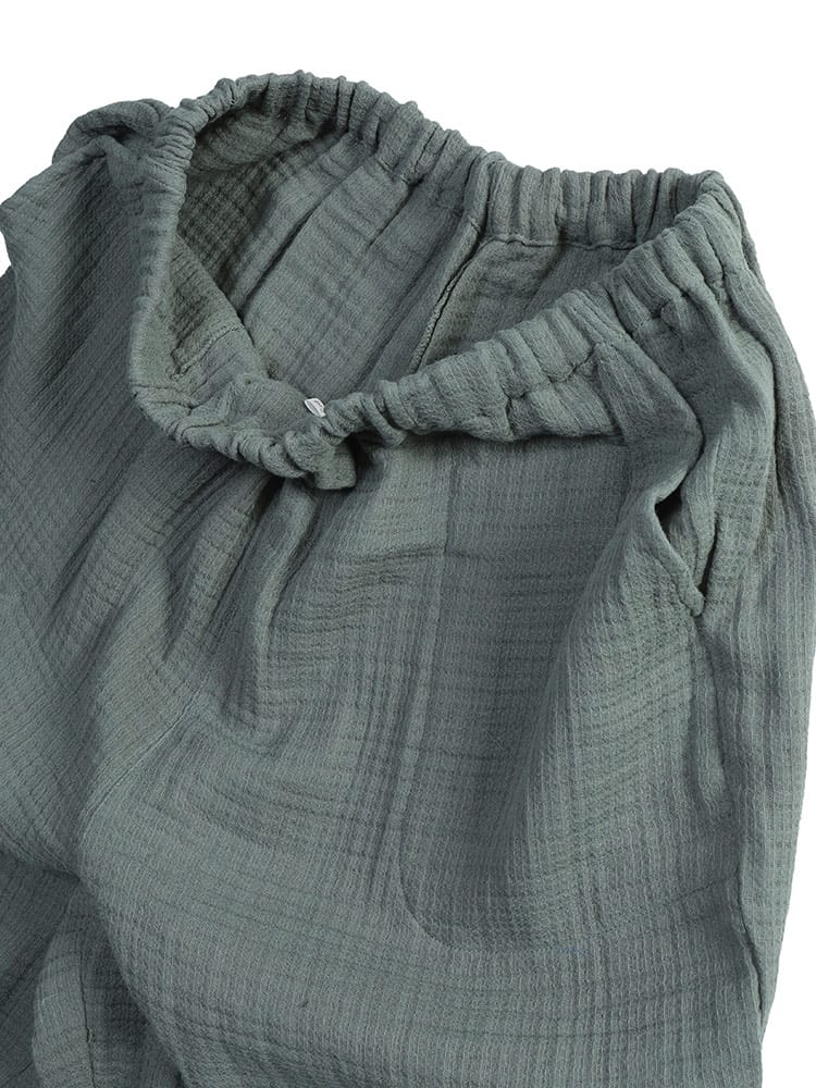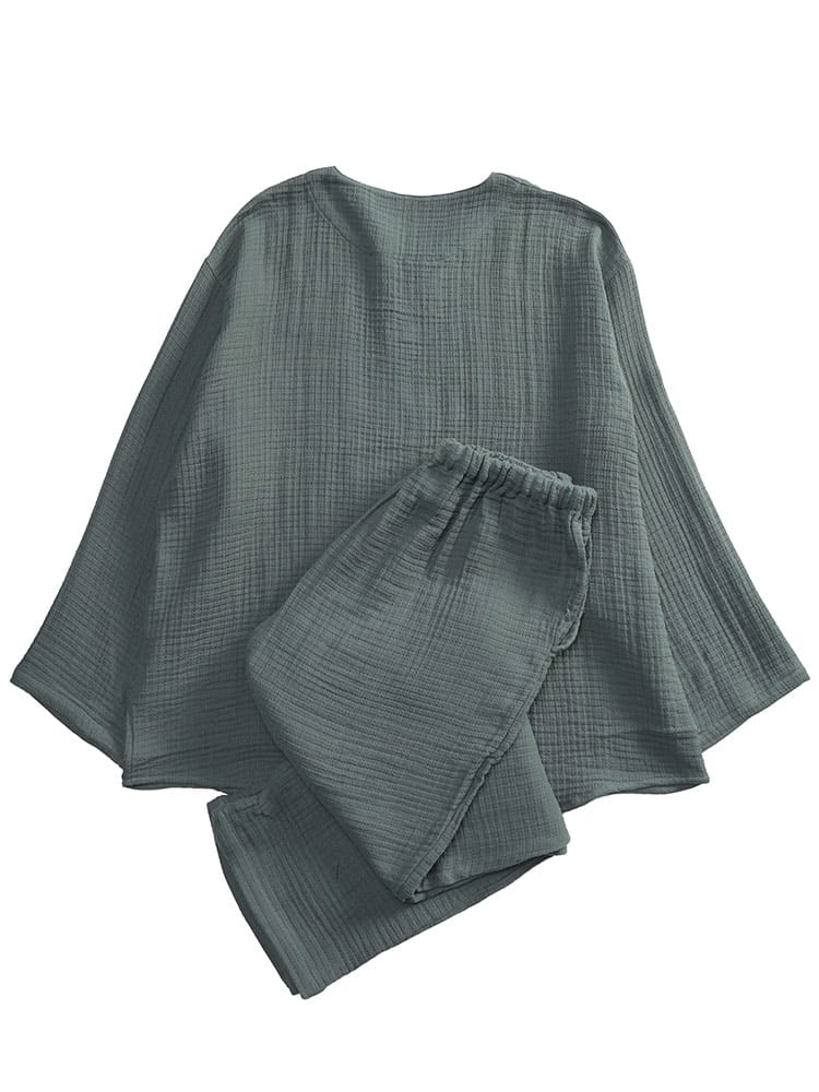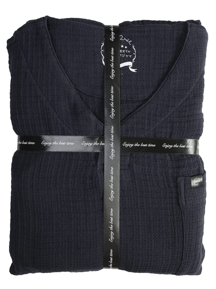 至福の眠りのための5つ星パジャマ ふんわりウェーブ 3重ガーゼ 1ボタン ヘンリーネックパジャマです。ふんわりと空気を含んだ3重ガーゼが、まるで雲に包まれるような極上の肌触りを実現。綿100%の優しい素材が、デリケートな肌にも心地よく、一日の疲れを癒すのに最適です。トップスは、首元がすっきり見えるヘンリーネックデザイン。ワンボタンのアクセントが、シンプルながらもおしゃれな雰囲気を演出します。ゆったりとしたアームホールで、寝返りもスムーズ。パンツは、両サイドにポケットを配置し、ウエストはソフトゴムと調節コードで、締め付け感なくリラックスして穿くことができます。吸水性・通気性にも優れているため、汗をかいてもサラサラとした肌触りをキープ。一年を通して快適に着用いただけます。ご自分用にはもちろん、大切な方へのプレゼントとしても喜ばれる、上質なパジャマです。この特別な一着で、ワンランク上のリラックスタイムをお過ごしください。