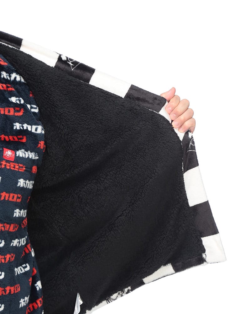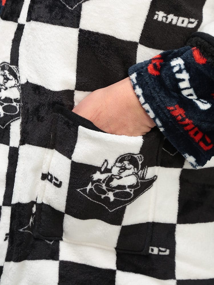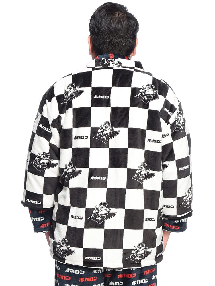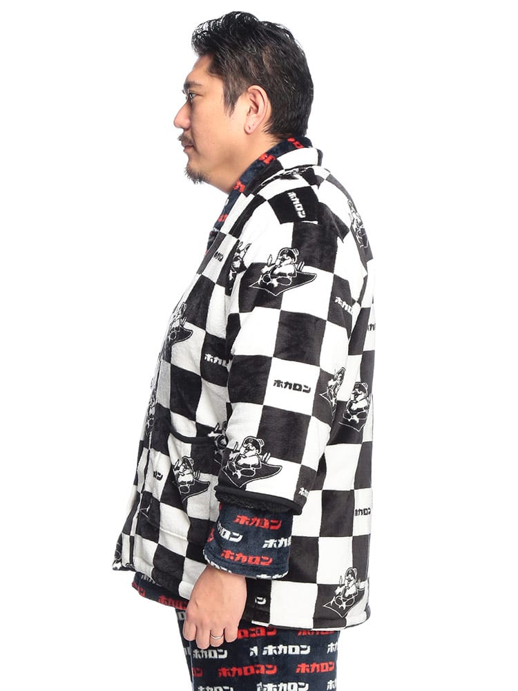 カイロブランド「ホカロン」とコラボレーションした、裏ボア仕様のフリース半纏。内側全体に施された柔らかなボアが抜群の保温性を発揮し、寒い冬もポカポカとした温もりで包み込みます。落ち着いた格子柄(チェック柄)のデザインで、世代を問わず着用可能。軽量で暖かく、ご自宅でのリラックスタイムにぴったりの防寒着です。