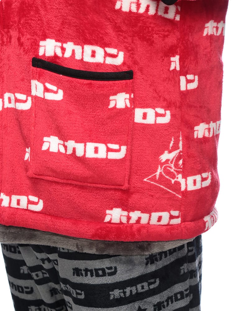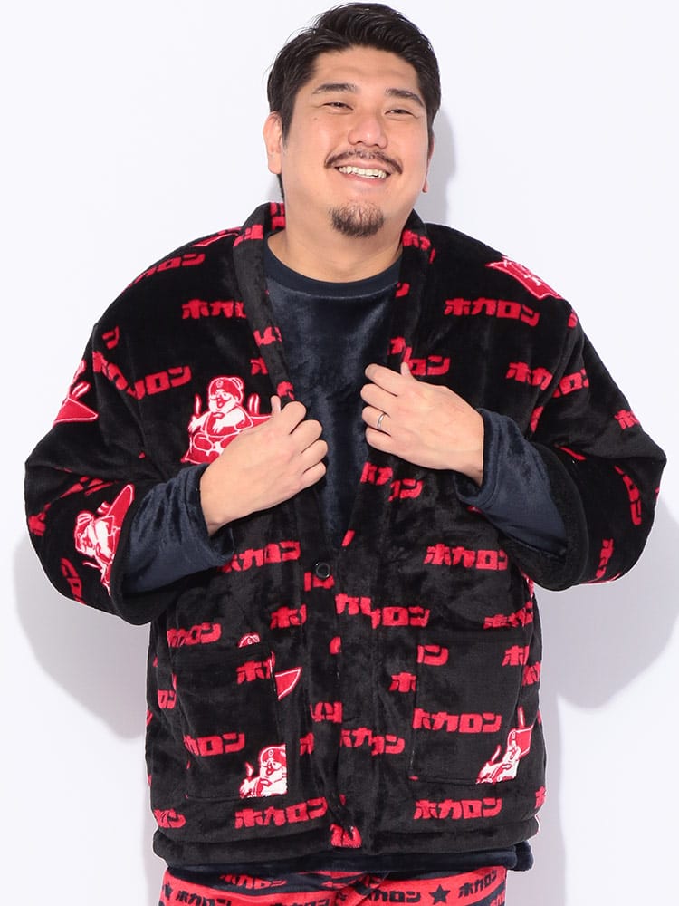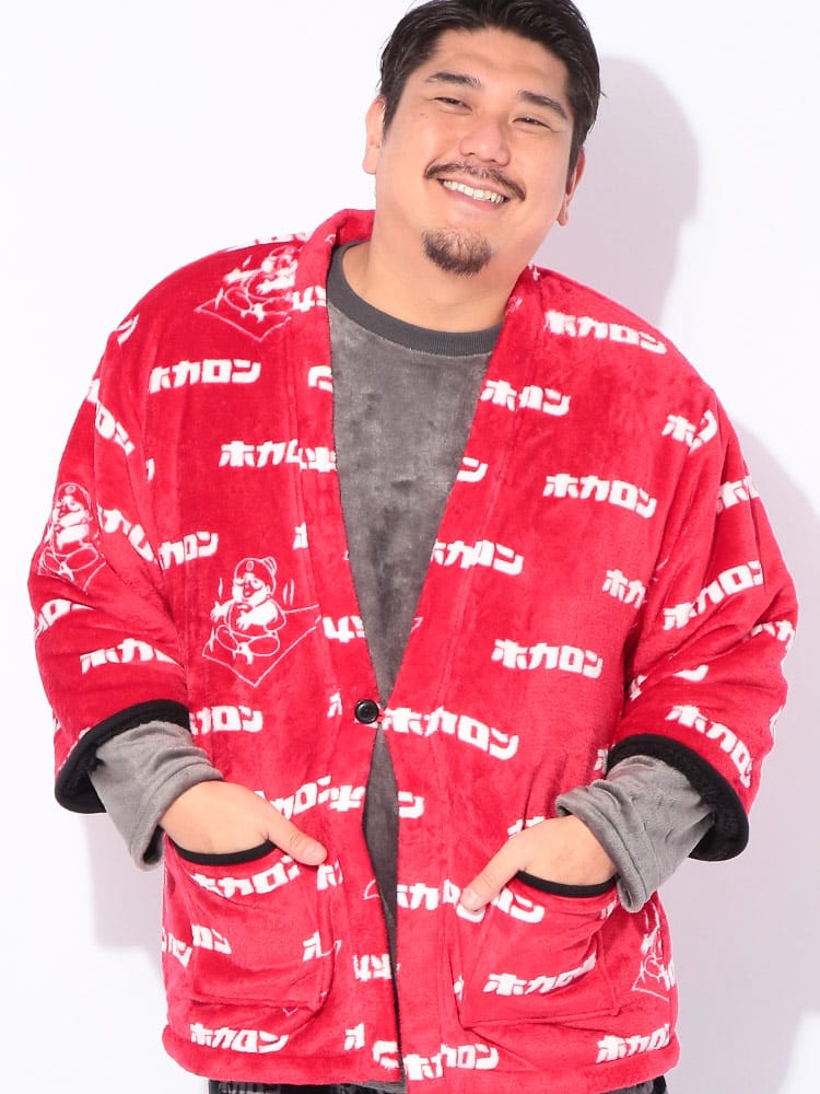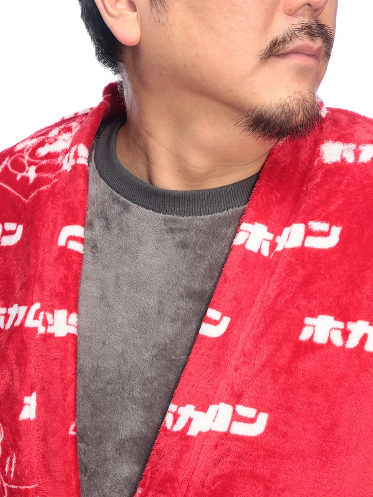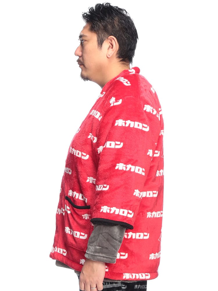 カイロブランド「ホカロン」のロゴをあしらった、総柄デザインの遊び心あふれる裏ボア半纏。内側全体に施されたふかふかの裏ボアが、まるで毛布のような極上の温もりを提供します。軽くて柔らかいフリース素材で着心地も抜群。寒い冬のリラックスタイムを、楽しく暖かく過ごしたい方に最適な防寒アイテムです。