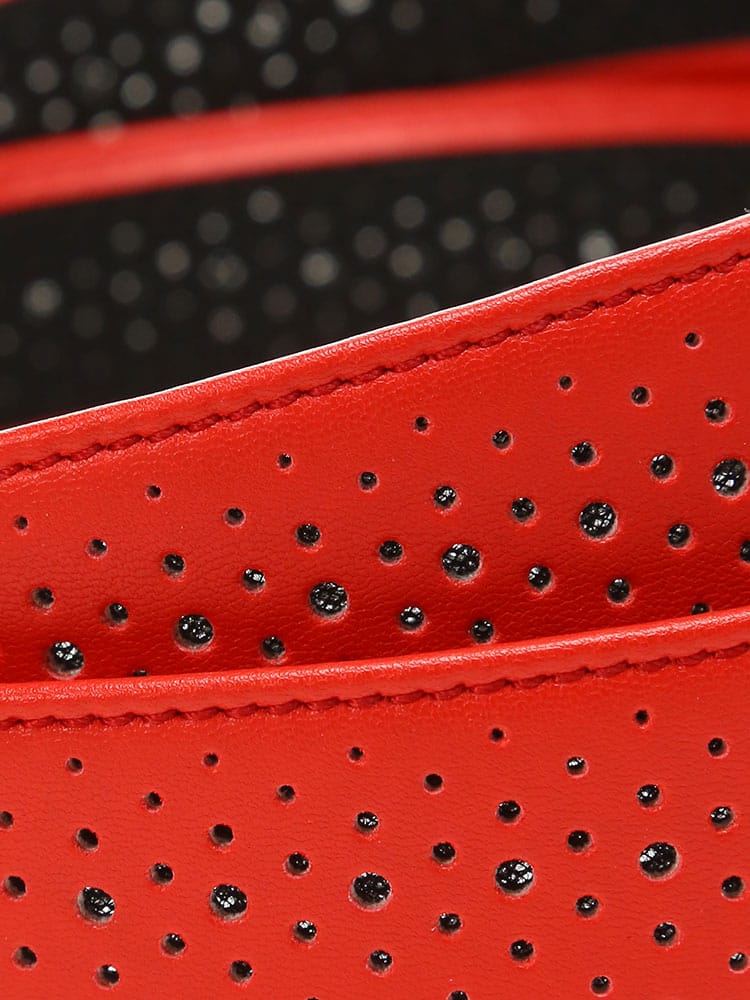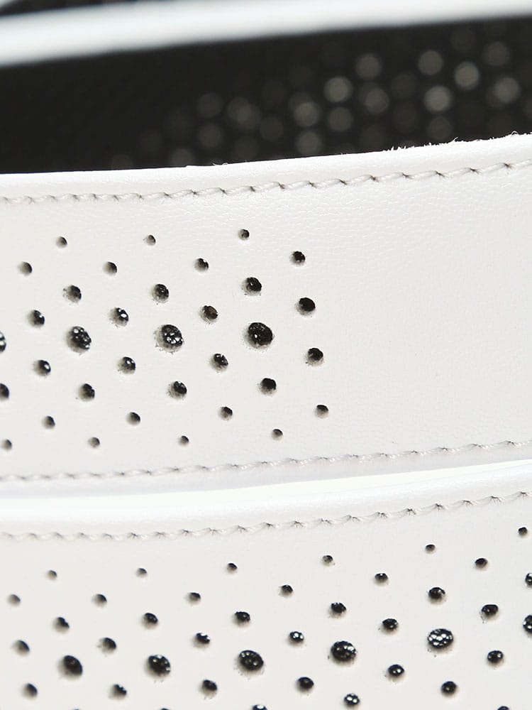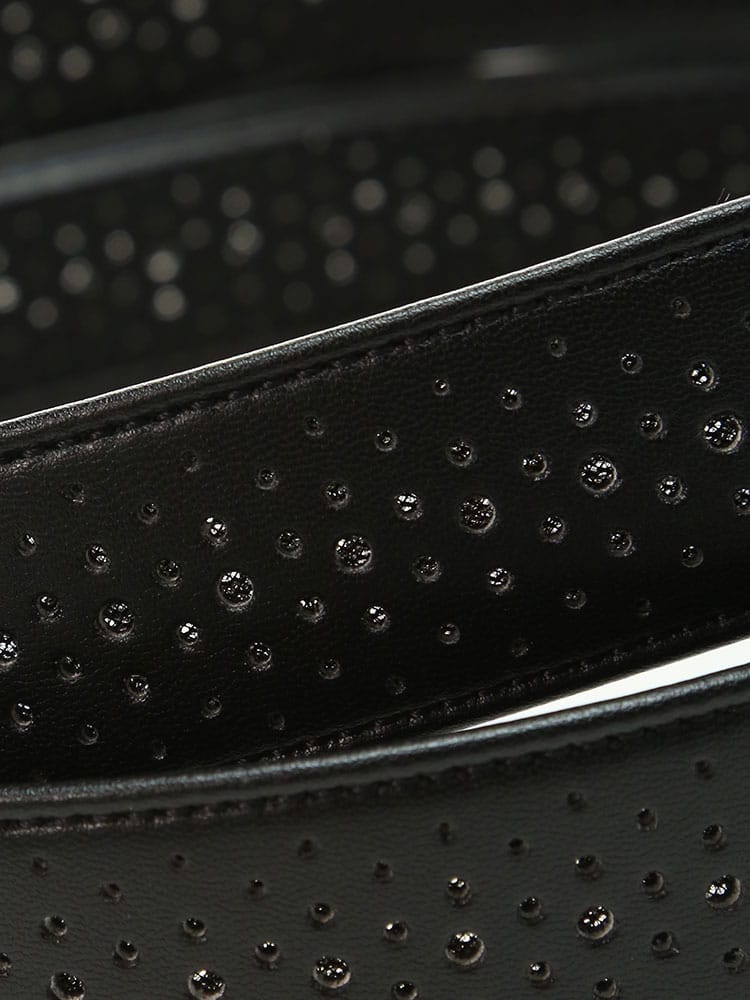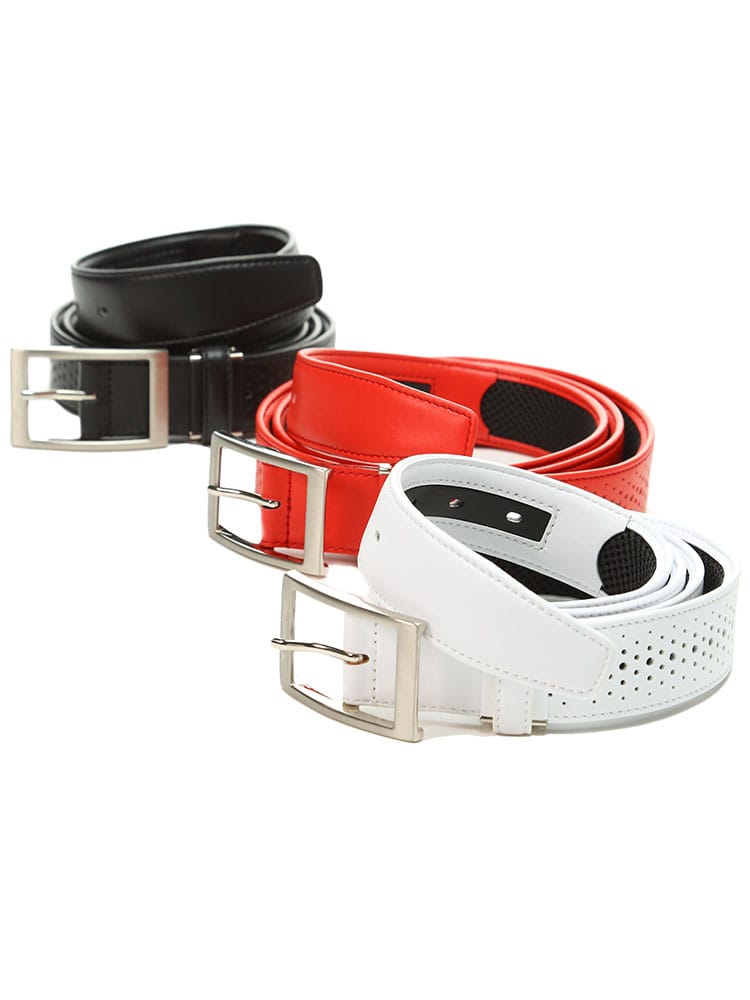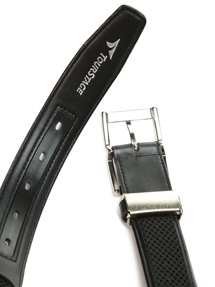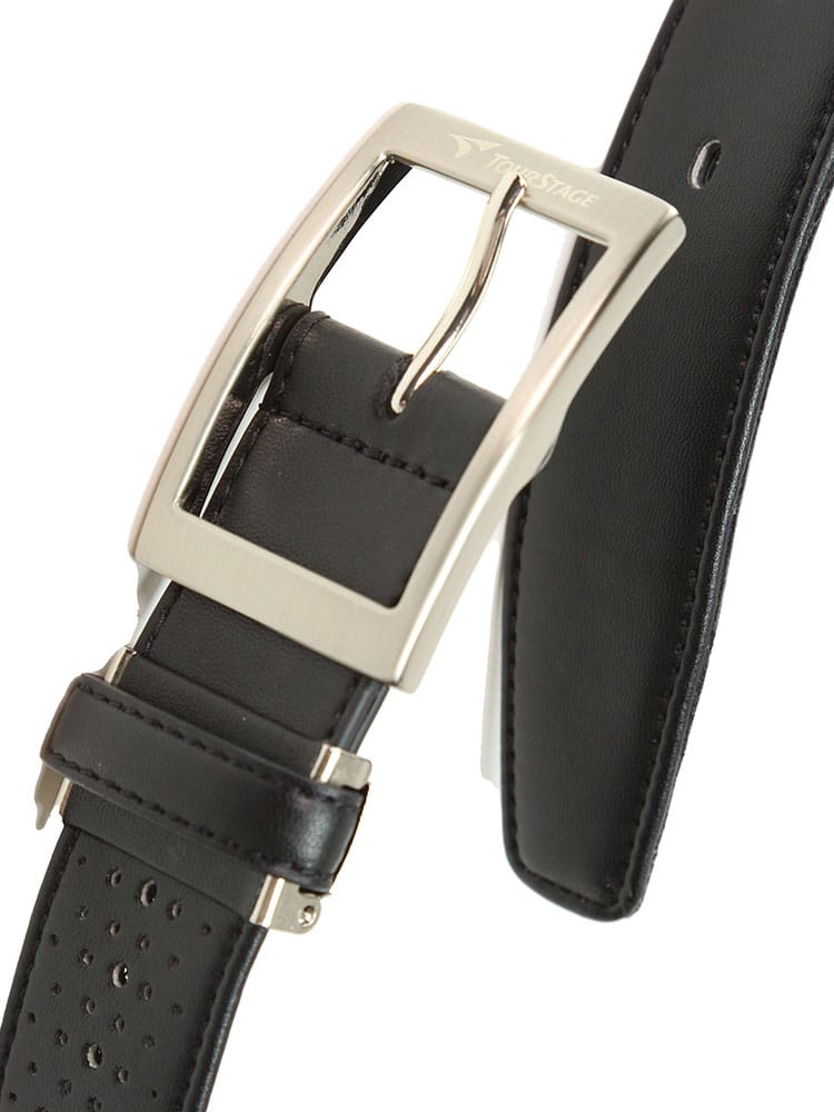 フェイクレザーを使用したTOURSTAGEのストレッチドライキープベルトです。吸汗・速乾・放出性に優れた三層の立体構造メッシュが、ウエスト周りの汗や湿気を吸い取り、本体表面の穴より放出します。腰回りのベタつきを解消し、いつもさらさらで快適さを保ちます。ゴルフウェアに最適なアイテムです。ご自分用にはもちろん贈り物としてもおすすめです。噛み合わせ留めタイプでベルトの長さ調節可能。