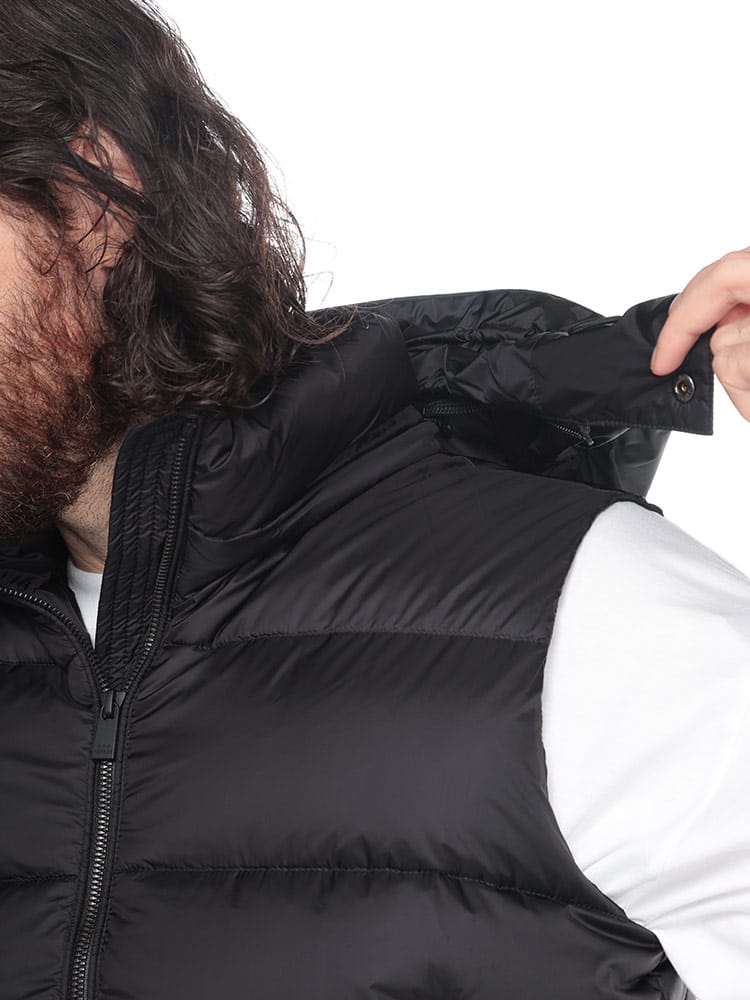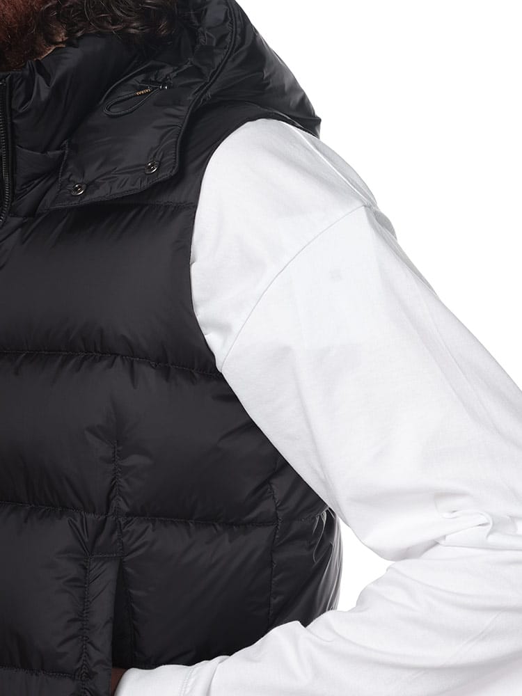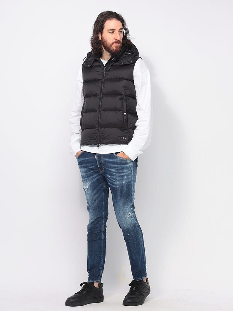 セミシャイニー素材の定番型ダウンベスト「POSEIDONE ポセイドーネ」。ダウンステッチは少し広めでレトロな印象ですが、コンパクトなサイズ感でスタイリッシュに着こなせるアイテムです。