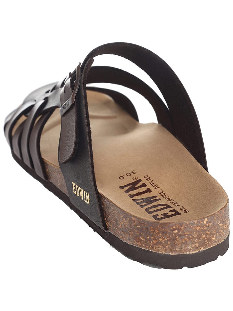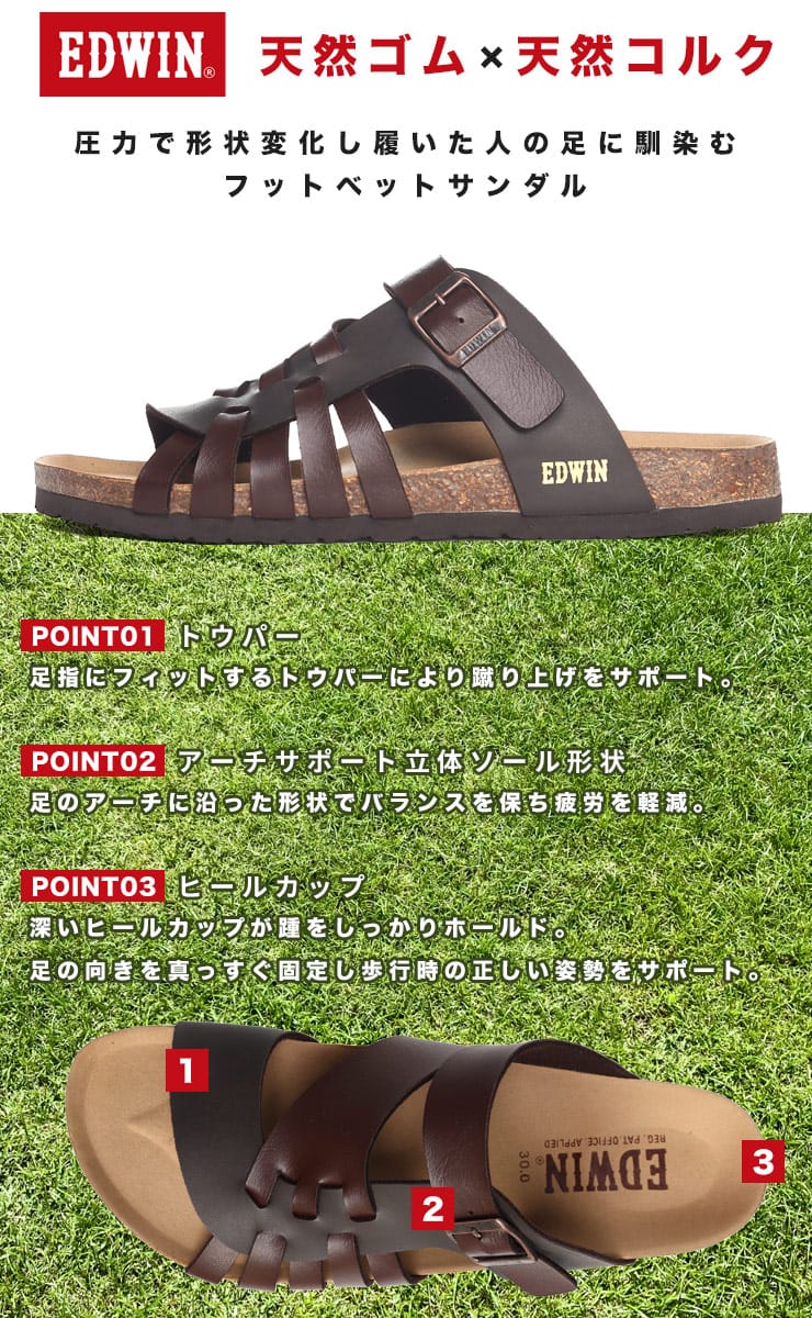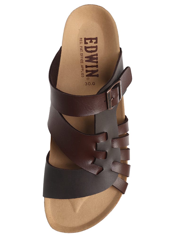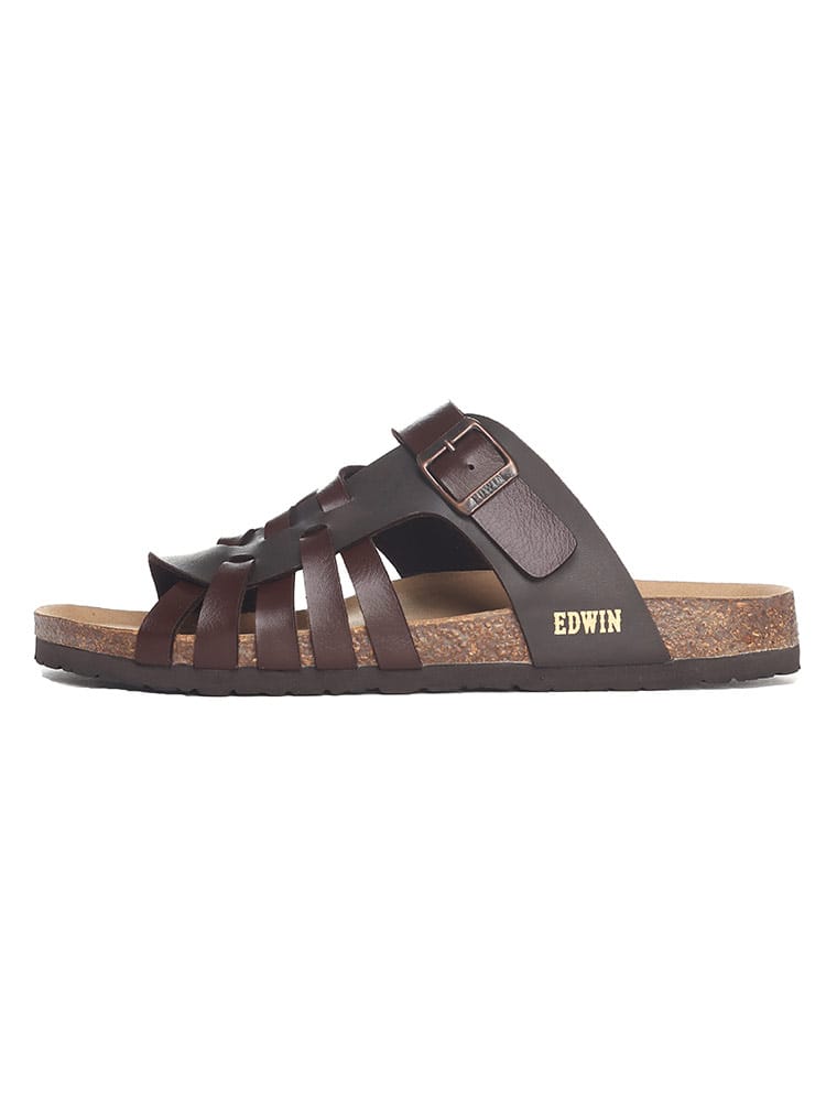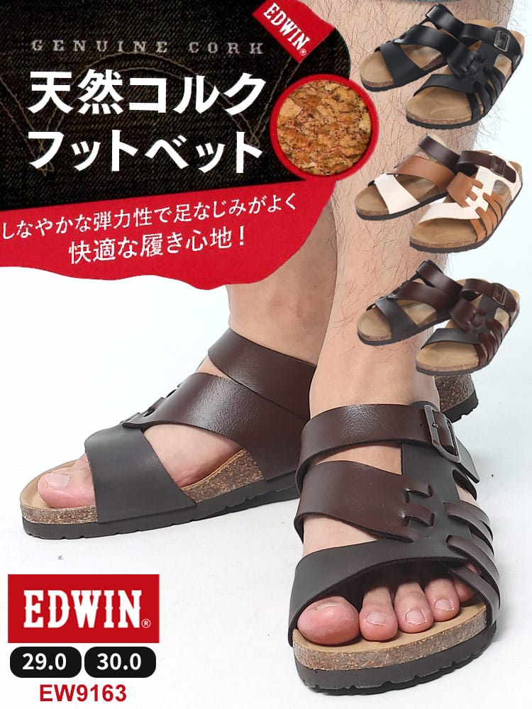 EDWINのコンフォートサンダル。夏のカジュアルスタイルに欠かせない定番のサンダルです。すっと足を入れられる履きやすいタイプで、おしゃれなベルト編み込みデザインが象徴的な一足。ソールには天然コルクのフットベッドを使用しているので弾力性のあるしなやかなはき心地の一足です。