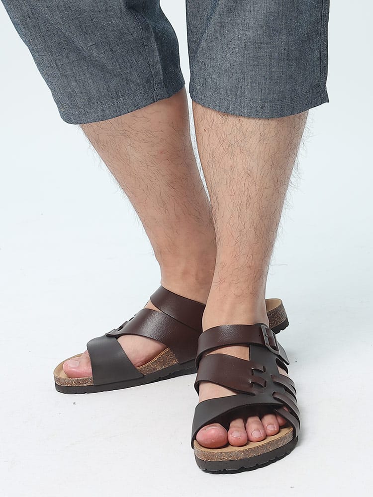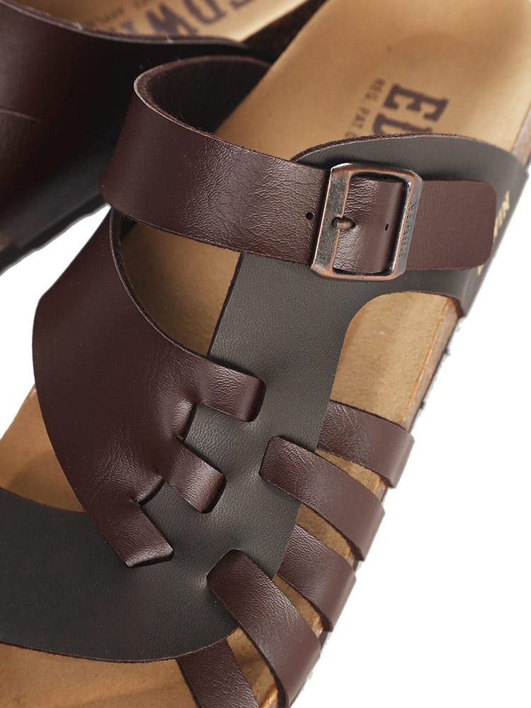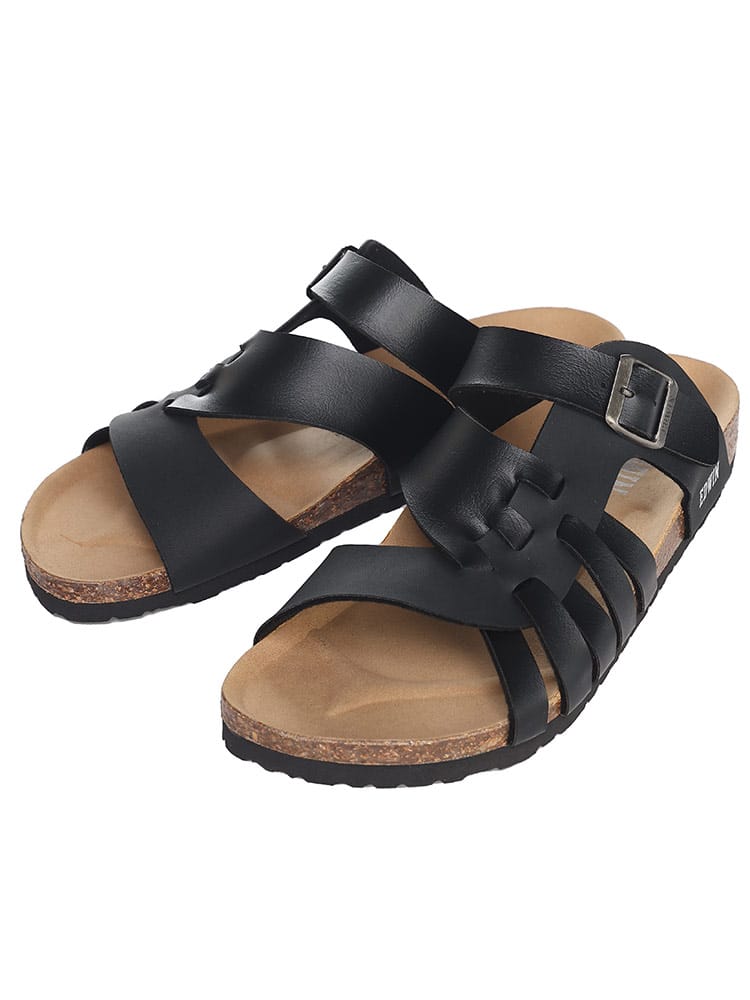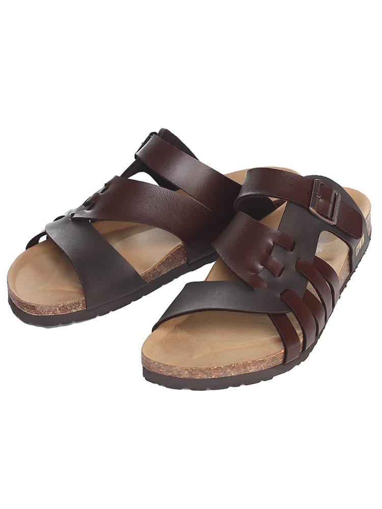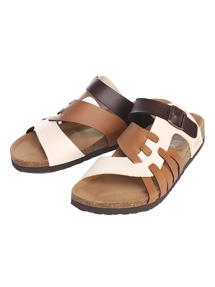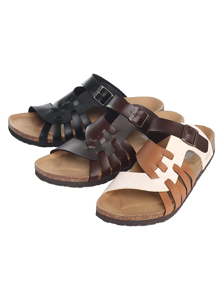 EDWINのコンフォートサンダル。夏のカジュアルスタイルに欠かせない定番のサンダルです。すっと足を入れられる履きやすいタイプで、おしゃれなベルト編み込みデザインが象徴的な一足。ソールには天然コルクのフットベッドを使用しているので弾力性のあるしなやかなはき心地の一足です。