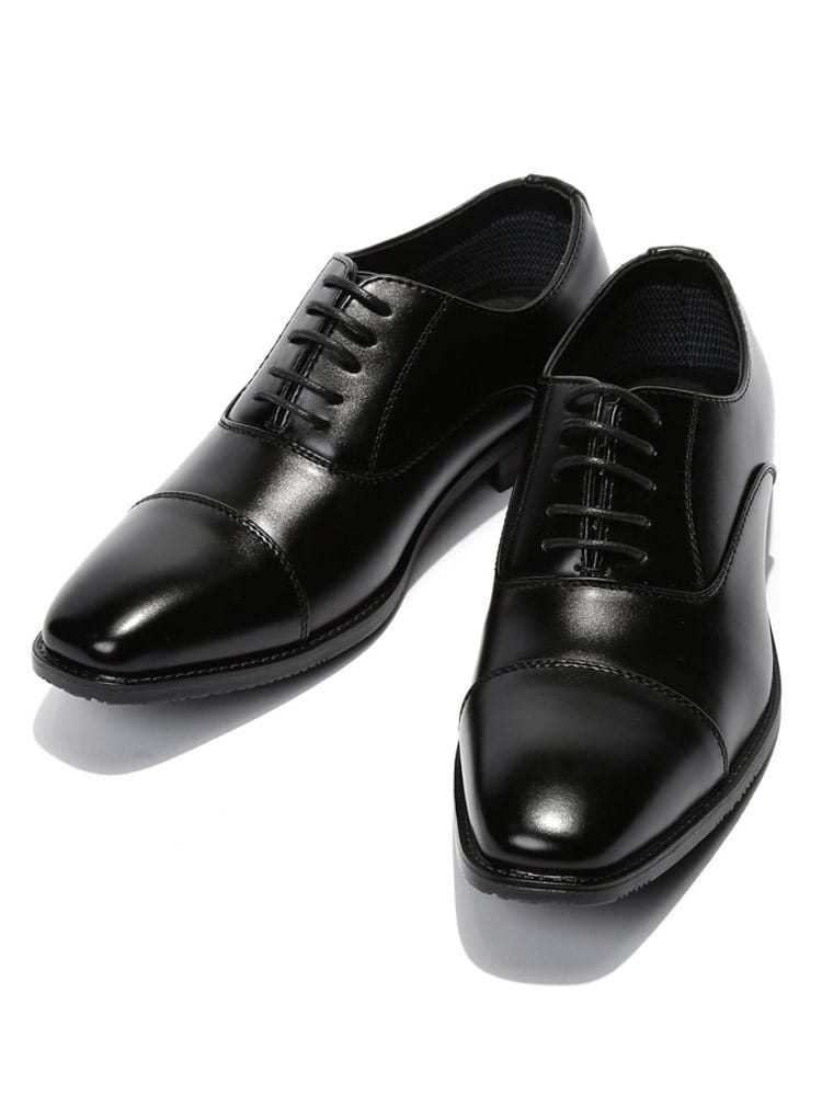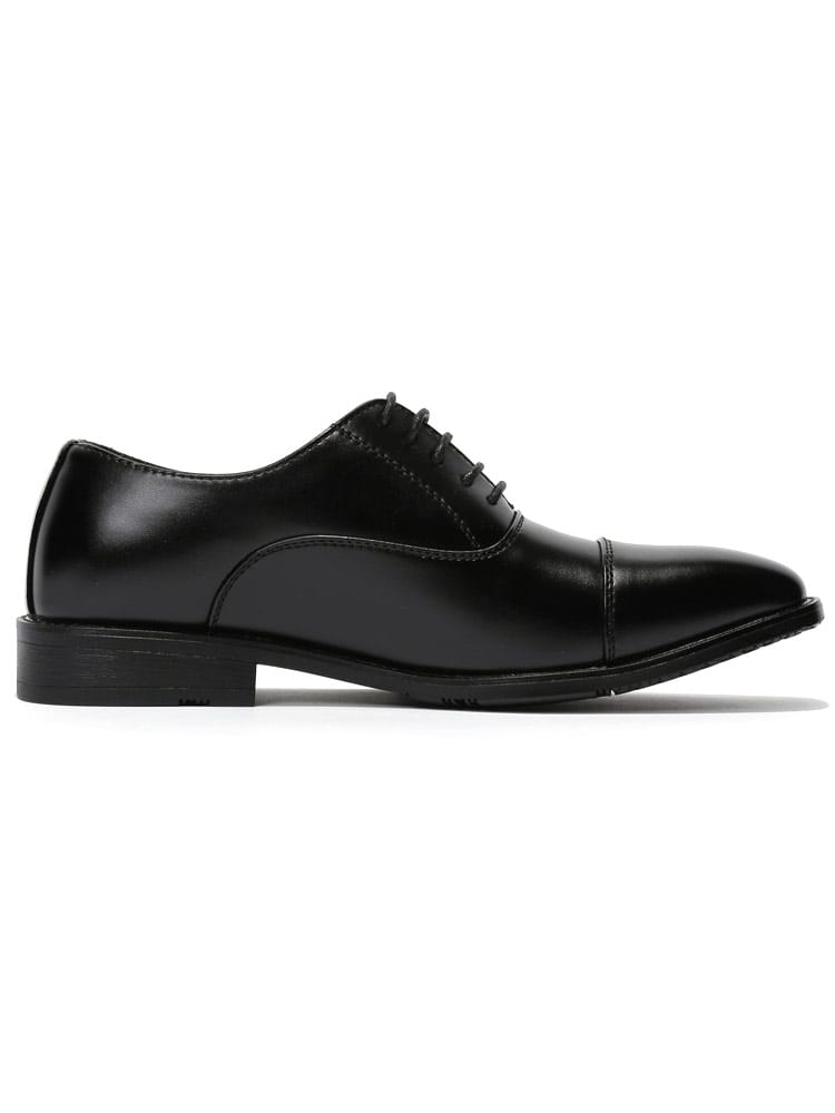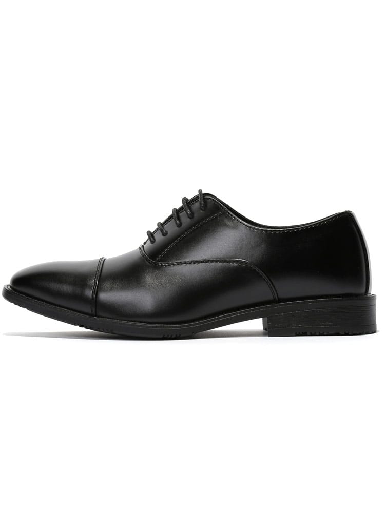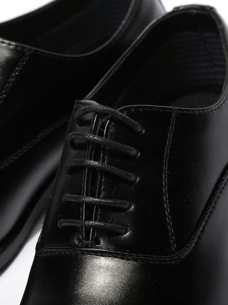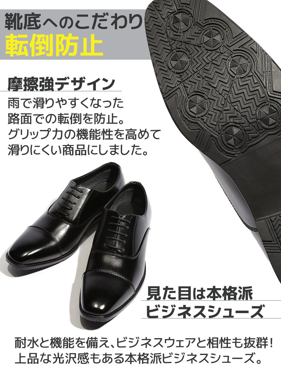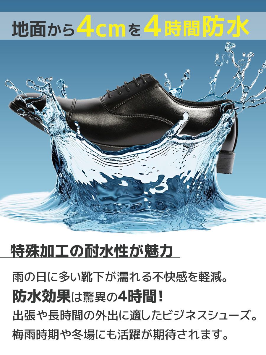 ビジネスシーンやフォーマルシーンにオススメな内羽根式のビジネスシューズ。ストレートチップで仕上げ、クラシカルな印象。フェイクレザーを使用し、4時間防水(地面から4cm)のウォータープルーフ機能を搭載しているので天候を気にせずに履いていただけます。