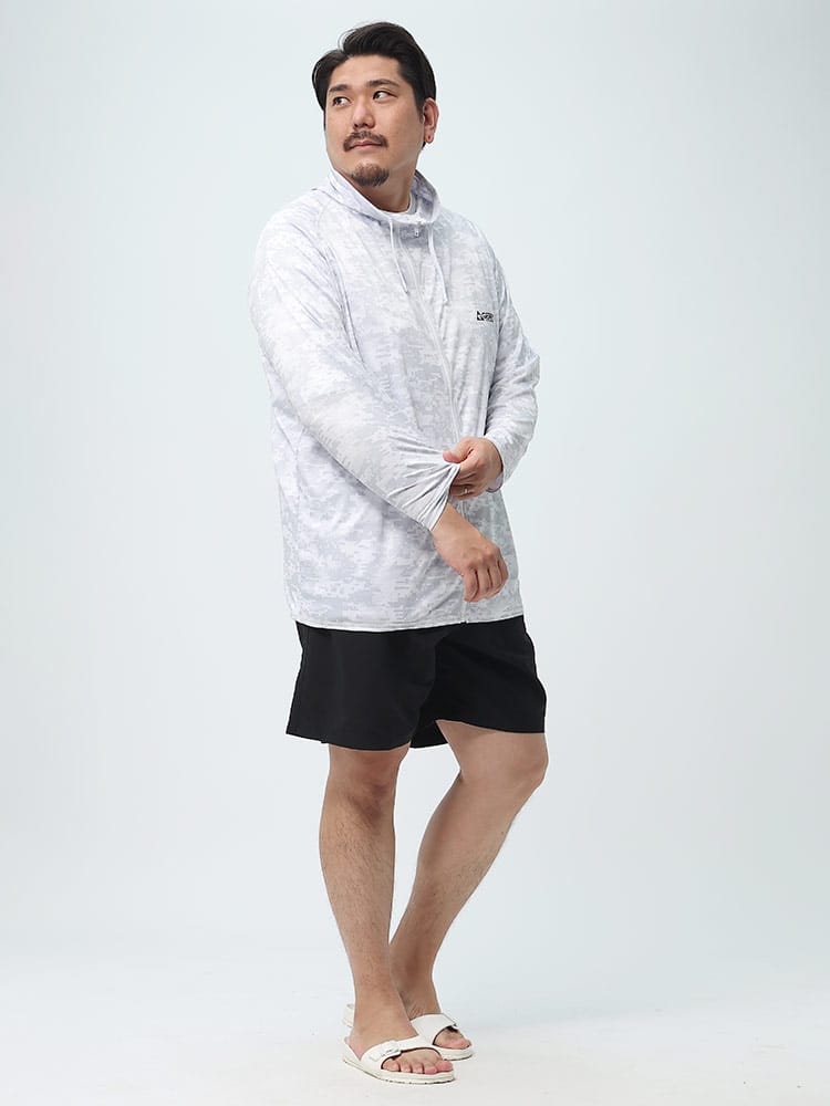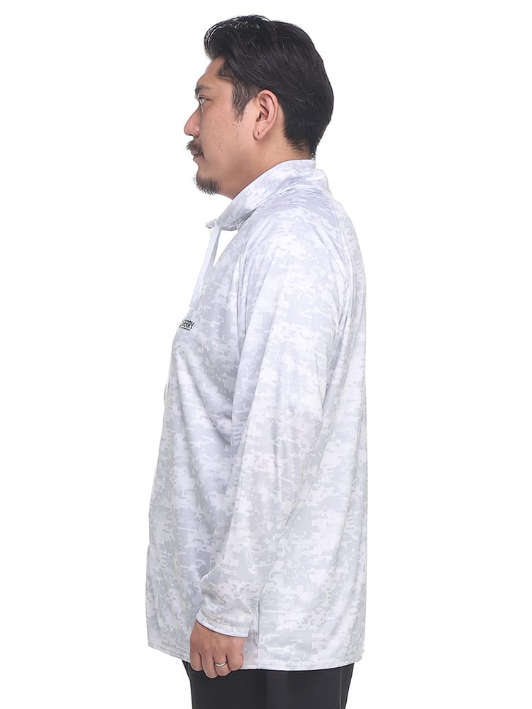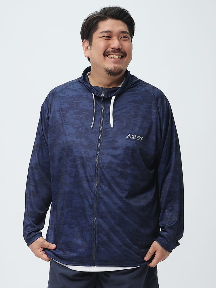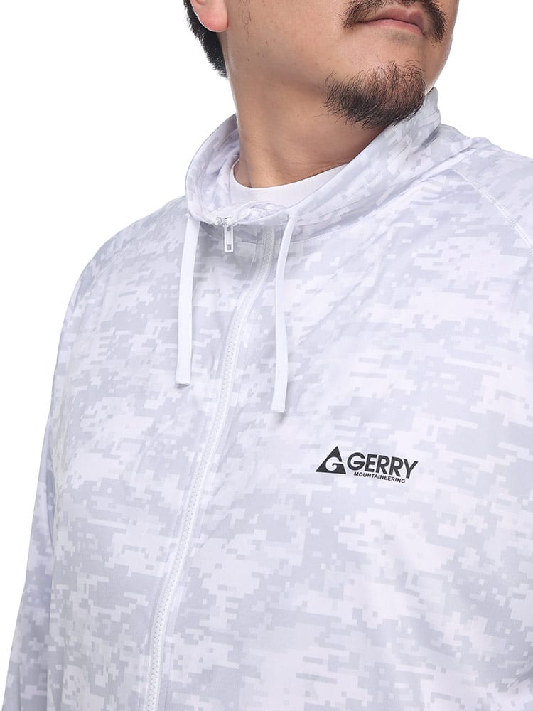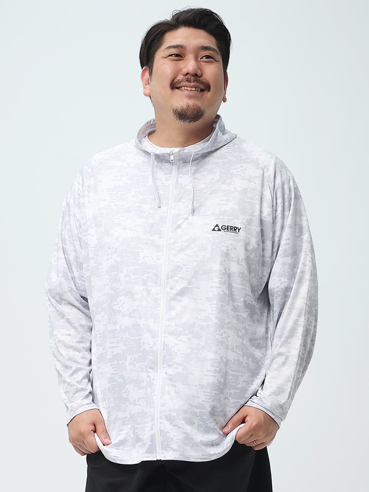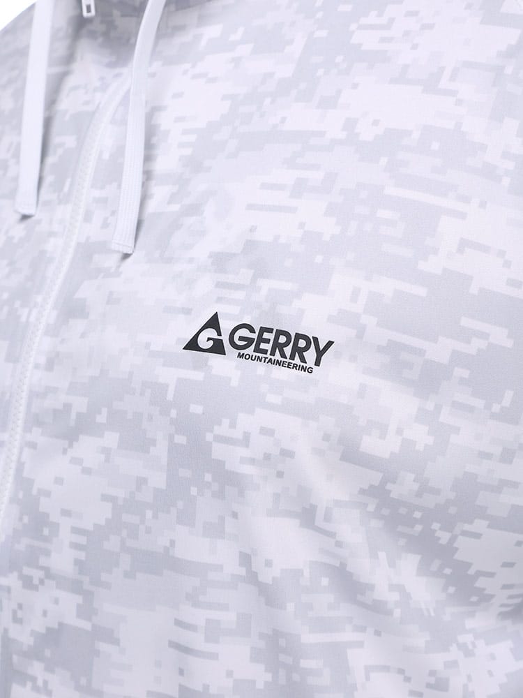 GERRYのUVカット 迷彩 フルジップ 長袖 ラッシュガードです。スタンドカラータイプでドローコード付きのラッシュガードです。全身にデジタルカモフラージュを配した、グラフィカルなシルエットとなっています。UVカット機能により、紫外線を90%以上カットしてくれます。