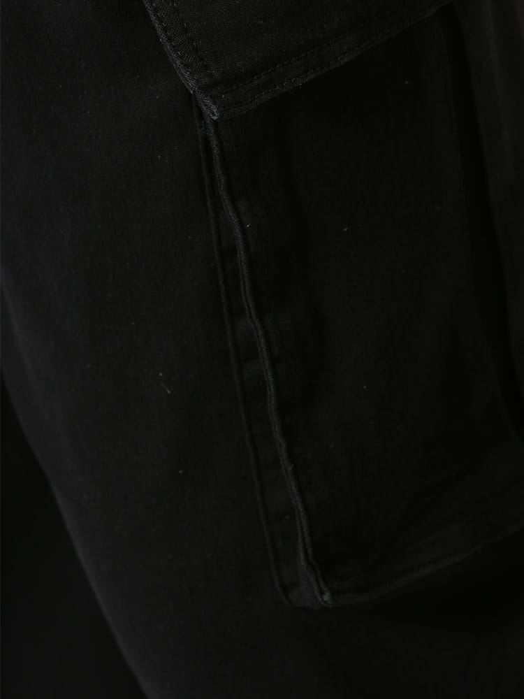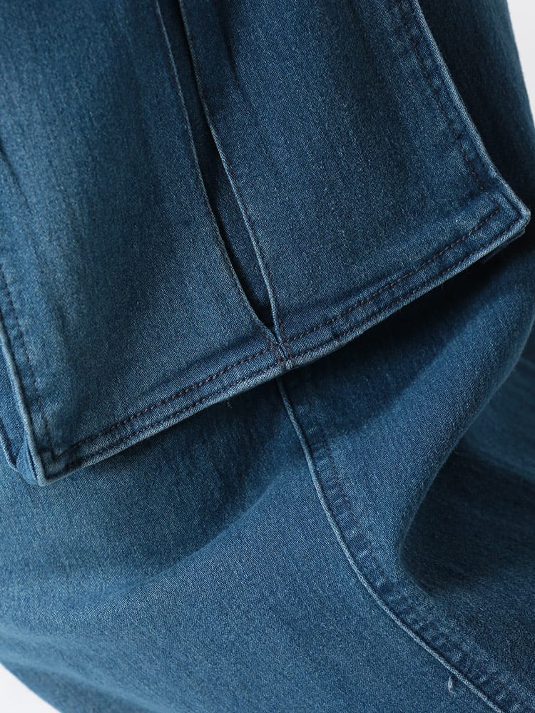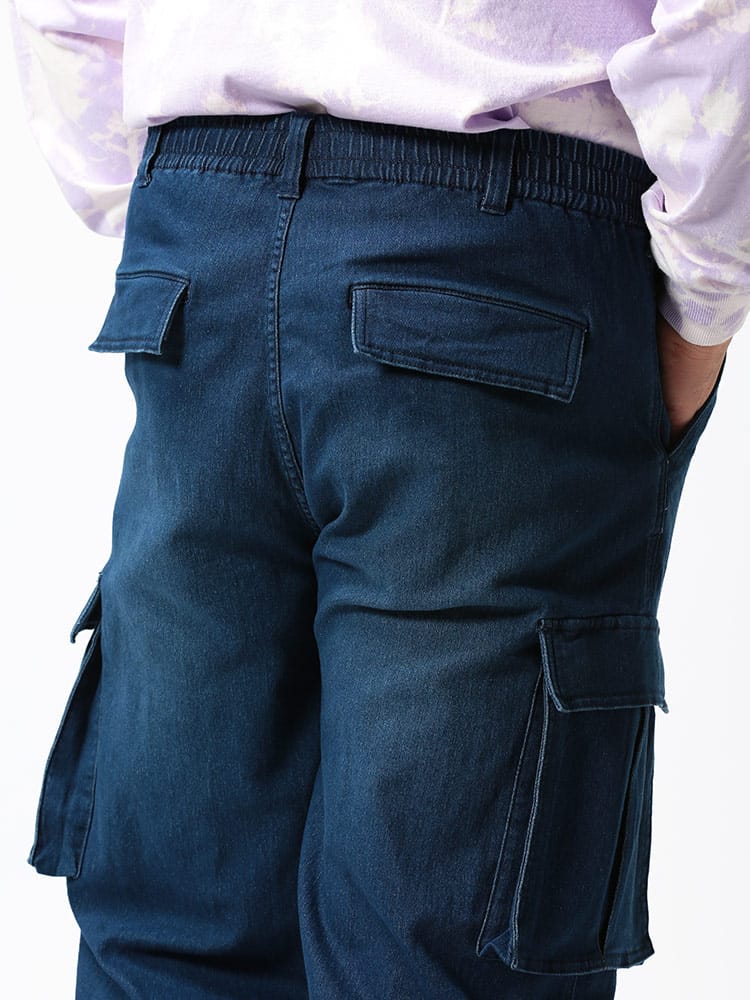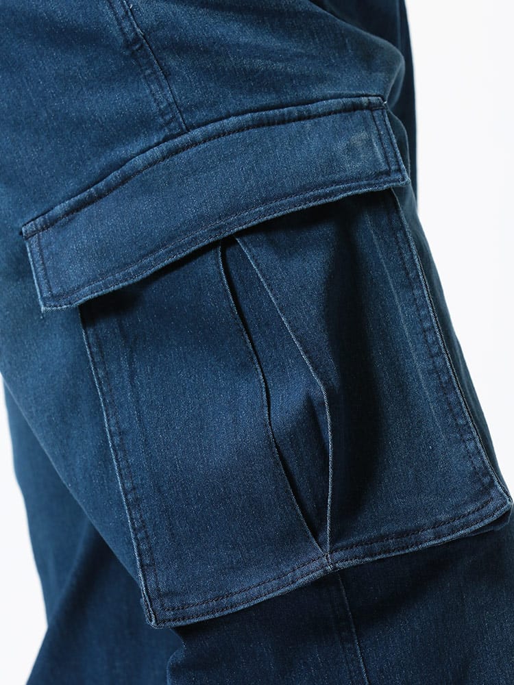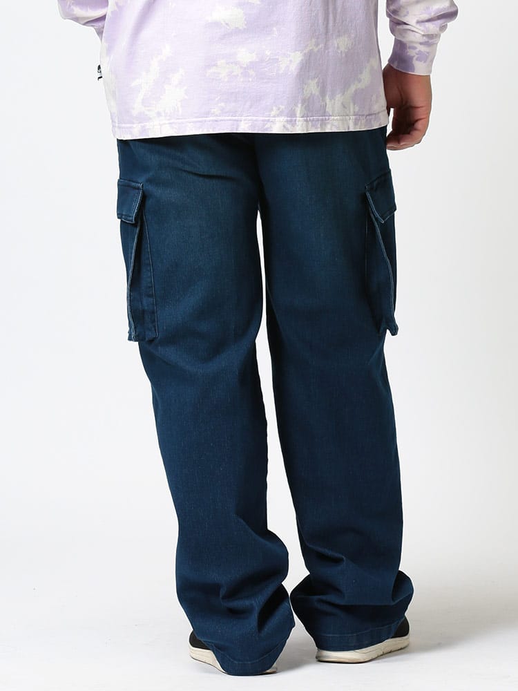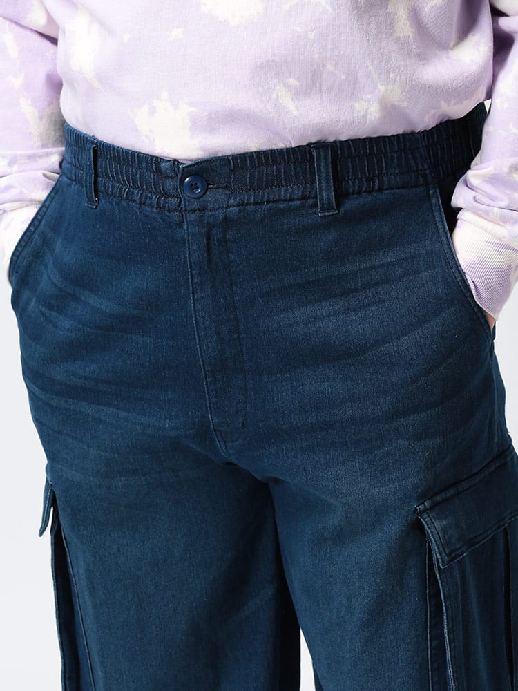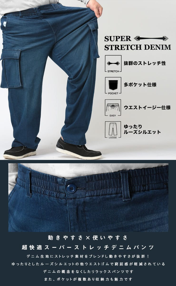 スーパーストレッチのデニムを使用したウエストゴム デニム イージー カーゴパンツです。足のサイドのポケットがポイント。伸縮性抜群なデニムで快適な着用感です。ウエストはゴムとドローコード付きでサイズ調整が出来ます。無地のデザインで幅広いコーデにマッチします。
