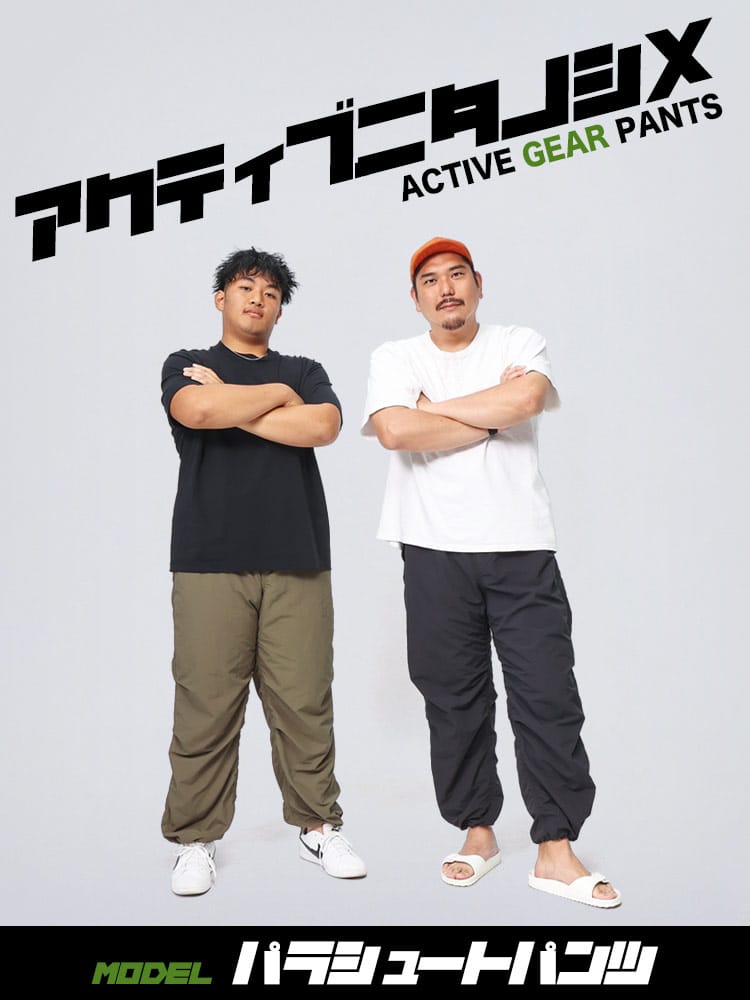 | モデルデータ | カーキ:身長:180cm / B:117 / W:110 / H:122 / S:28.0cm |
