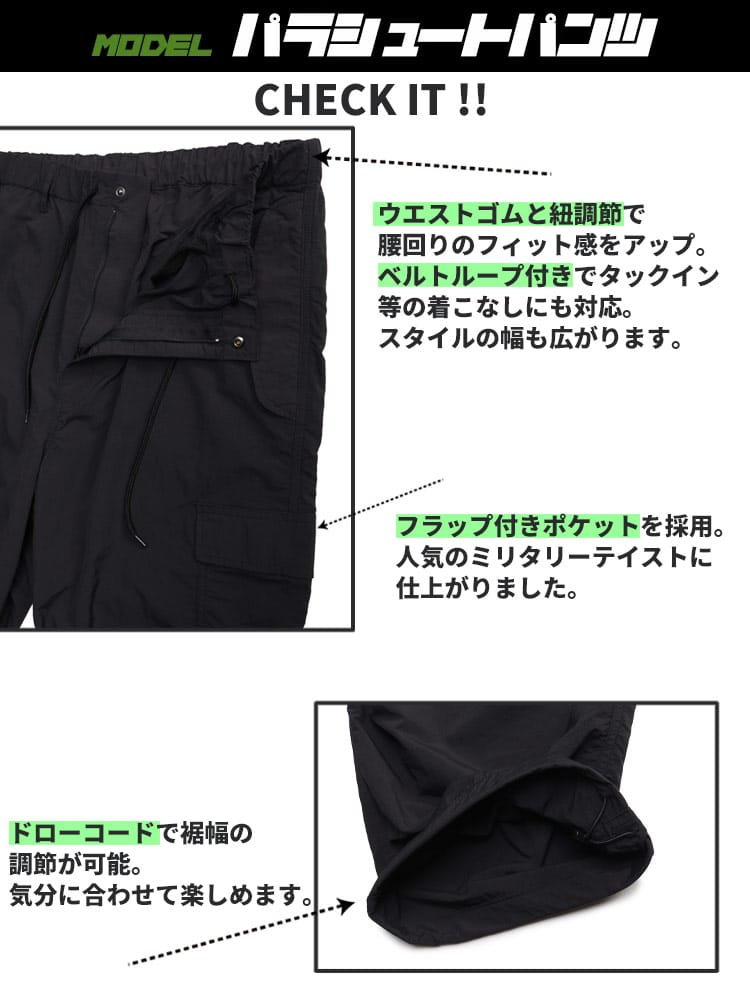 アクティブな日々をサポートするB&T CLUBのドライナイロンパラシュートカーゴパンツは、動きやすさとスタイルを兼ね備えたアイテムです。