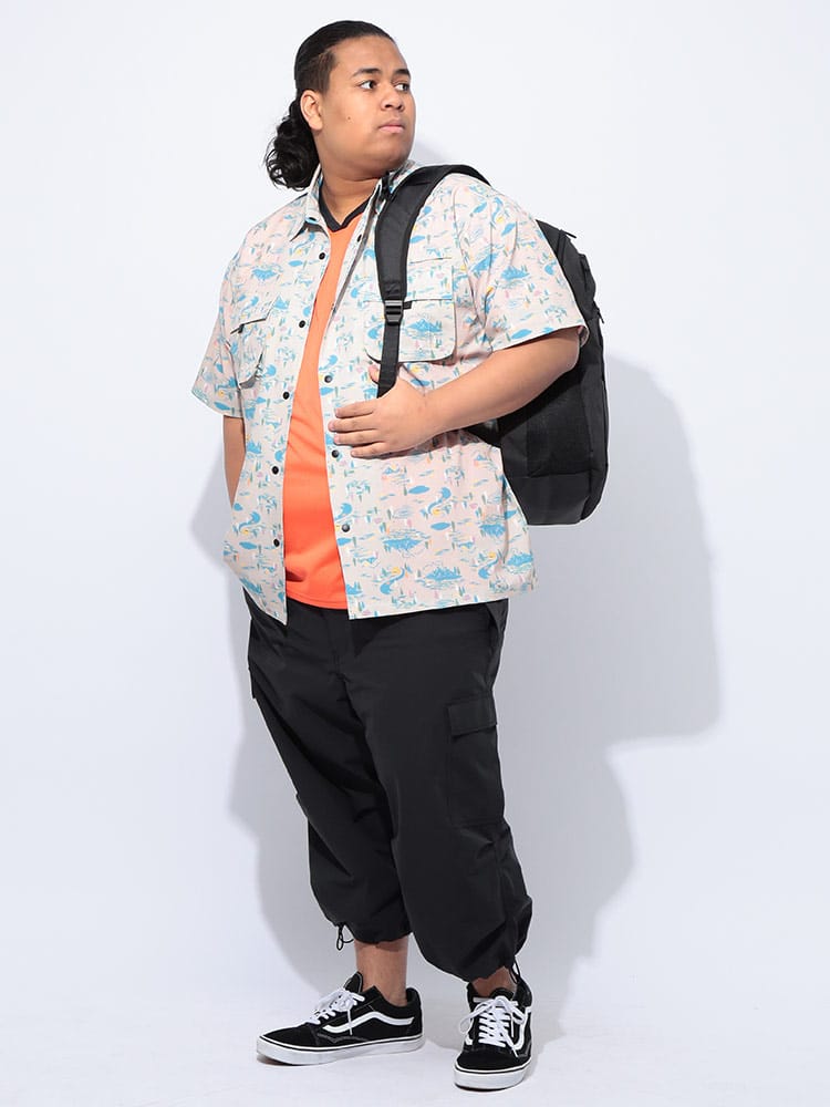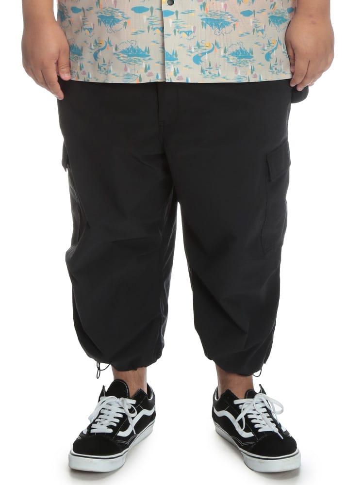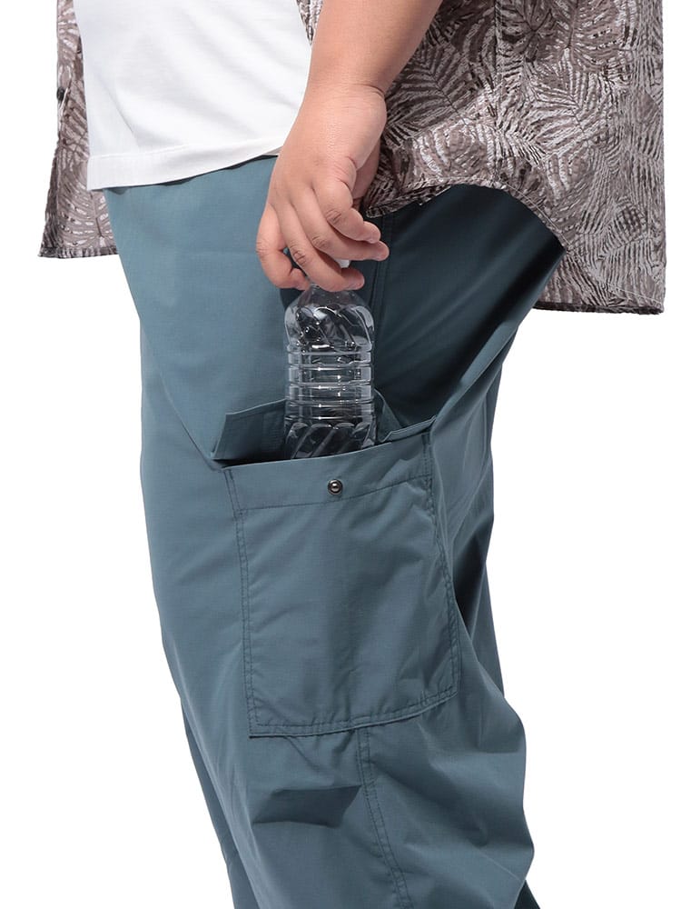 ミリタリースタイルを現代的にアップデートした、大きいサイズのメンズにぴったりのアイテムです。デザインは、パラシュートパンツの特徴的なディテールである多数のフラップポケットが目を引きます。ミリタリー由来の無骨さを残しつつも、7分丈にすることで軽快な印象に。裾のドローコードでシルエットを調整できるのもポイントです。カラーは、都会的なダークグレーと定番のブラックの2色展開で、様々なスタイルに合わせやすいのが魅力です。素材は、ポリエステル100%。軽量で耐久性に優れており、シワになりにくいのが特徴です。速乾性も高いため、汗ばむ季節も快適に過ごせます。サイズは、X1(3L~4L相当)~X4(8L~9L相当)までと、大きいサイズ専門店ならではの豊富な展開。ゆったりとしたシルエットで、リラックス感のある着心地です。機能面も充実しており、外側ポケットは5つ。スマホや小物などを分けて収納できます。ウエストは調節ゴム仕様で、快適なフィット感を実現。ジップフライで着脱もスムーズです。