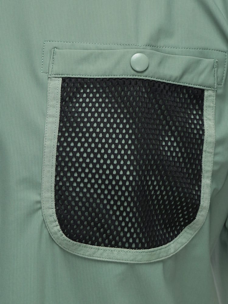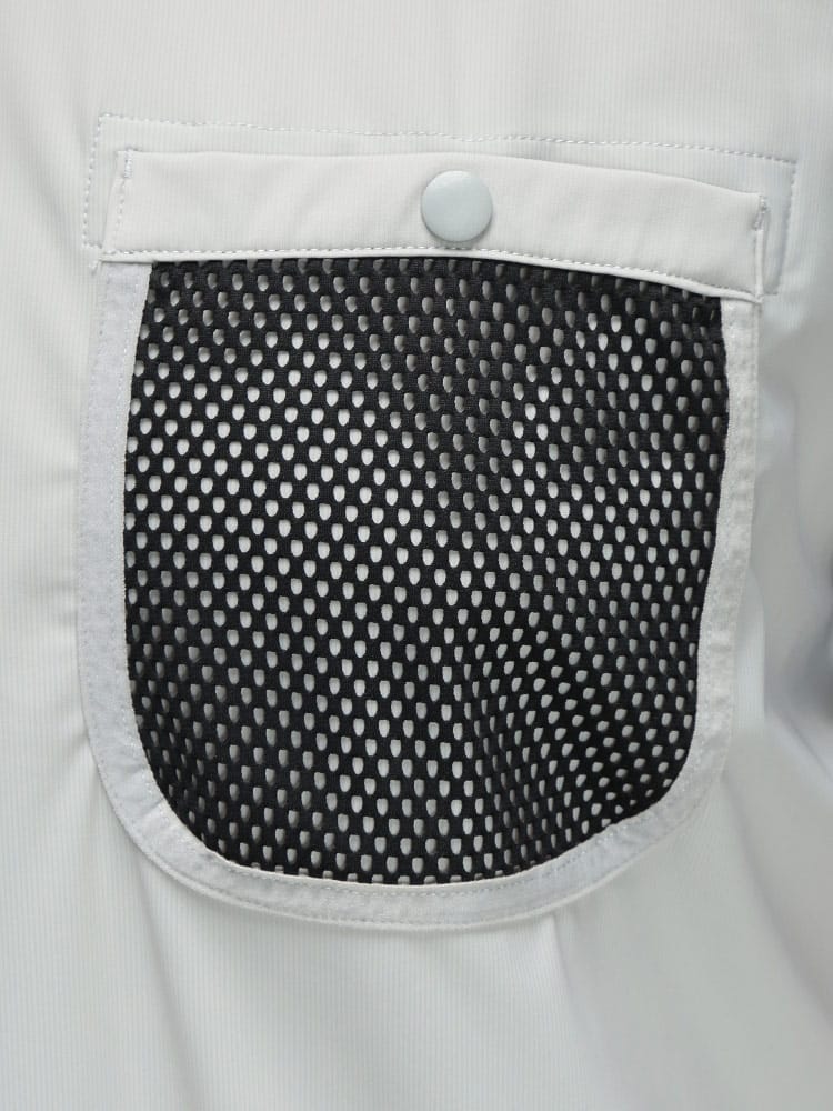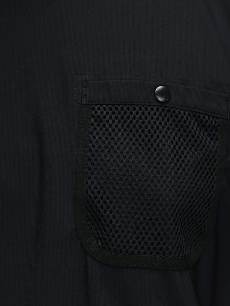 裾にはシルエットを調整できるドローコード、胸元には通気性に配慮したメッシュポケットを採用し、デザインと機能性を両立した一枚です。