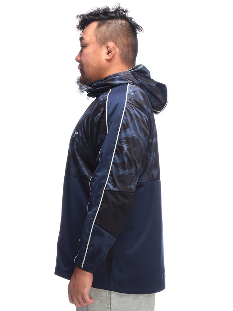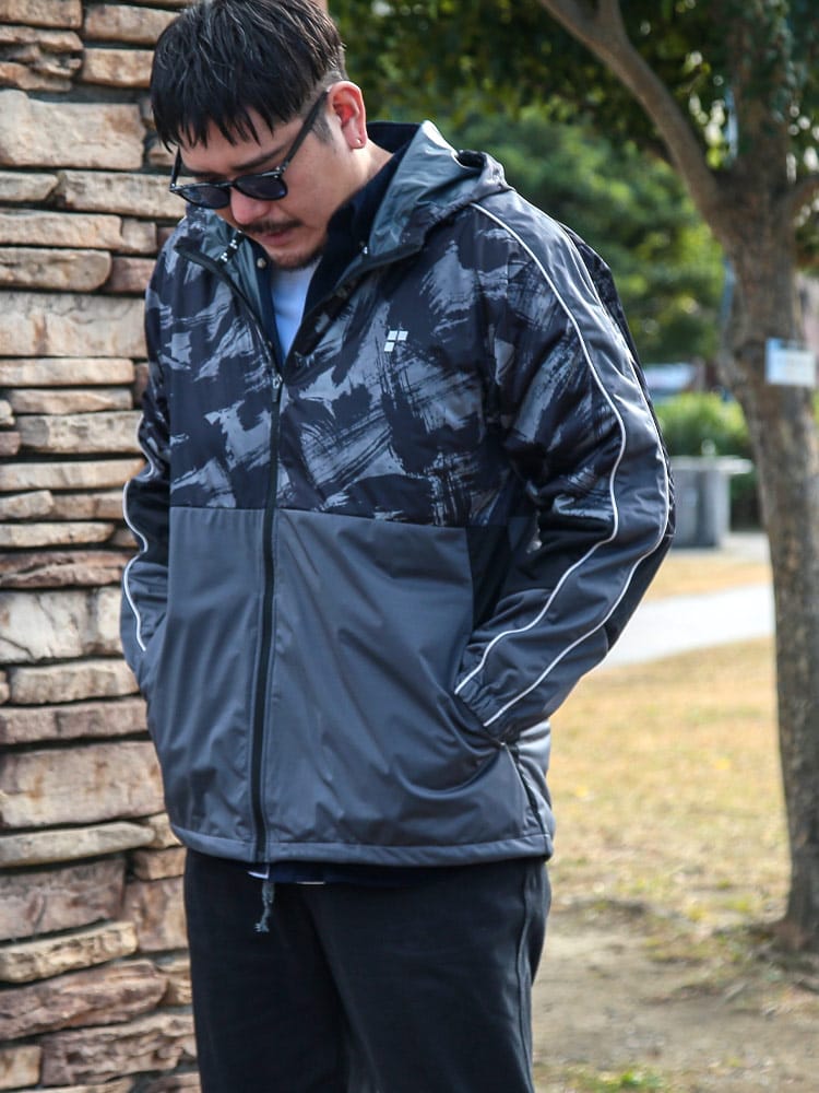 風を操る、ストレスフリーな快適アウター! EXCELLENT FINEから、高い機能性とデザイン性を融合させたナイロンパーカーブルゾンが登場です。特殊なWIND BLOCK(防風)機能を搭載した生地が、冷たい風の侵入をシャットアウト。さらに、驚異的なストレッチ性を兼ね備えているため、スポーツやアクティブな動きにも完璧にフィットし、着ていることを忘れるほどの快適さです。目を引く総柄デザインが、スポーティーな装いに洗練されたアクセントを加えます。裾のドローコードで冷気の侵入を防ぎながら、シルエット調整も可能。大きいサイズでも軽やかに着こなせるこの一着は、タウンユースからアウトドア、そしてゴルフなどのスポーツシーンまで幅広く活躍する、高性能なライトアウターです!