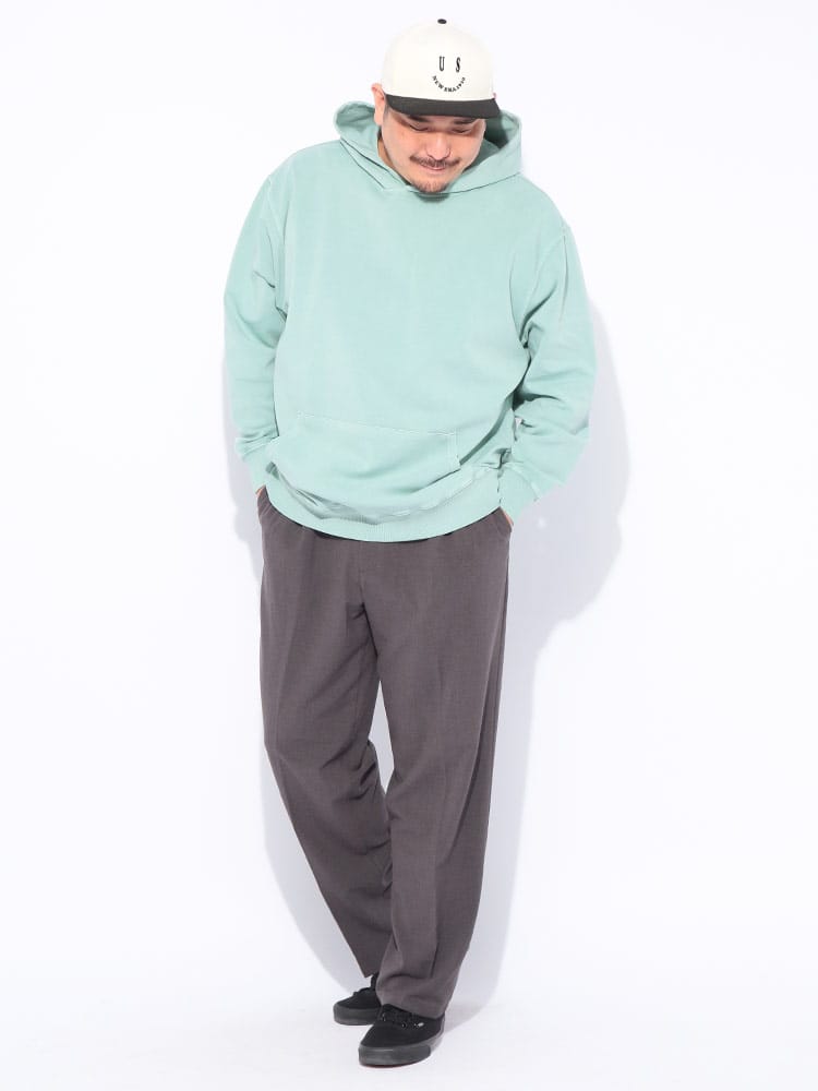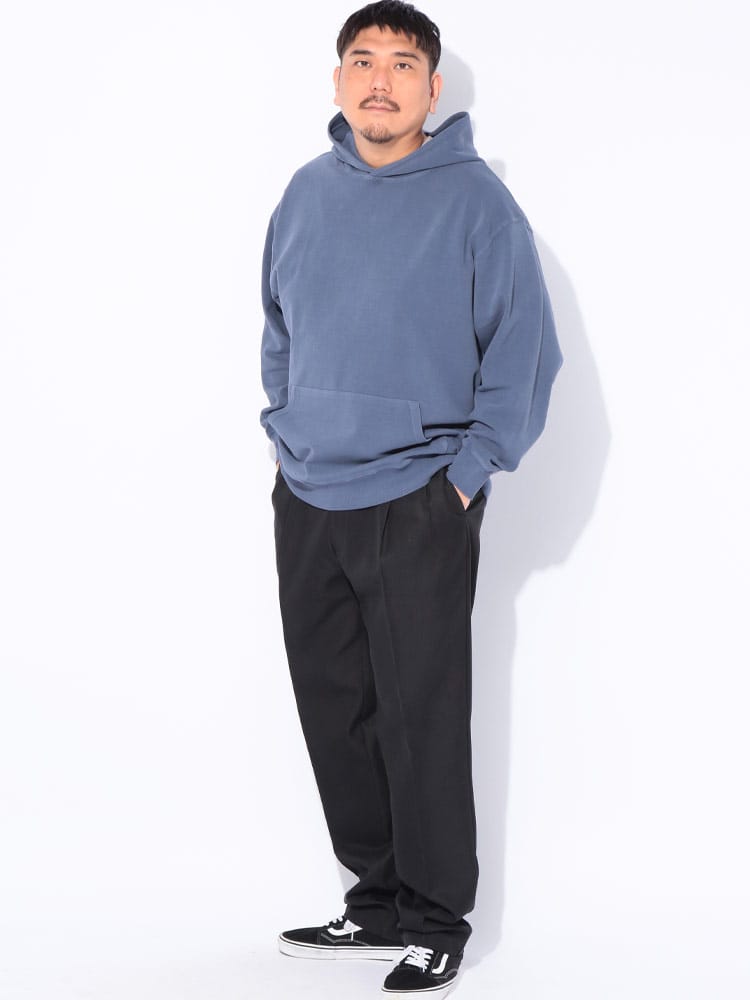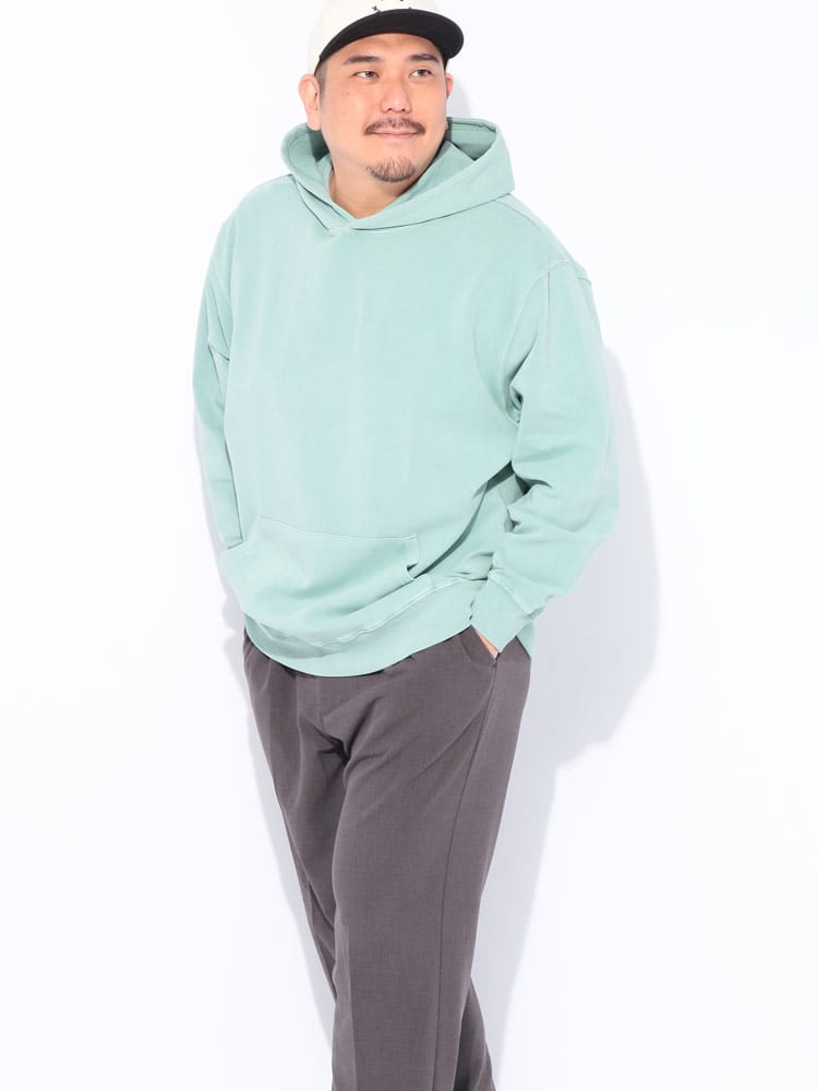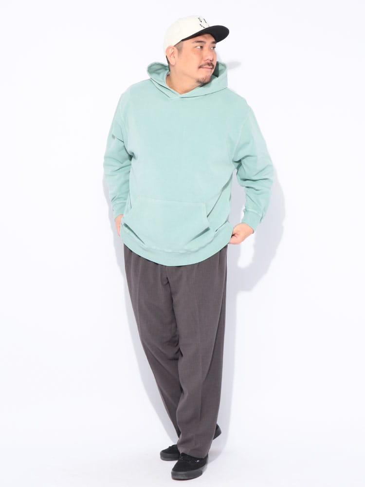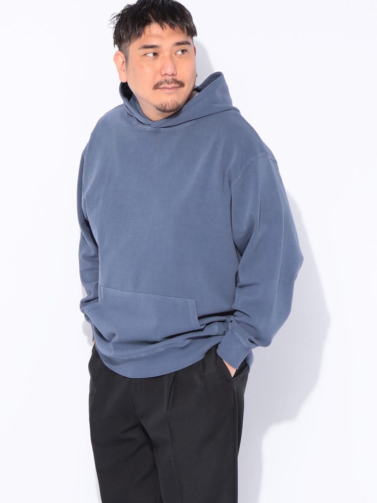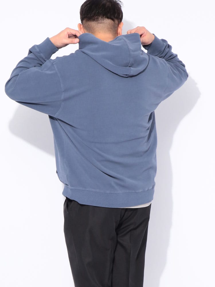 ヴィンテージ風の色合いが魅力のピグメント加工を施した、B&T CLUBのプルオーバーパーカーです。滑らかでハリのあるポンチ素材を採用し、ラフな風合いの中に上品さを両立させました。伸縮性に優れシワになりにくく、着心地も快適。立体感のあるフードが顔周りのアクセントになります。シンプルな無地で合わせやすく、大人のカジュアルコーデを格上げする一着です。