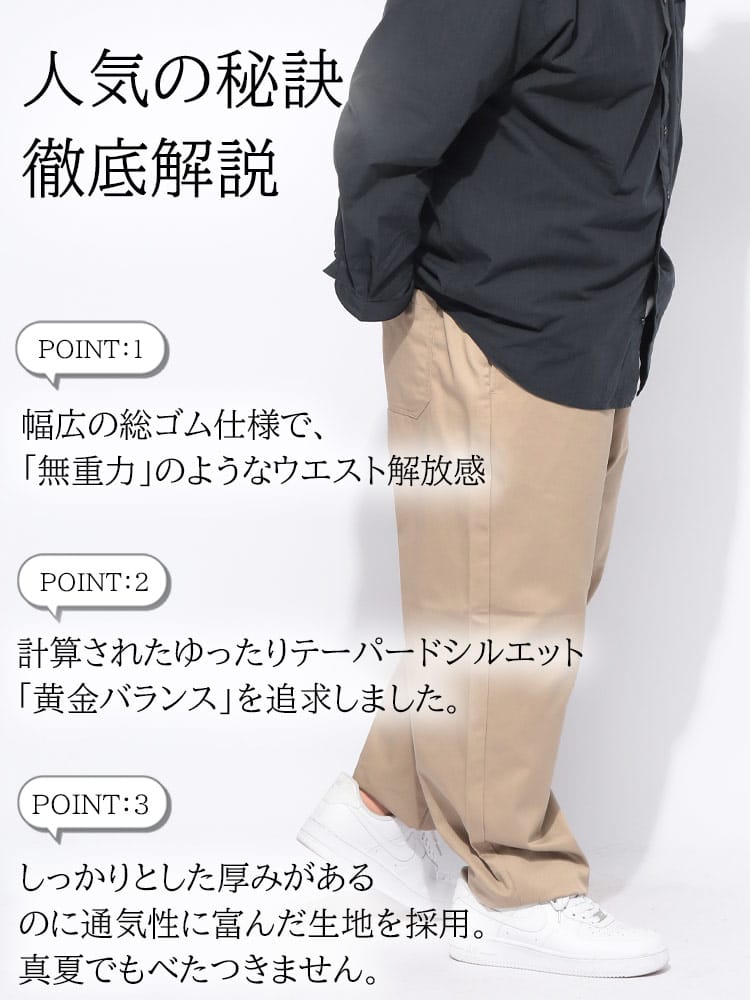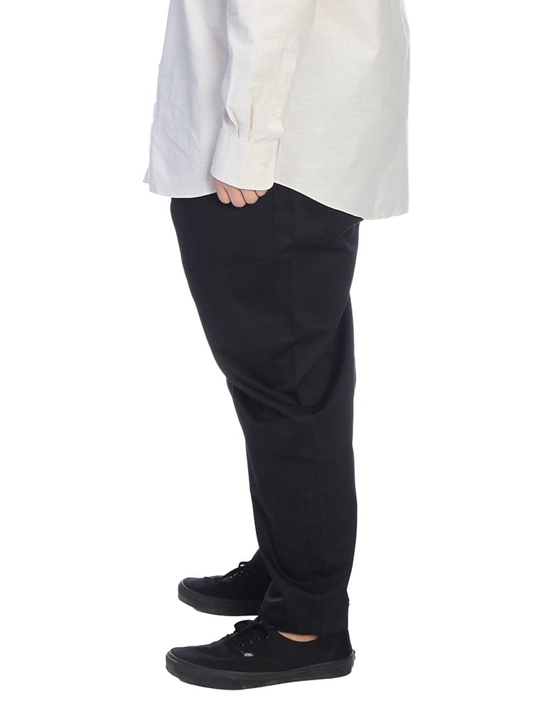 「B&T CLUB」から、快適さと旬のスタイルを両立した、無地タイプのドライシェフパンツをご紹介します。仕事着をルーツに持つシェフパンツならではの動きやすさはそのままに、汗をかいても肌に張り付きにくいドライ機能を搭載。蒸し暑い季節でもサラリとした清潔感のある着心地が持続します。腰回りにたっぷりとゆとりを持たせたワイドシルエットながら、裾に向かって緩やかに絞ることで、大きいサイズの方が履いても足元が重たく見えず、スマートな印象を与えます。どんなトップスとも相性が良いシンプルな無地デザインは、着回し力も抜群。ウエストゴムとドローコードによるイージー仕様で、長時間の移動やリラックスシーンでもストレスを感じさせない、日常使いに最適な一本です。