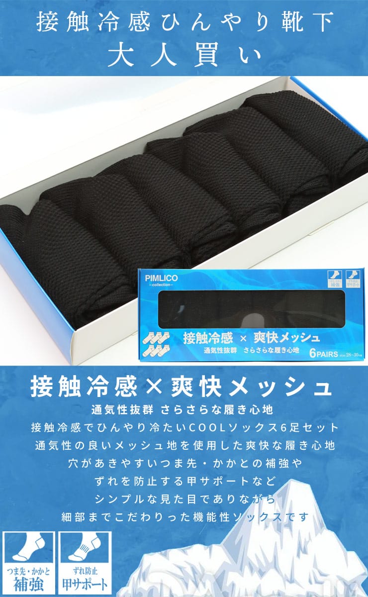 WEB限定で展開しているPIMLICOからお得な6足セットの無地 クォーターソックスの登場です。接触冷感×爽快メッシュで通気性抜群、さらさらな履き心地です。無地デザインでビジネスからカジュアルまで幅広くお使いいただけます。