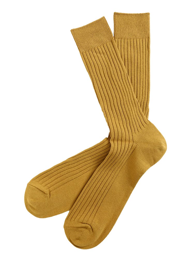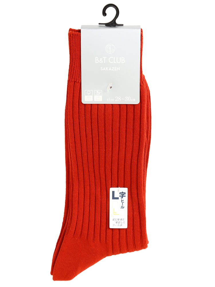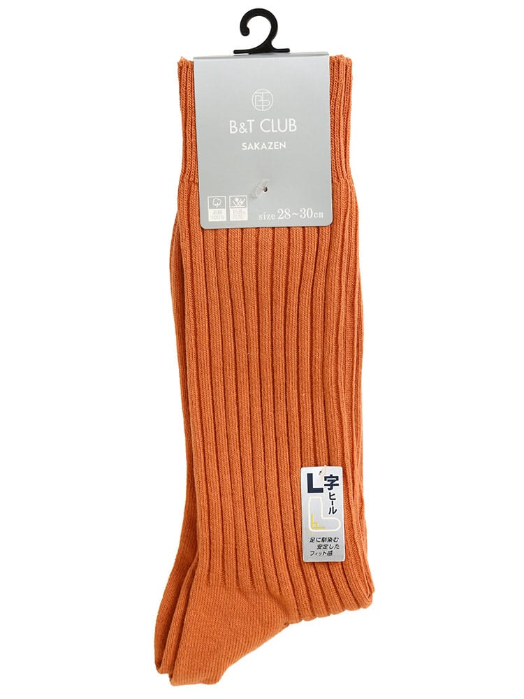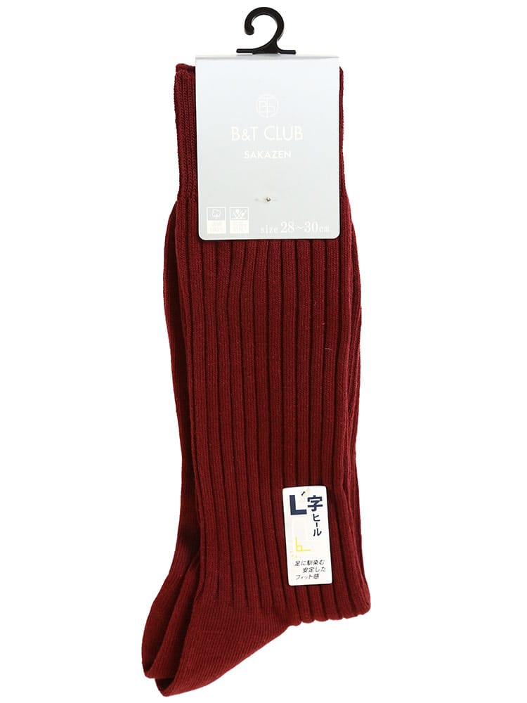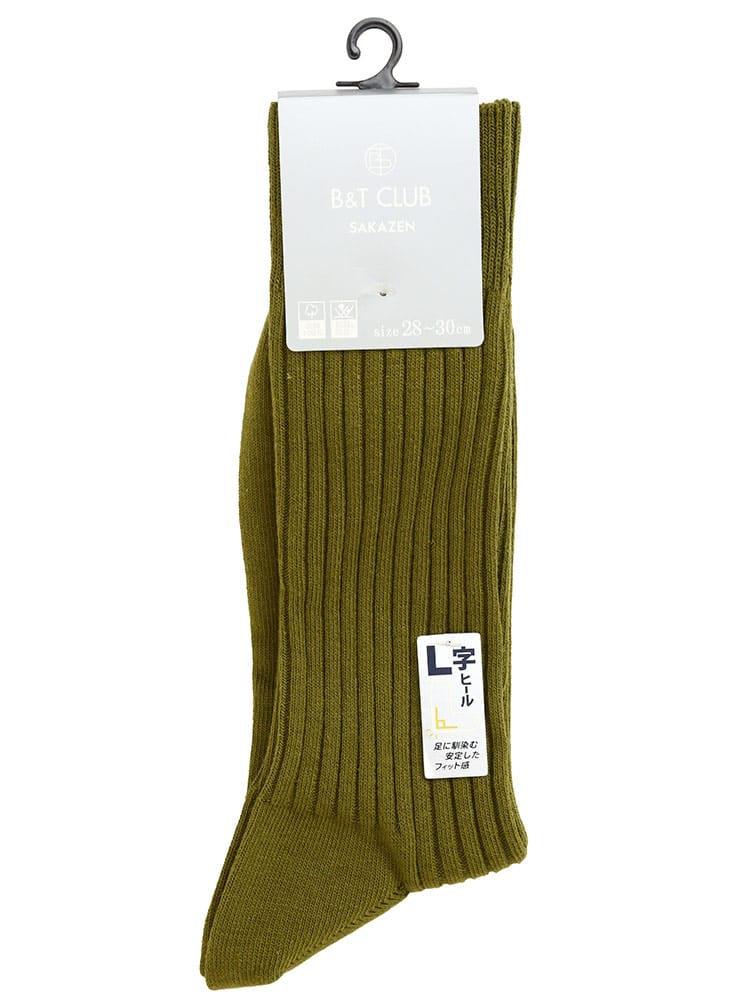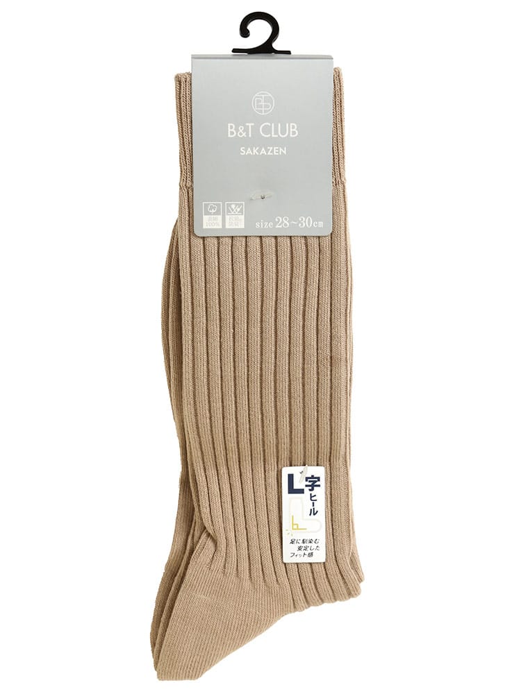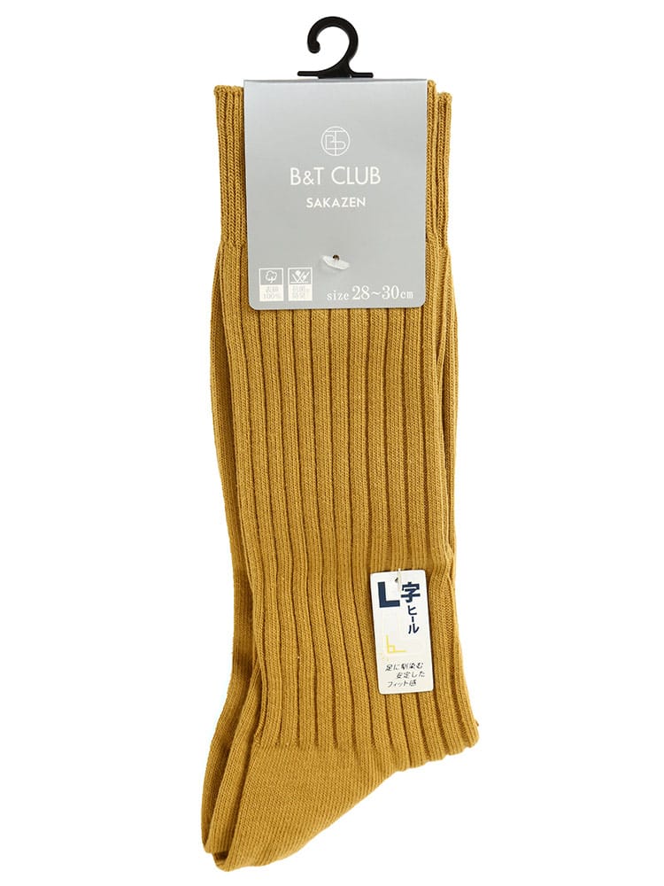 B&T CLUBの太リブ L字ヒールソックスです。ビジネスカジュアル問わず使える定番のシルエット。L字のヒールが足に馴染んで安定したフィット感のある履き心地。生地には抗菌防臭加工が施されています。