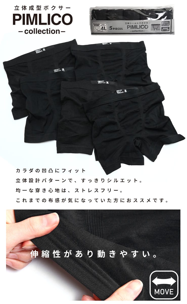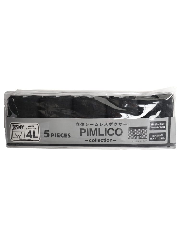 PIMLICOの無地 前閉じ ボクサーパンツ 5枚セットです。身体の凹凸にフィットする立体設計のパターンですっきりしたシルエット。均一なはき心地はストレスフリー。これまでの布感が気になっていた方におすすめのボクサーパンツ。フロントは前閉じタイプとなっています。立体設計: 身体にフィットし、動きやすい。スーパーストレッチ: 伸縮性に優れ、どんな動きにも対応。前閉じタイプ: 快適なフィット感。※ブラック5枚組は通気性の高いメッシュ素材を全面に使用しています。※ 衛生面の都合上、返品不可となりますのでご了承下さい。