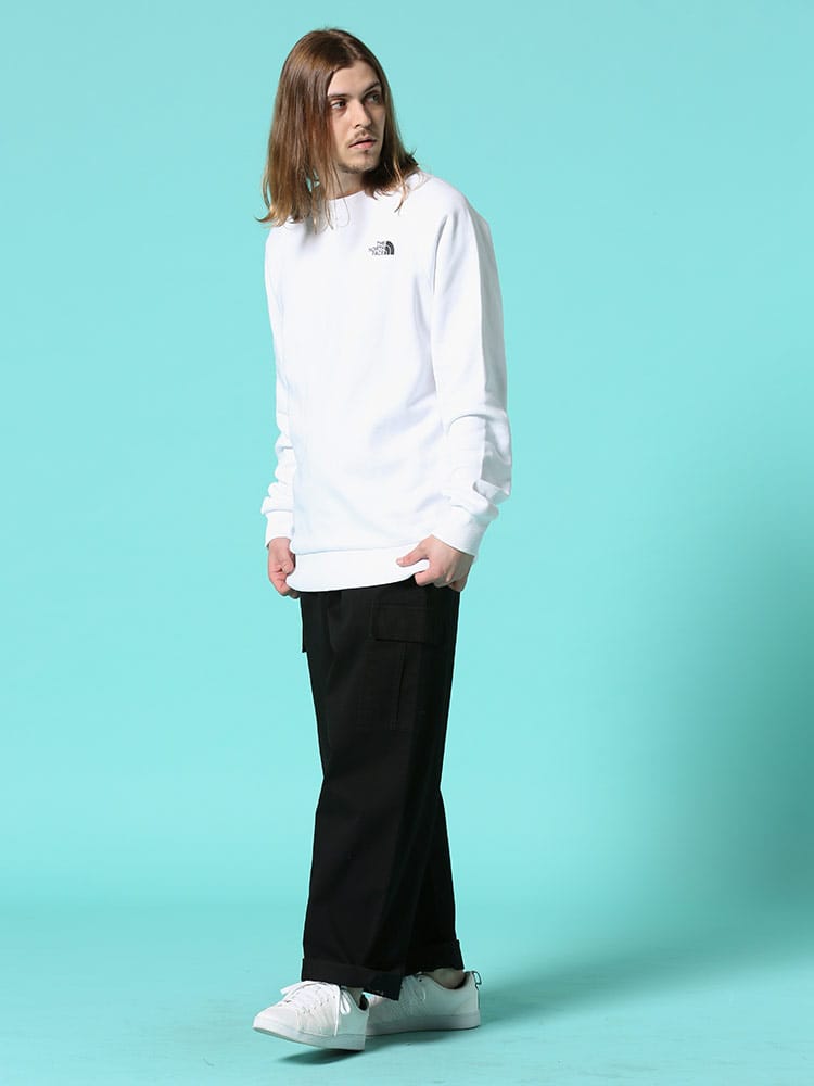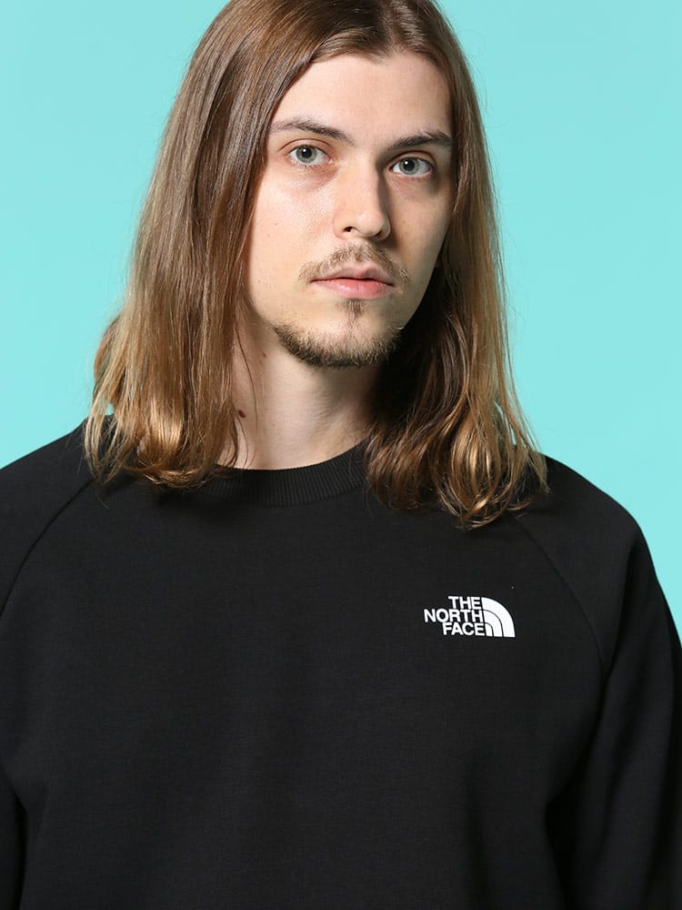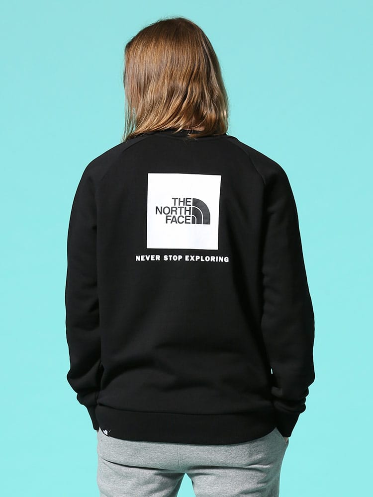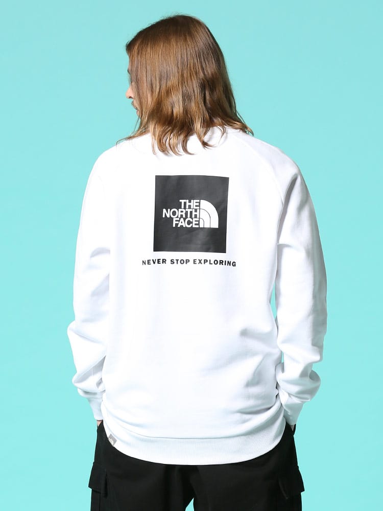 バックプリントが特徴的なTHE NORTH FACEのクルーネック 長袖 トレーナー RAGLAN REDBOX CREW EU。左胸のロゴプリントもポイント。首元はベーシックなクルーネック。袖、裾はリブデザイン。裏地は裏起毛で保温性に優れています。