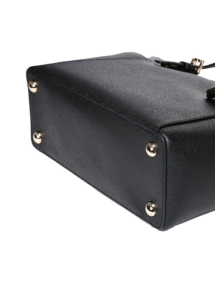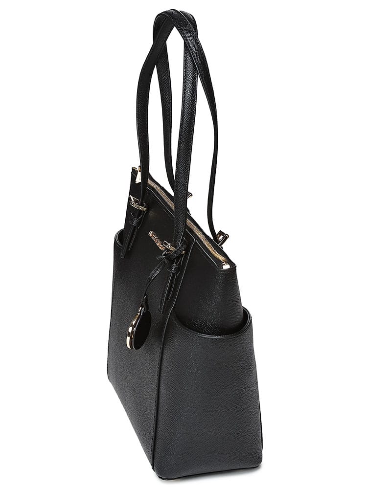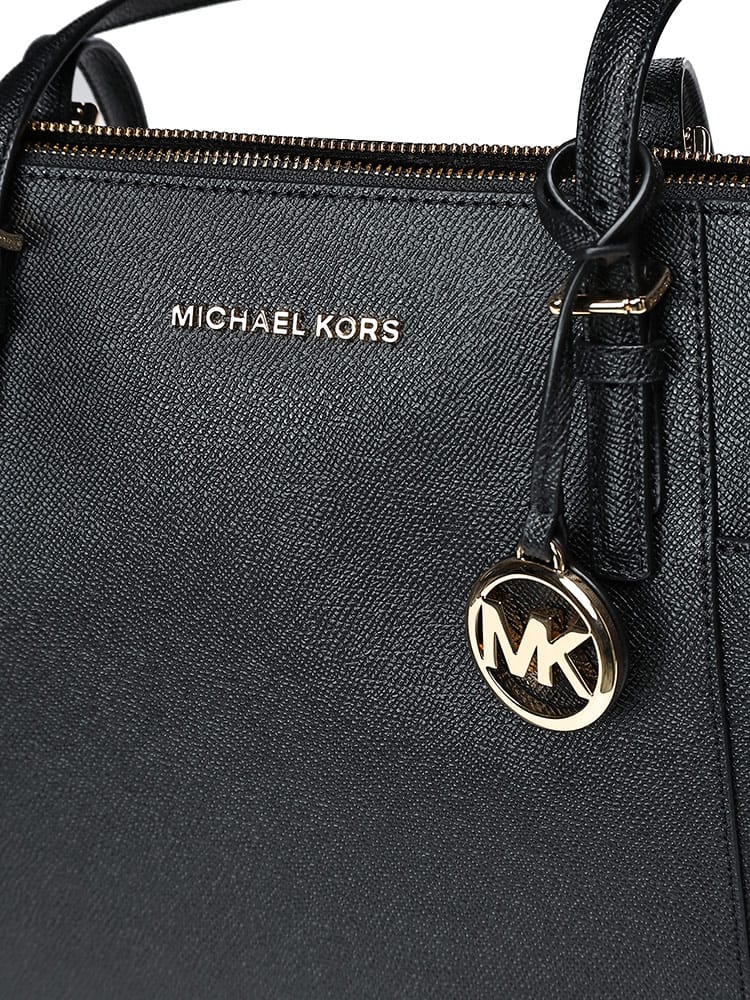 洗練されたデザインと機能性を兼ね備えた、マイケル・コースのレザーハンドバッグです。上質なレザーにMKチャームが上品なアクセントを添え、どんなスタイルにも合わせやすいブラックカラーが魅力。A4サイズも収納可能なメイン収納部はジッパー開閉式で安心。外側にはスマートフォンなどすぐに取り出したい小物を収納できるオープンポケットを2つ、内側にはジッパーポケットとオープンポケットを各1つ備え、収納力も抜群です。通勤や普段使いなど、様々なシーンで活躍するアイテムです。