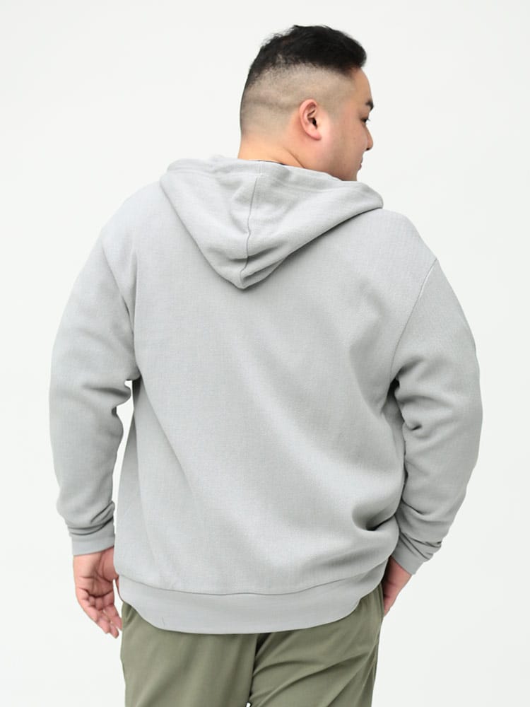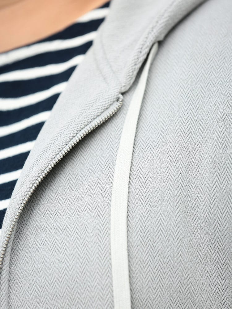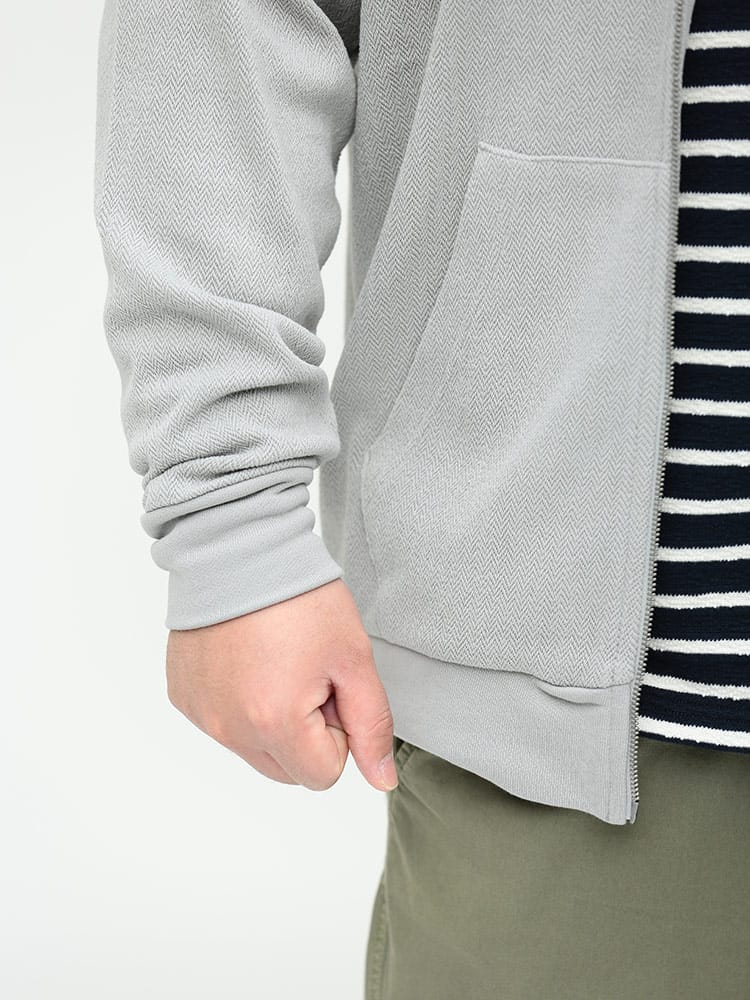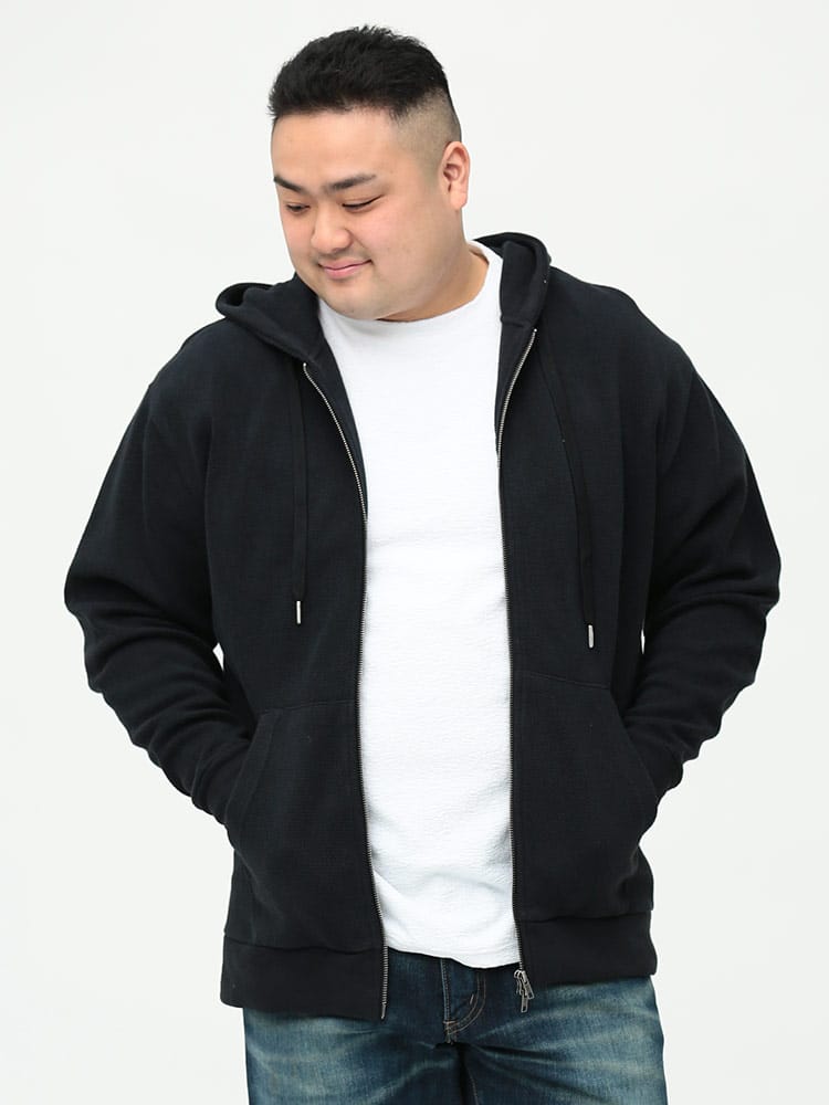 ジャガード地で仕上げたフード フルジップ 長袖 パーカーです。無地のベーシックなデザイン。フロントにポケット付き。ダブルジップ。袖、裾はリブデザイン。シンプルデザインでどんなアイテムともマッチします。