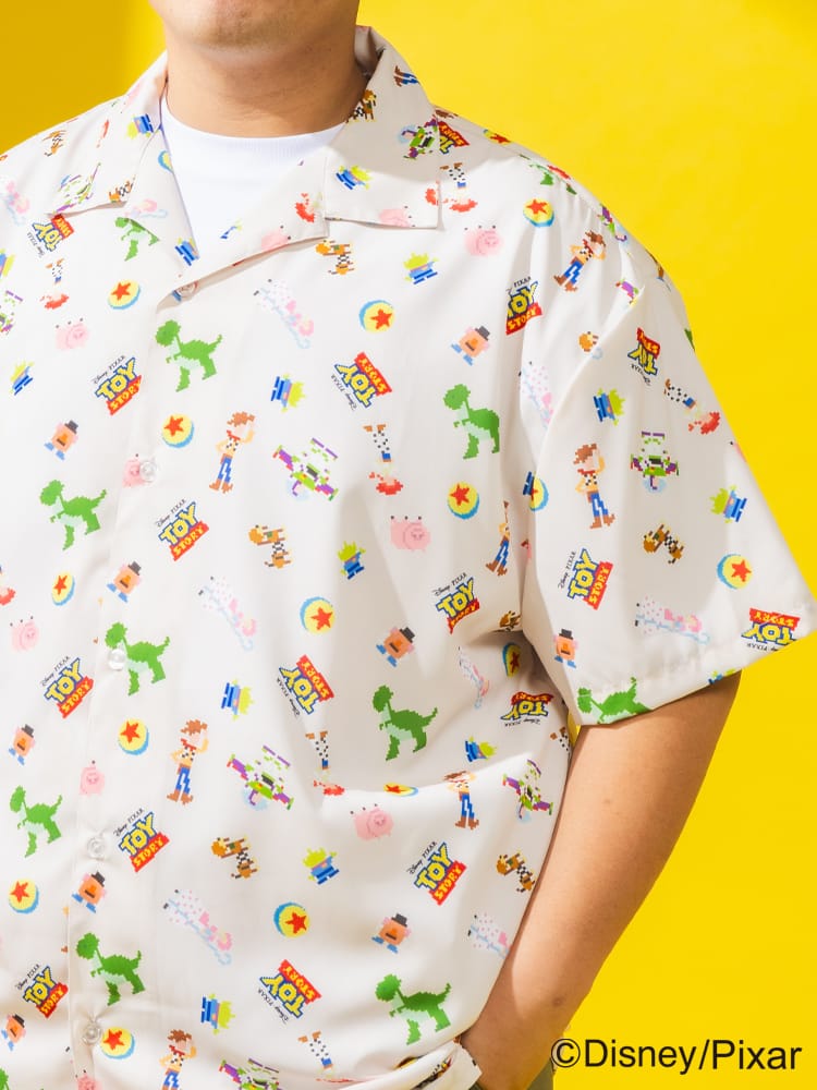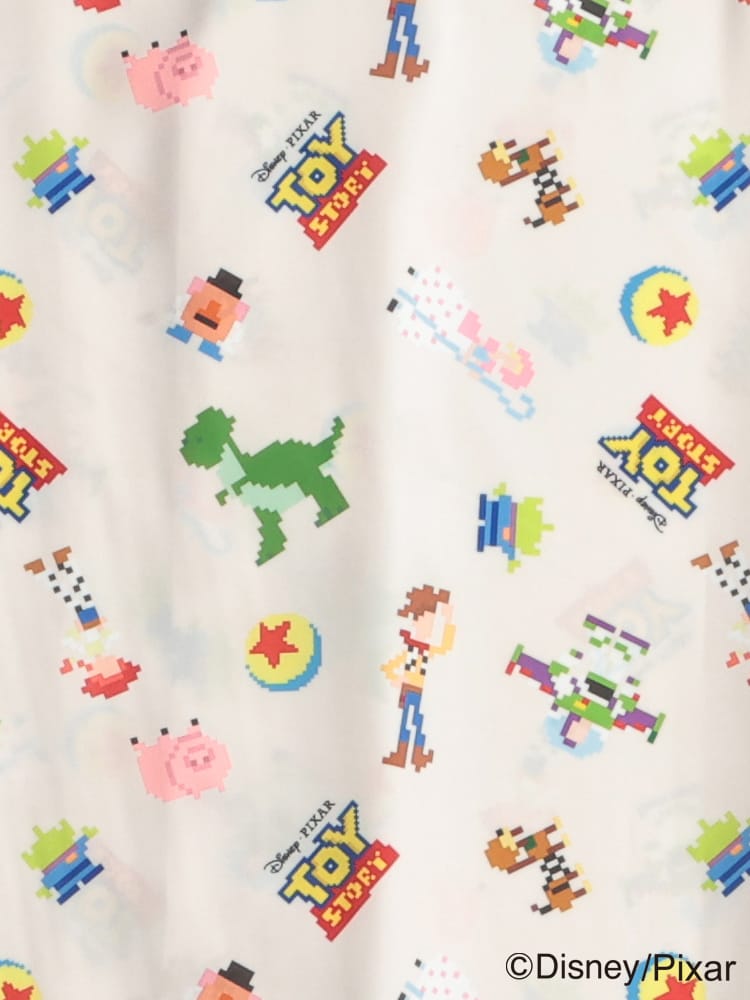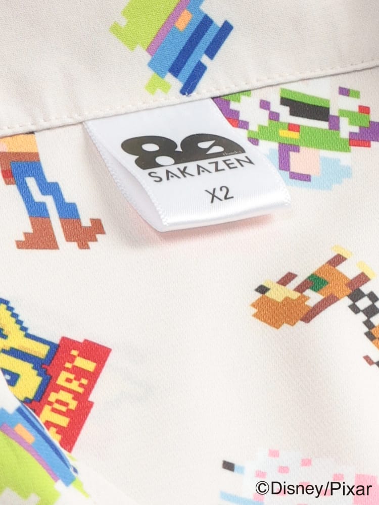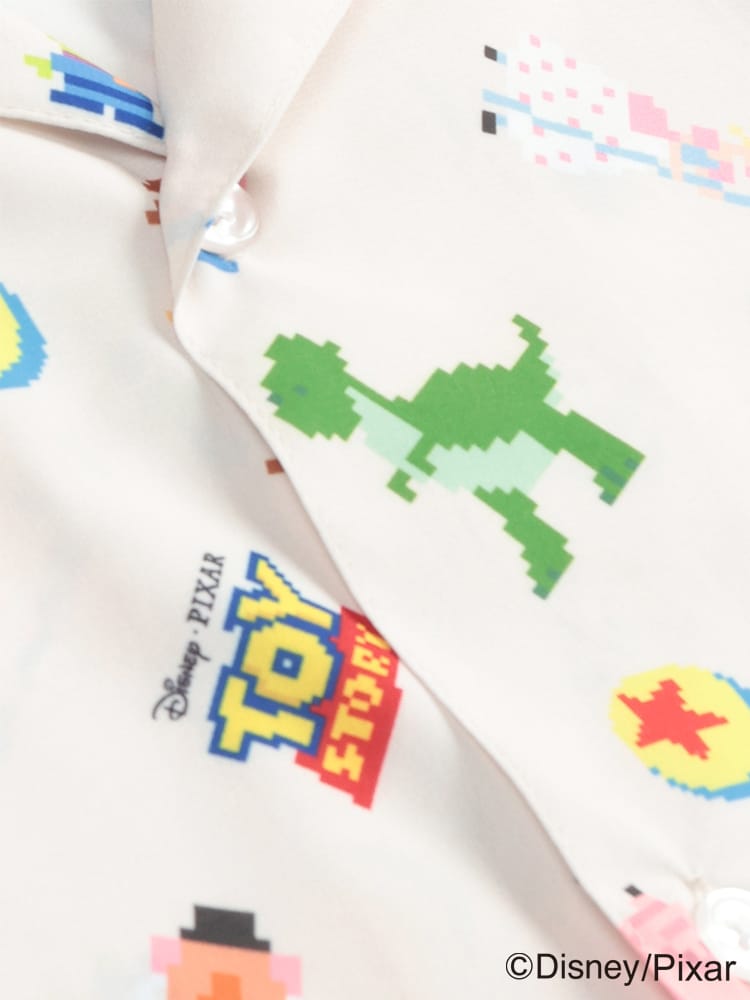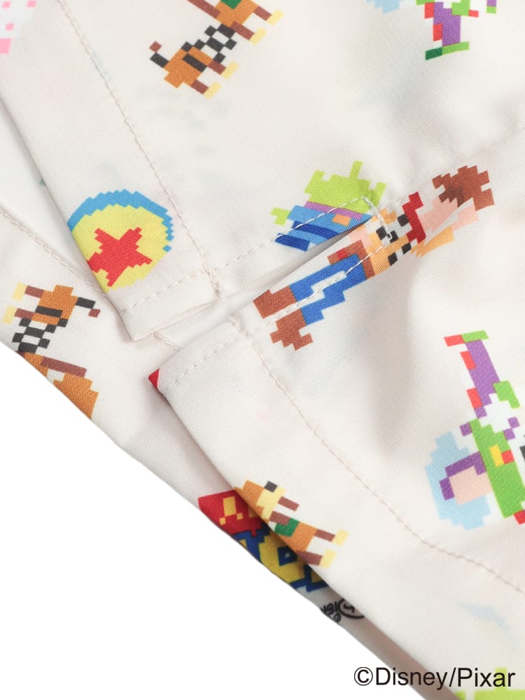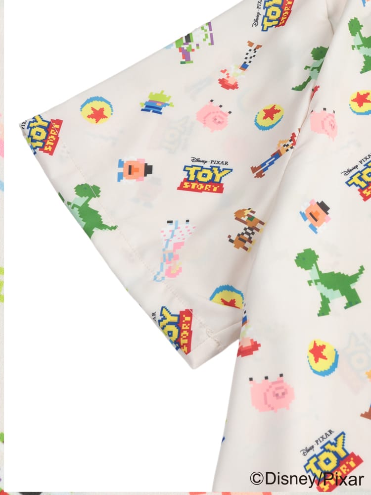 『ウッディ』『バズ・ライトイヤー』『ジェシー』『エイリアン』『レックス』『ハム』といったお馴染みのキャラクターたちを、レトロなゲーム画面のようなピクセルアートで表現。 ベージュをベースにした優しい色使いにより、多彩なキャラクターが散りばめられた総柄デザインながらも、柔らかな印象で着こなしやすい一着です。