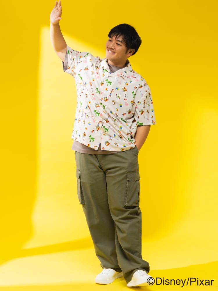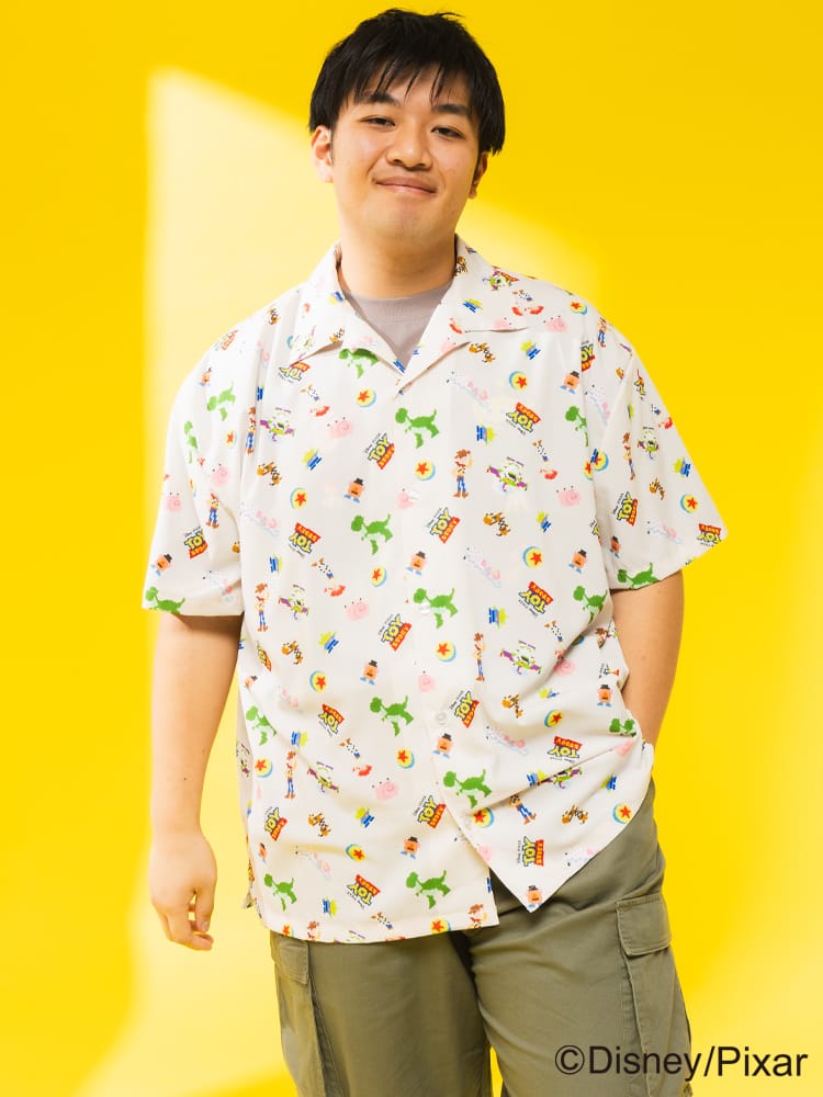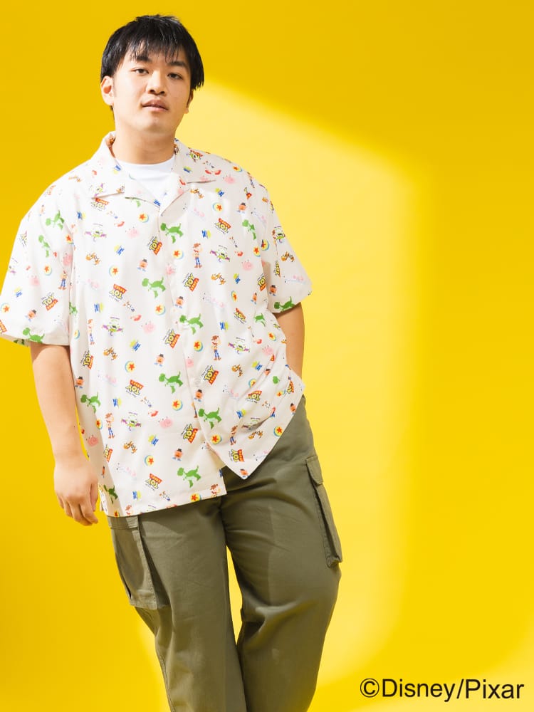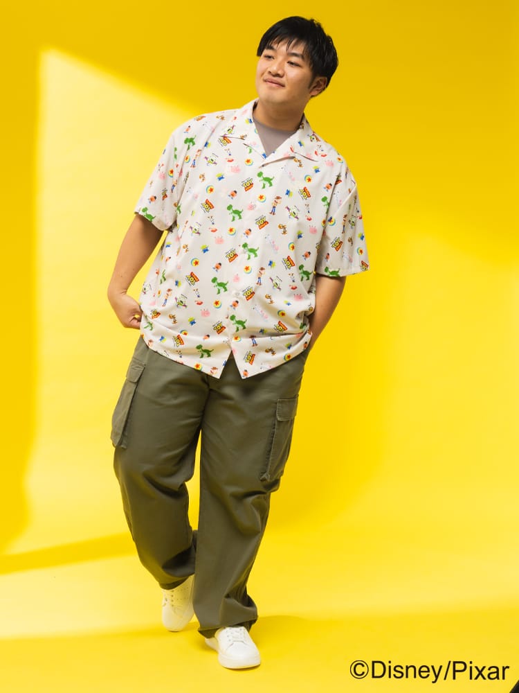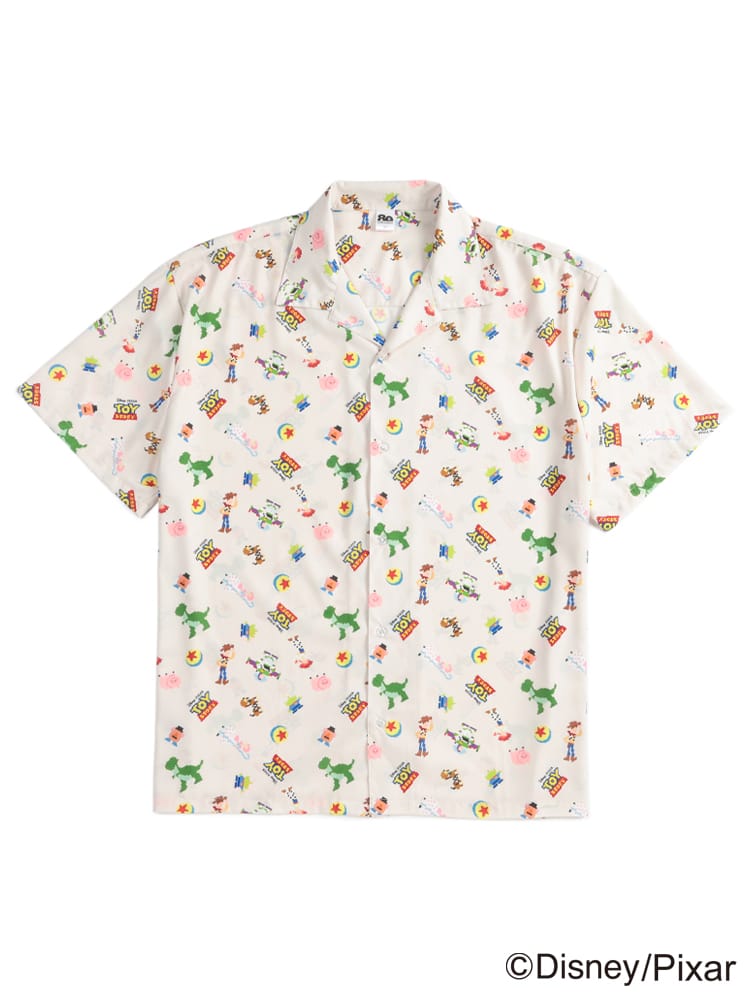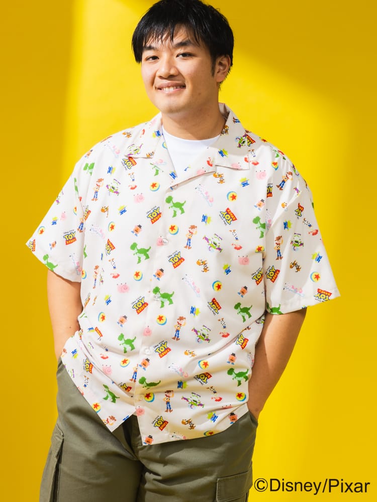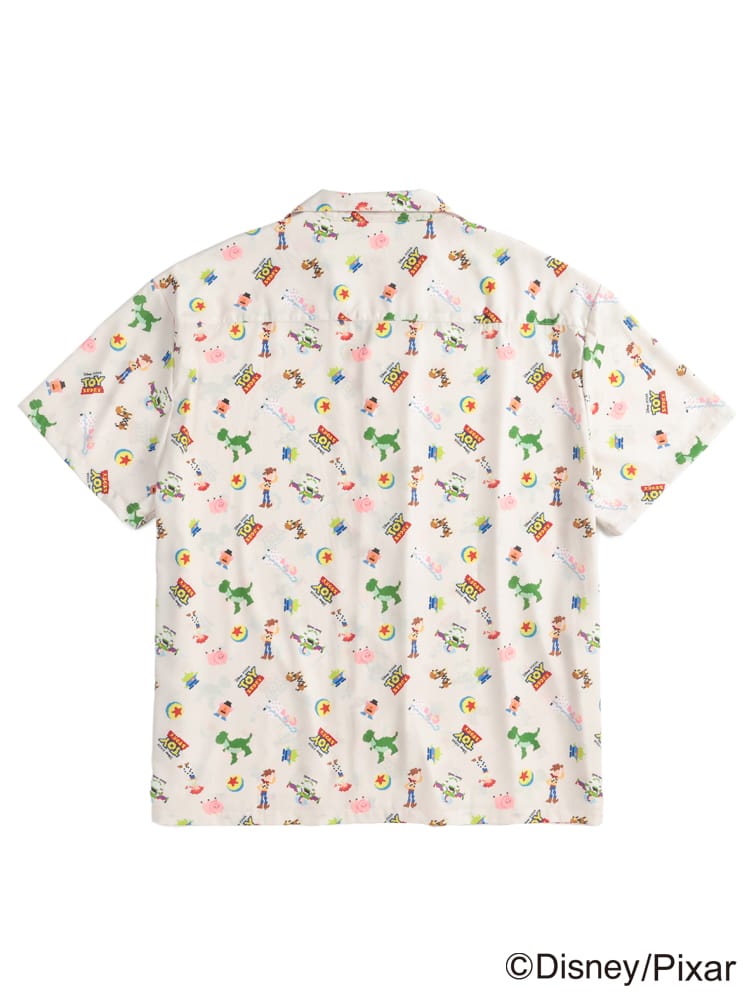 『ウッディ』『バズ・ライトイヤー』『ジェシー』『エイリアン』『レックス』『ハム』といったお馴染みのキャラクターたちを、レトロなゲーム画面のようなピクセルアートで表現。 ベージュをベースにした優しい色使いにより、多彩なキャラクターが散りばめられた総柄デザインながらも、柔らかな印象で着こなしやすい一着です。